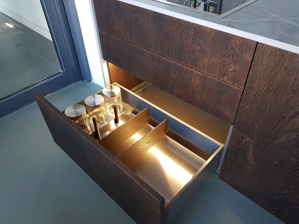 Внутреннее наполнение: встраиваемая вытяжка FABER, вкладыш для столовых приборов для кассеты на 90 см (шпон/нерж.сталь), вкладыш включающий емкости для хранения сыпучих продуктов и разделители внутреннего пространства (шпон / нерж.сталь/стекло)