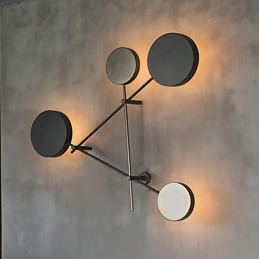 Настенный светильник IRIDE от итальянского бренда Arketipo – это скульптура из линий и кругов, материал, чрезвычайно геометрический и с сильным визуальным эффектом, который напоминает картины Кандинского. Диск рассеивает светящийся ореол, похожий на многочисленные затмения. Диски, имитирующие плафоны, выполнены из металла цвета коричневой слюды, один из них - из титана. В бра встроено LED-освещение с диммером, благодаря чему с включенным светом диски напоминают лунное затмение.