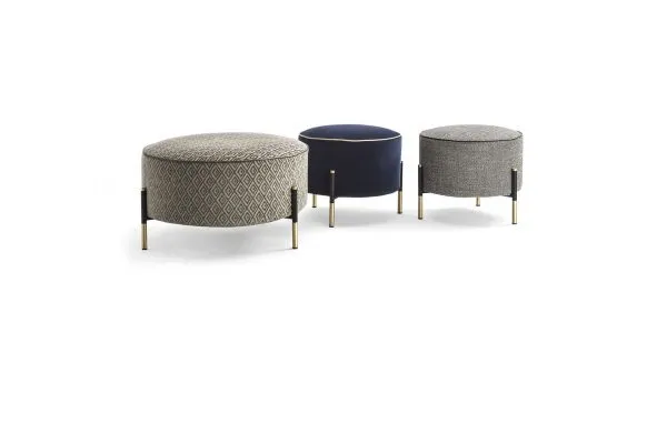 Коллекция Kevin обладает широким спектром возможностей как по размерам; так и по отделке. Каждый элемент тщательно разработан и продуман для достижения совершенства в каждой детали. Круглые пуфы опираются на черные лакированные тонкие ножки с латунными деталями.