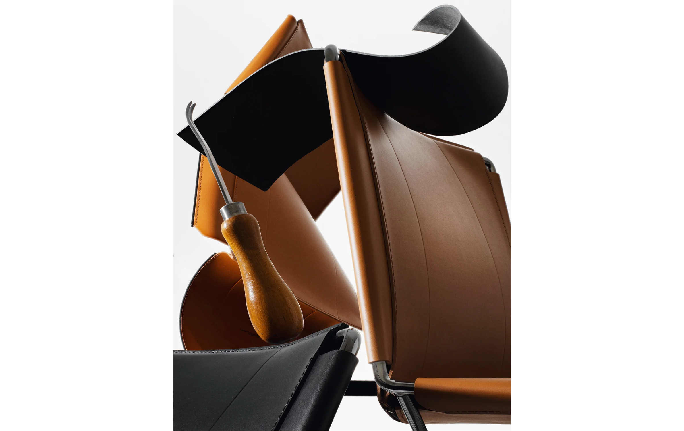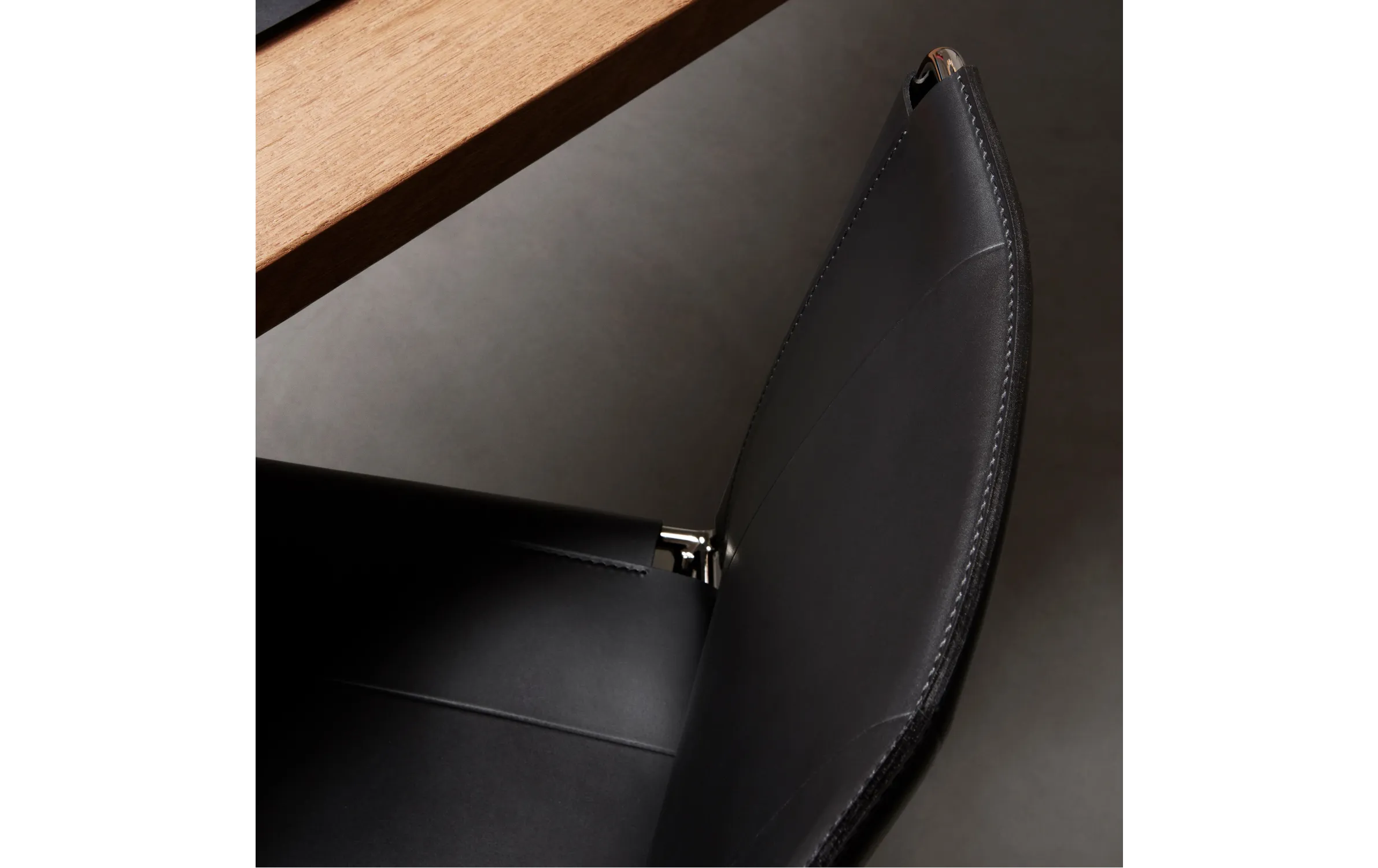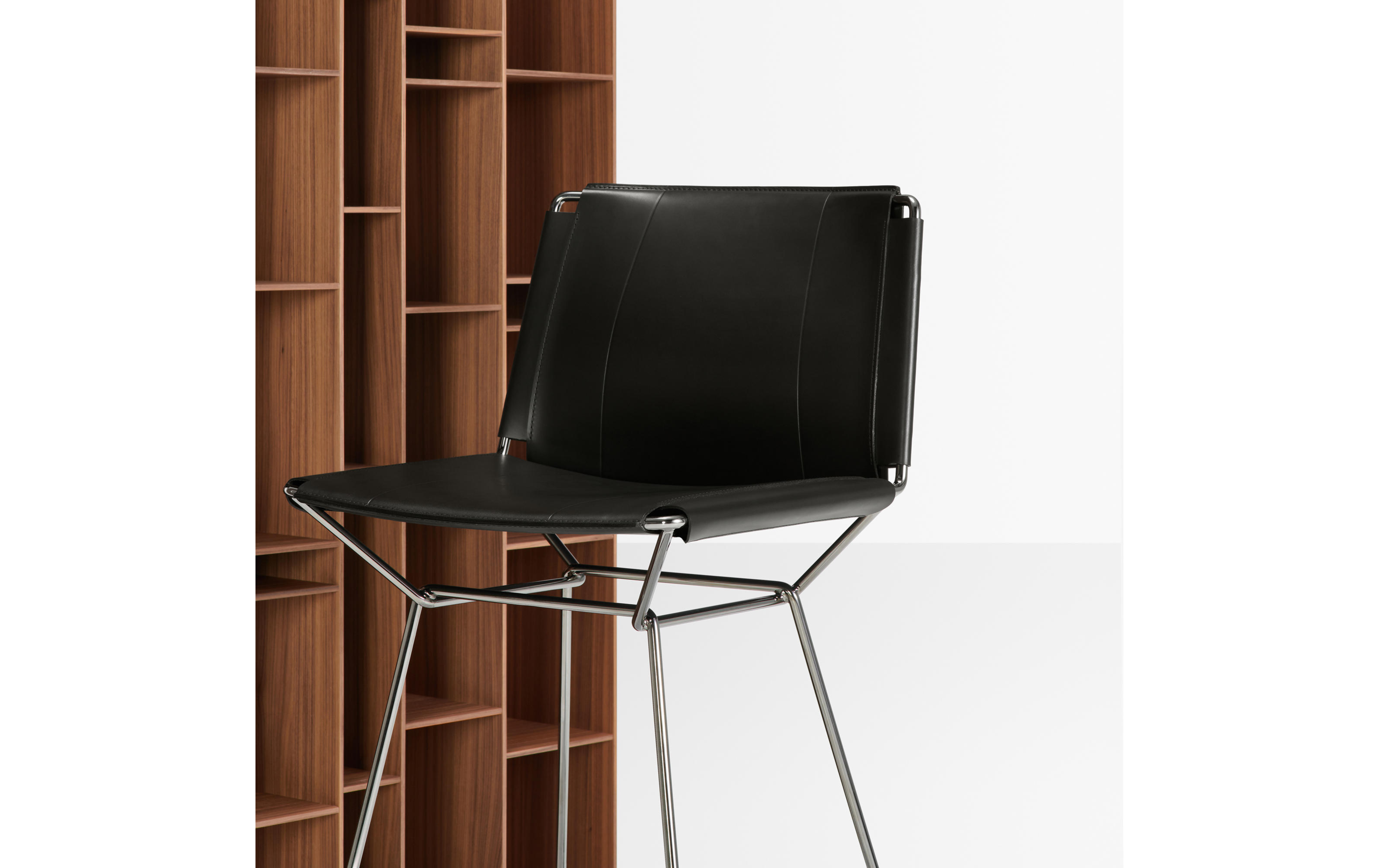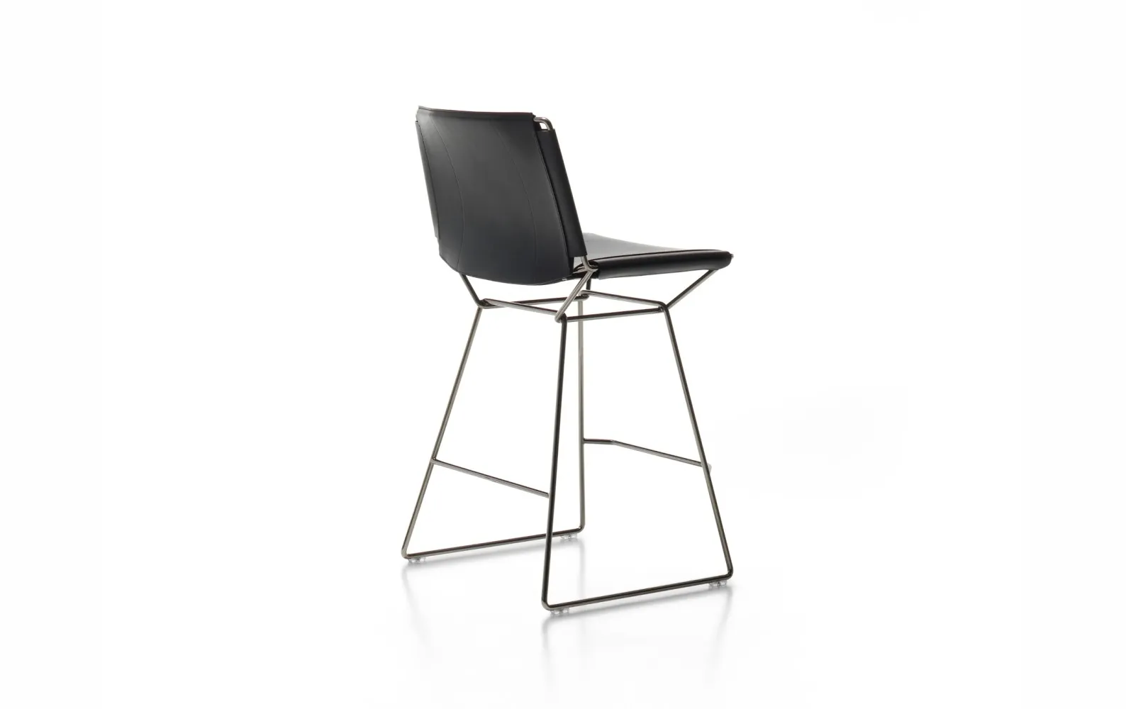 Каркас: хромированный металл. Отделка: черная седельная кожа.