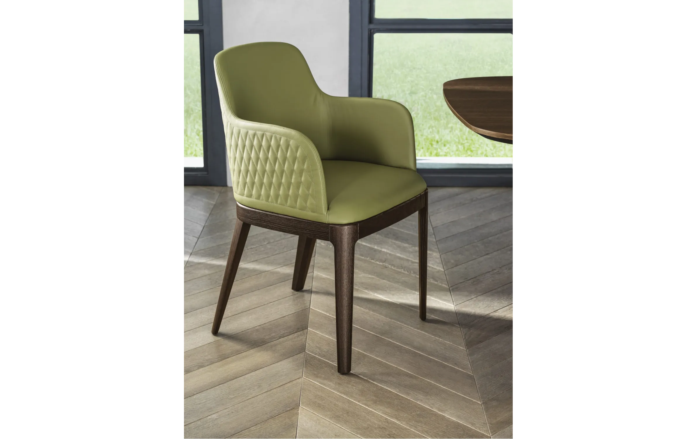 Коллекция стульев Margot в версиях с подлокотниками или без подлокотников. Каркас – массив дерева или сталь. Мягкое монолитное сиденье с обивкой из ткани, кожи или экокожи. Можно заказать стул с прошивкой на спинке (доступно в обивке из нубука, экокожи или кожи премиум). Стул с основанием из массива дерева, мягким монолитным сидением в обивке из экокожи, экологическая кожа премиум, технический бархат, ткани Mambo и Lulù, водонепроницаемого нубука, принта водонепроницаемого нубука, чистой шерсти, бархата и кожи премиум. Стул доступен в версии с прошивкой на спинке (только в обивке из водонепроницаемого нубука, экокожи и кожи премиум).