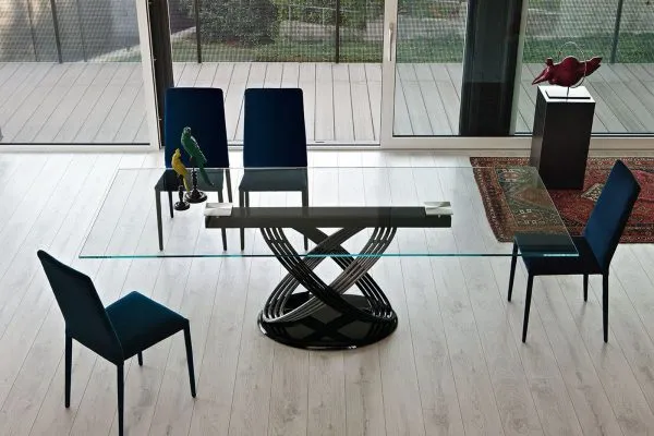 Стол стационарный или раскладной со структурой в форме колец из лакированной стали. Основание из лакированной стали; шпонированного дерева или СуперМрамора. Столешница из массива дерева; массива вековой древесины; шпона с краями из массива; шпона; стекла; стекла; устойчивого к царапинам; натурального мрамора; СуперМрамора и СуперКерамики.