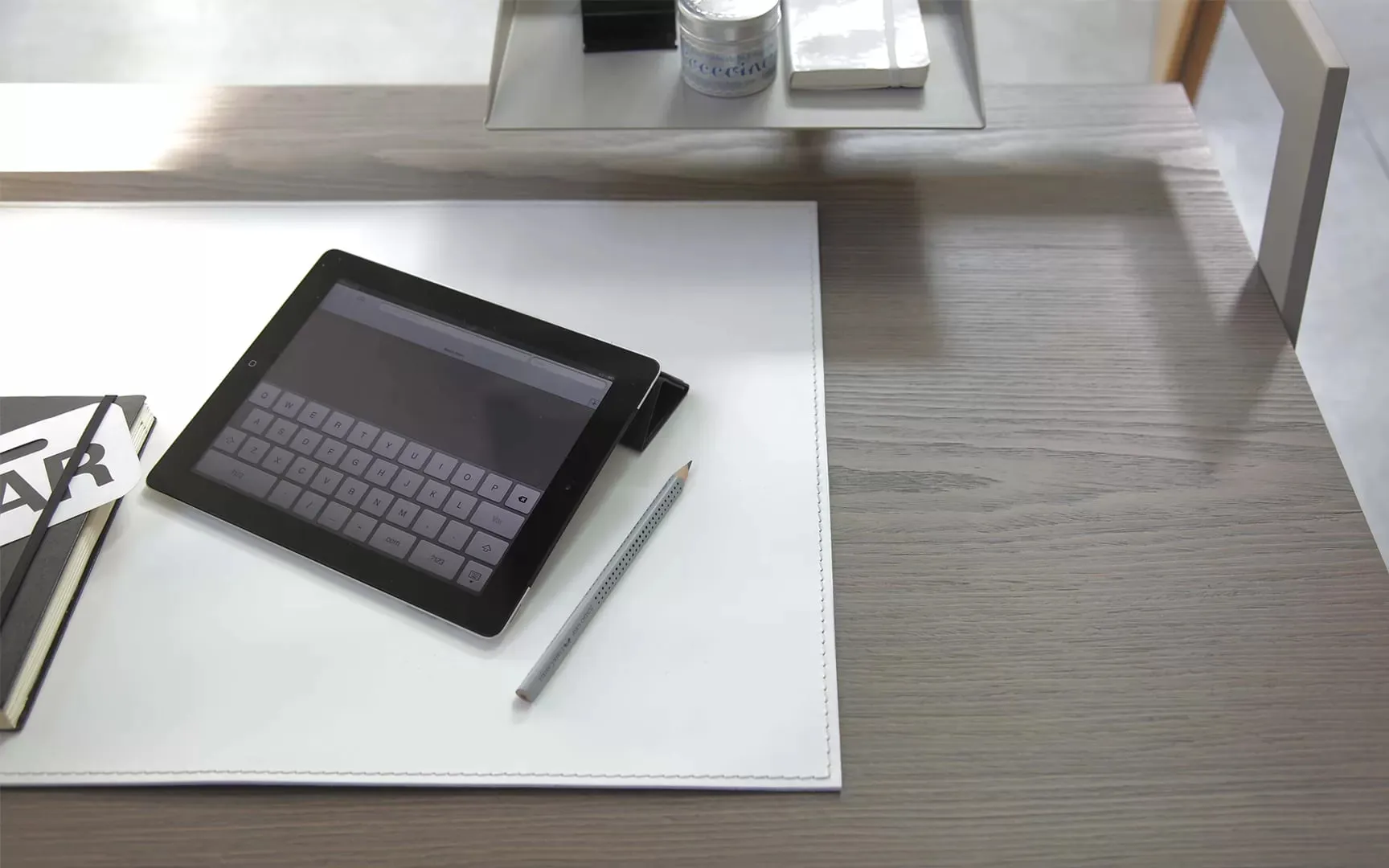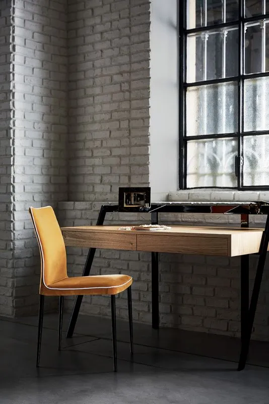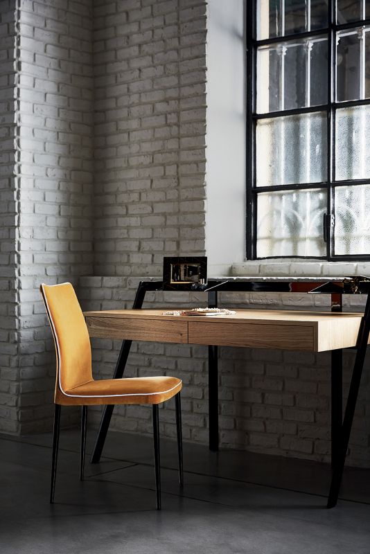 Zac – письменный стол для домашнего кабинета от Bontempi Casa. Каркас – лакированная сталь, 2 лотка для письменных принадлежностей, 2 выдвижных ящика. Отделка столешницы – шпон (натуральный дуб, мореный дуб spessart или вяз). Для стола можно заказать коврик из выделанной кожи с декоративной строчкой (контрастной или в тон кожи).