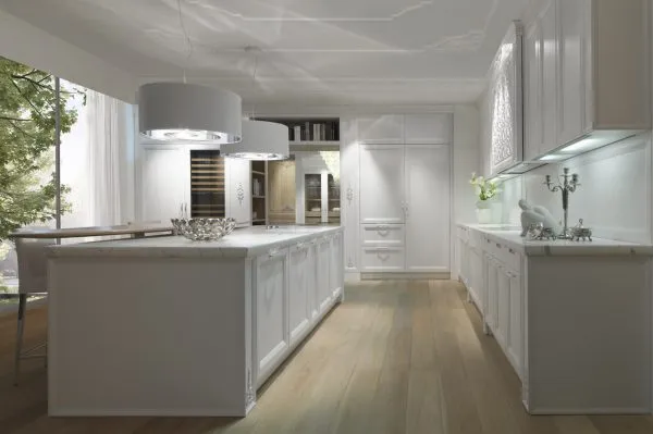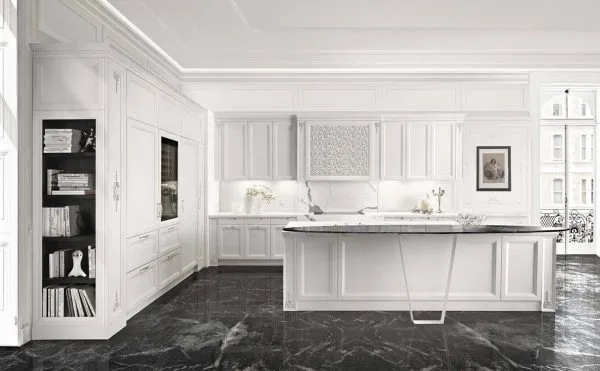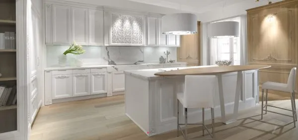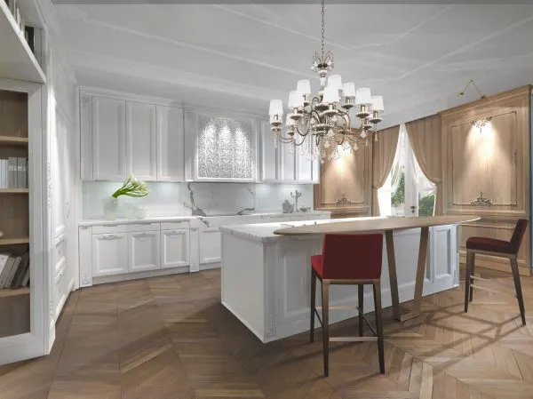 Кухня Princess оснащена структурной мраморной столешницей белоснежного оттенка. Ее шелковистая поверхность дарить приятные тактильные ощущения. Гармоничное дополнение столешницы составляют панели буазери; покрытые маслом. Деликатная обработка позволяет подчеркнуть фактуру натурального дерева.
