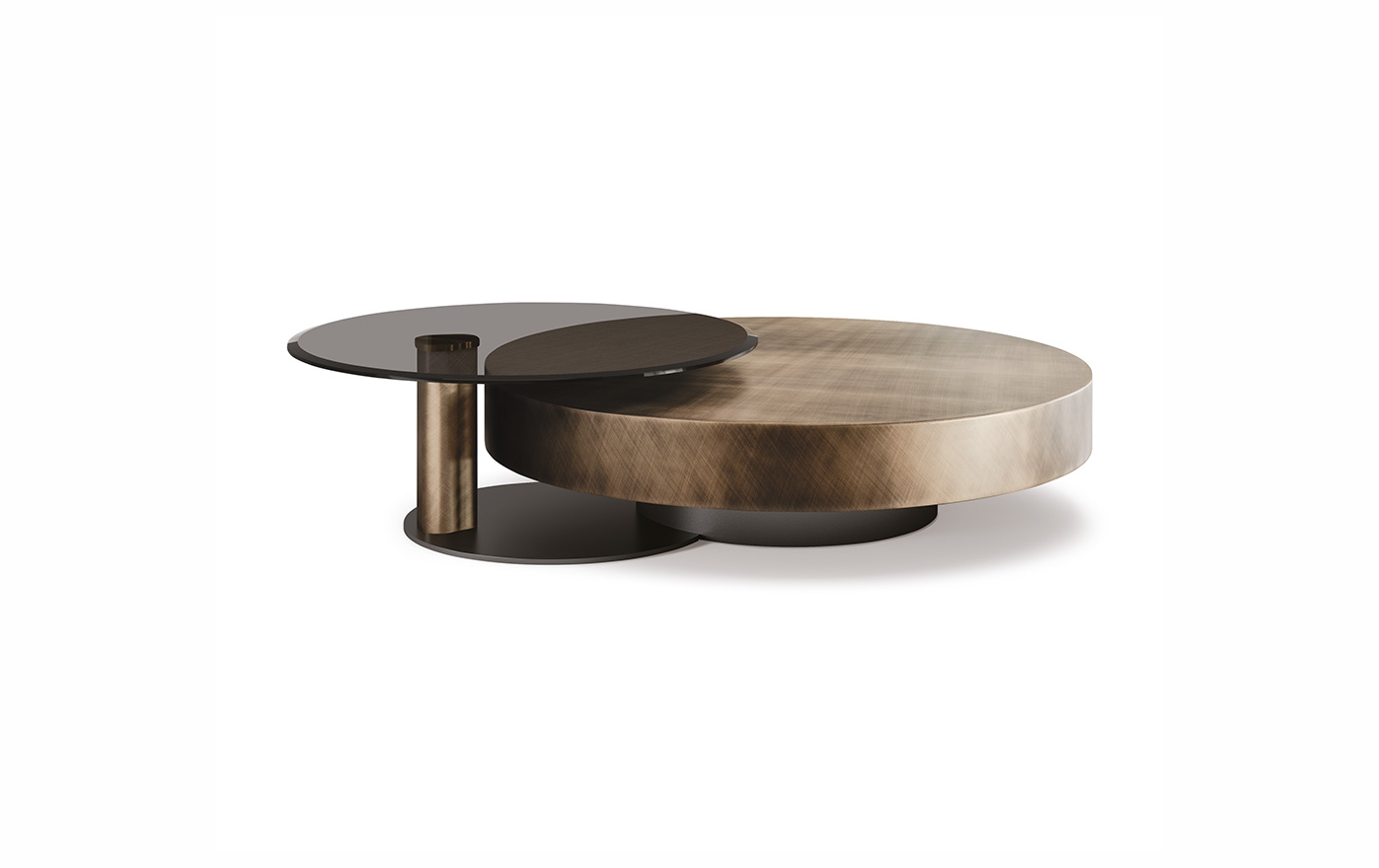 Журнальный столик с базой из стали, окрашенной в черный (GFM73) и со столешницей из дерева, окрашенной в Brushed Bronze или Brushed Grey. В версиях BOND и DOUBLE BOND к основному столу примыкают один или два журнальных столика с круглым основанием (базой) из стали, окрашенной в гофрированный черный (GFM73), а также вертикальной стальной ножкой цилиндрической формы, окрашенной в Brushed Bronze или Brushed Grey и с вращающейся стеклянной столешницей с фацетом.