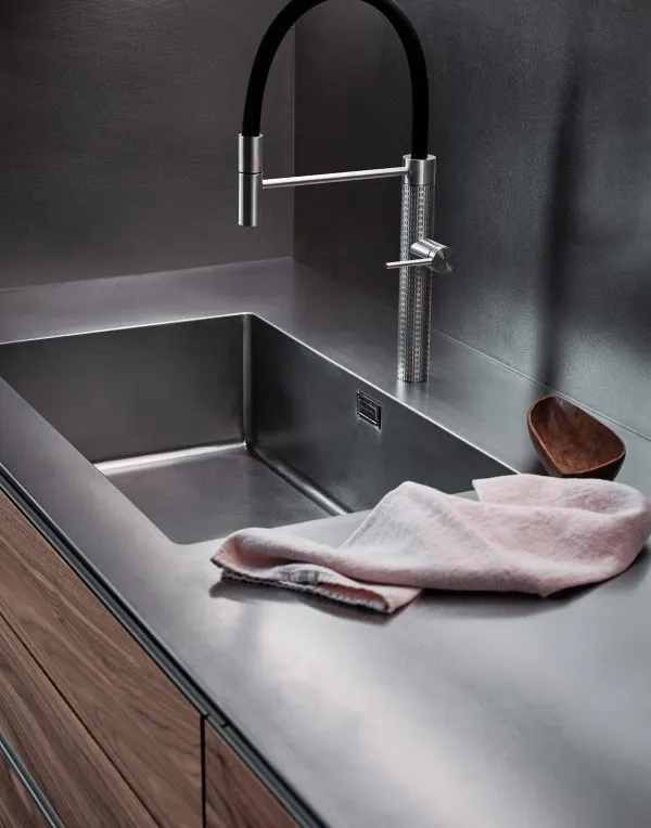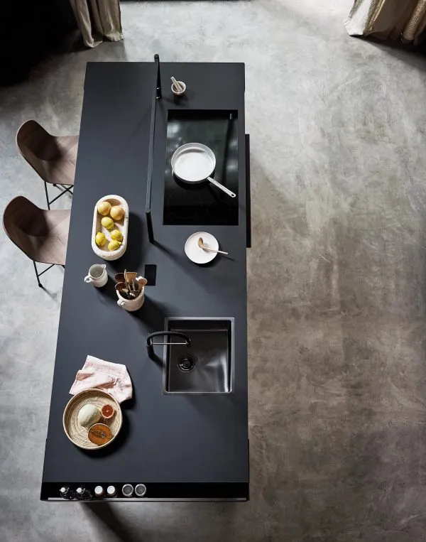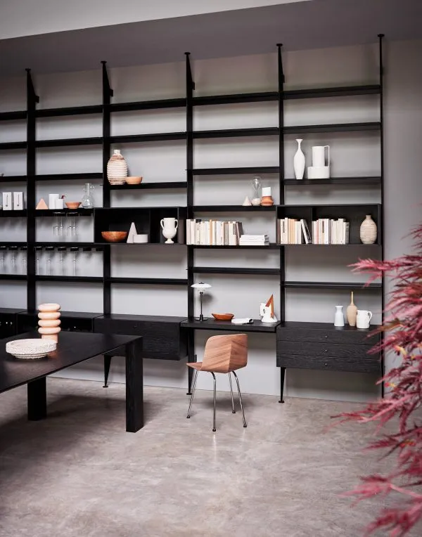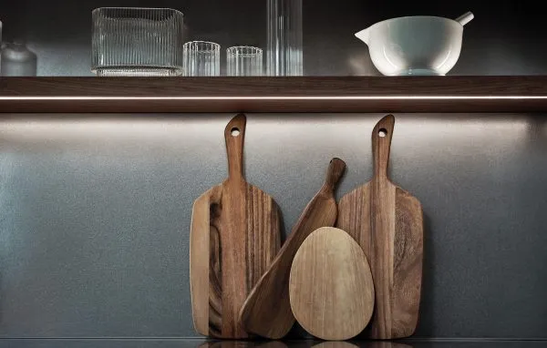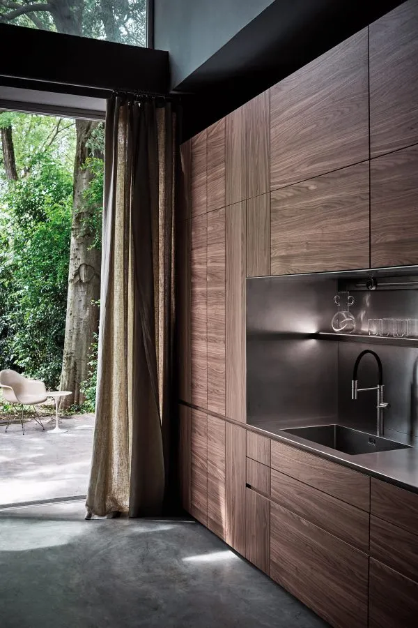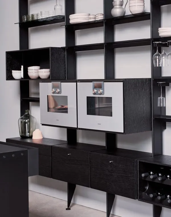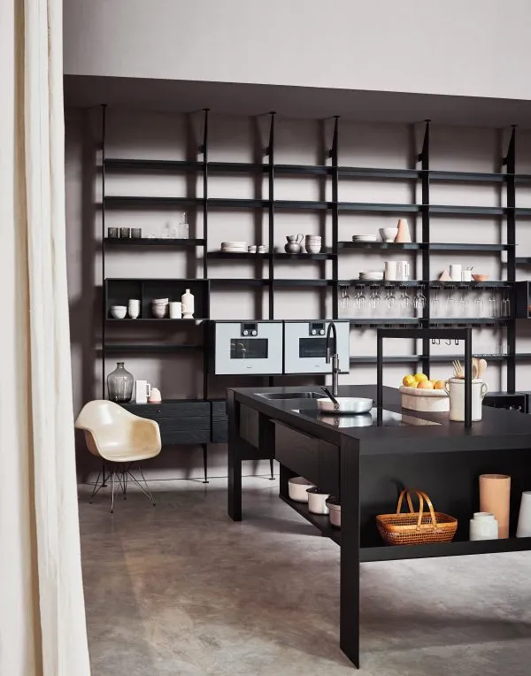 Новинка фабрики Cesar! Кухня Intarsio Time bridge; выполнена в орехе Desaturato Intarsio; с ручкой Tratto в отделке черный алюминий. Столовая зона в брашированном дубе Corvino. Стеллажи «The 50’s» для гостиной со встроенной подсветкой; с полками из дымчатого стекла.