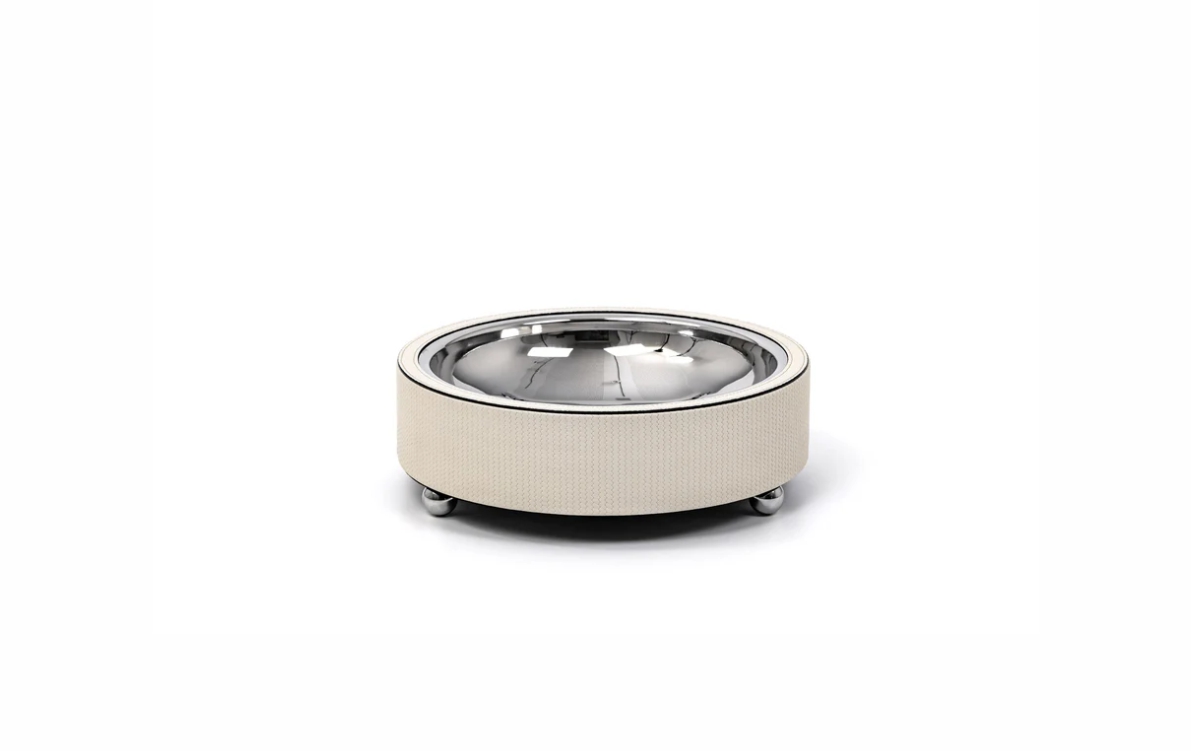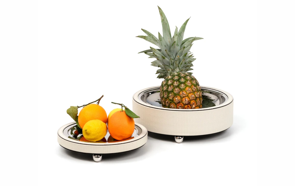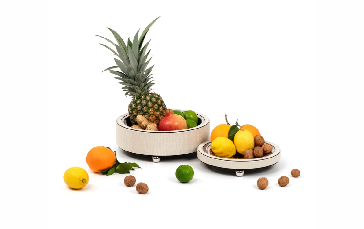 Zoe — новая линейка подставок для фруктов, представленная в трех размерах. Подставки с деревянной структурой и украшенные роскошной кожей, каждый предмет имеет гладкую чашу из нержавеющей стали, которую можно легко снять, что очень упрощает уход за ней. Ножки с латунным покрытием добавляют нотку элегантности, обеспечивая устойчивость и изысканный стиль вашему столу.