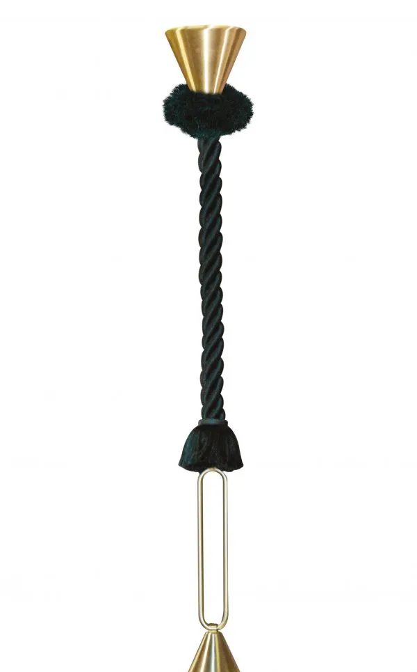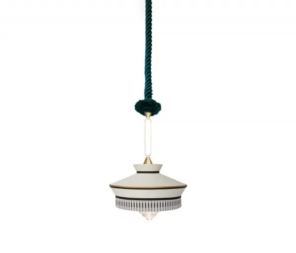 Calypso – это коллекция подвесных светильников; вдохновленная периодом ар-деко; с тканями; текстуры которых и белые и черные геометрические узоры сочетаются с яркими цветами южноамериканской и тропической культуры; обеспечивая очень оригинальный результат. Для внутренней версии характерна плетеная шелковая веревка зеленого цвета. Металлическая опора – кольцо с отделкой из атласной латуни. Лампа из прозрачного стекла.