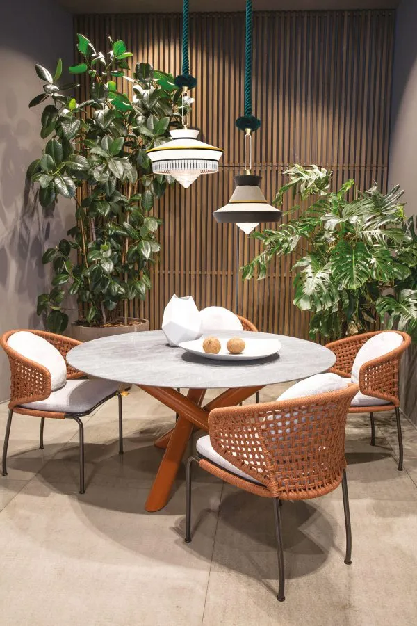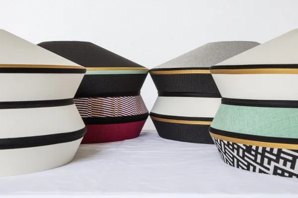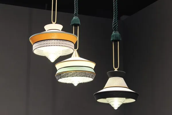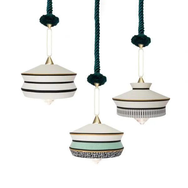 Calypso – это коллекция подвесных светильников; вдохновленная периодом ар-деко; с тканями; текстуры которых и белые и черные геометрические узоры сочетаются с яркими цветами южноамериканской и тропической культуры; обеспечивая очень оригинальный результат. Для внутренней версии характерна плетеная шелковая веревка зеленого цвета. Металлическая опора – кольцо с отделкой из атласной латуни. Лампа из прозрачного стекла.
