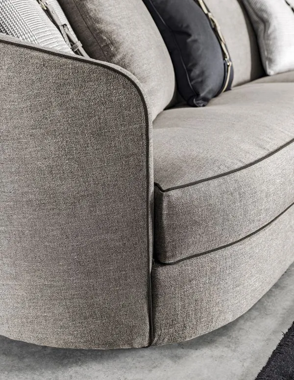 Основание из дерева; покрытое полиуретаном разной плотности со слоями дакрона и тонкого бархата из нейлонового волокна. Подушки сиденья из 100% гусиного пуха со вставкой в полиуретан дифференциальной плотности. Диван доступен в различных размерах и материалах; чтобы соответствовать любому настроению. Обивка съемная: кожа или ткань. Кант – цвета по образцу. Ножки – металл в отделке хром.