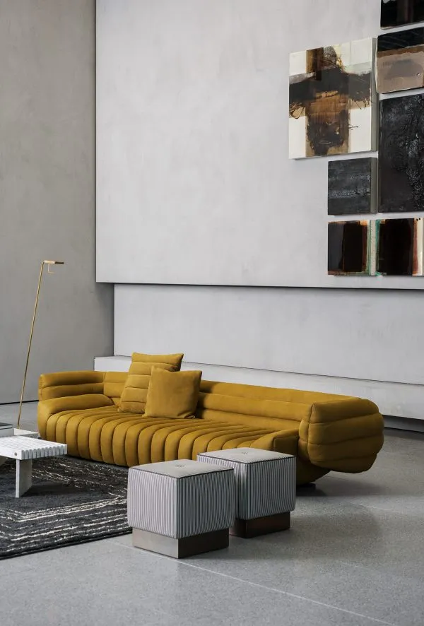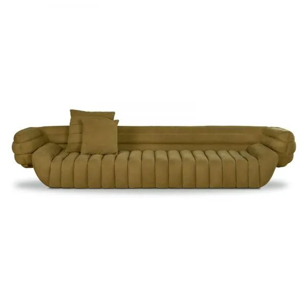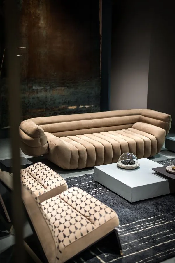 Диван в кожаной или текстильной отделке с обивкой вертикальными линиями.
