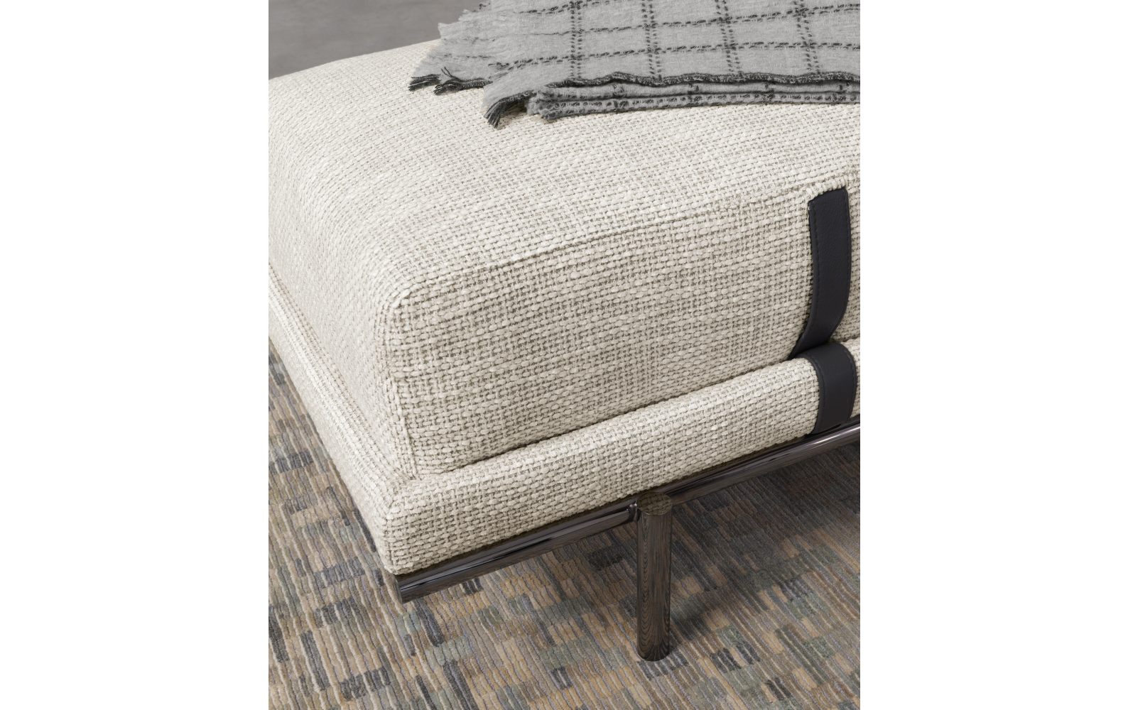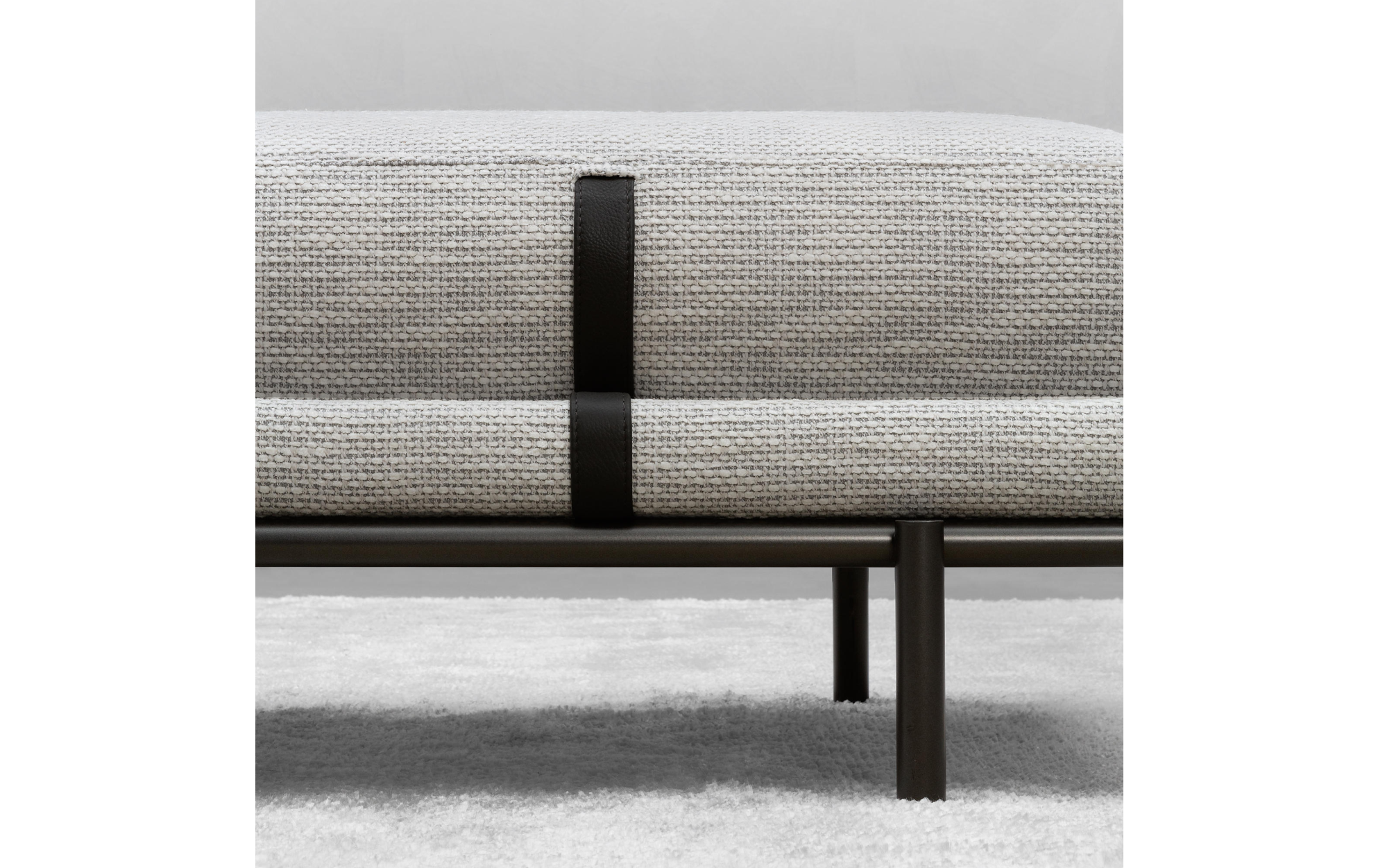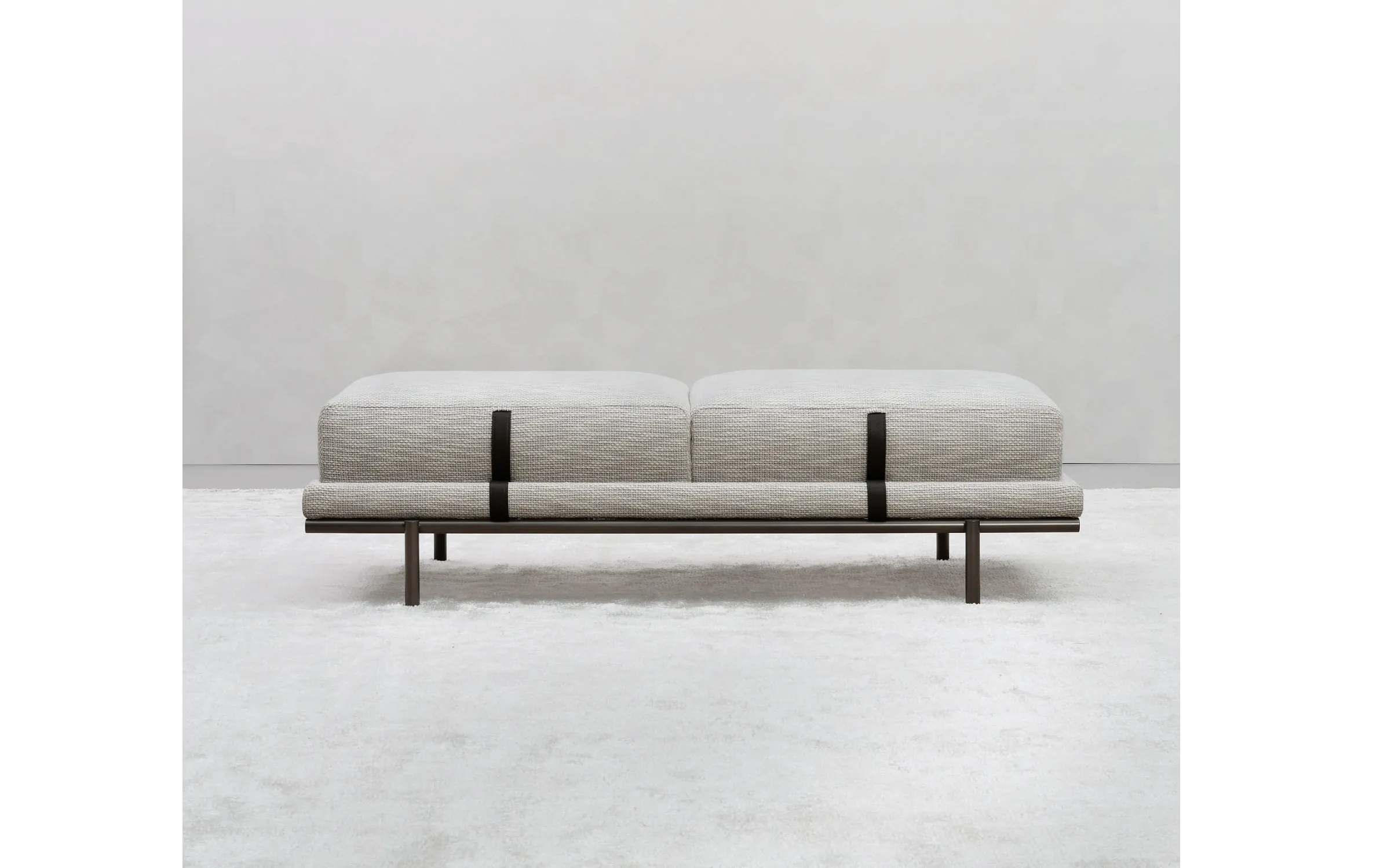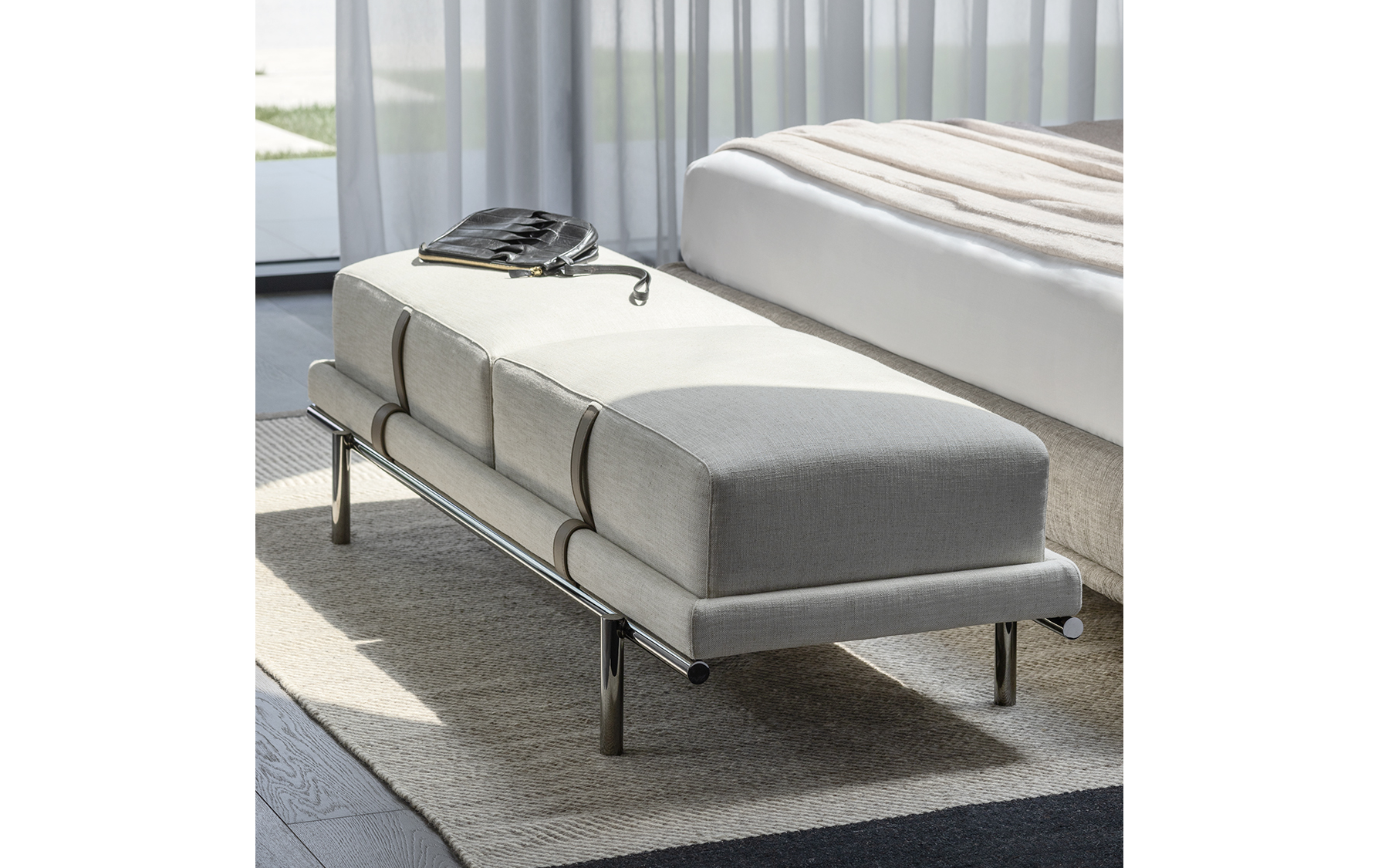 Банкетка Нью Бонд отражает отточенное годами фабричное производство по обработке кожи и ткани. Набивная структура фиксируется на цилиндрических металлических ножках, в отделке матовый или глянцевый черный никель, украшенная подушками с декоративной строчкой. Структура и подушки отдекорированы контрастными или “тон-в тон” кожаными ремнями, которые придают модели элегентность. Чехлы снимаются, изготовлены в коже или ткани. Мягкая банкетка с легкой металлической конструкцией, которая придает элегантный и изысканный характер любому интерьеру: как дополнительный элемент в гардеробной, у изножья кровати или в гостиной.