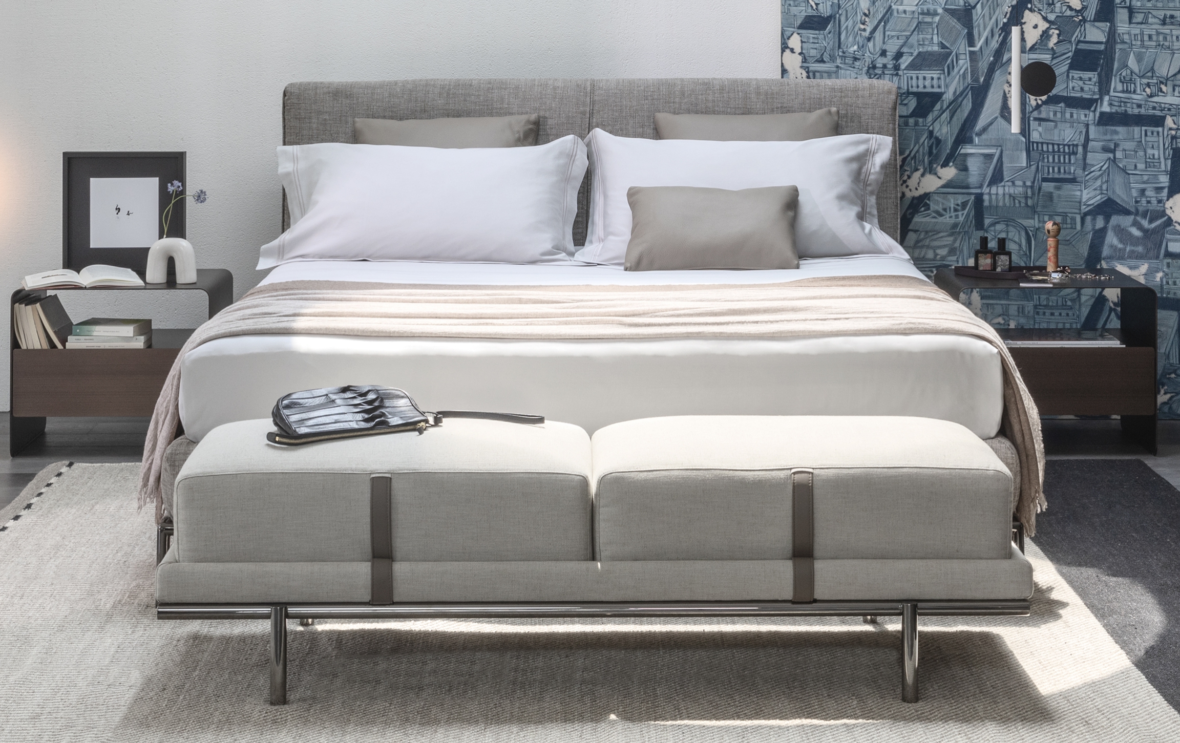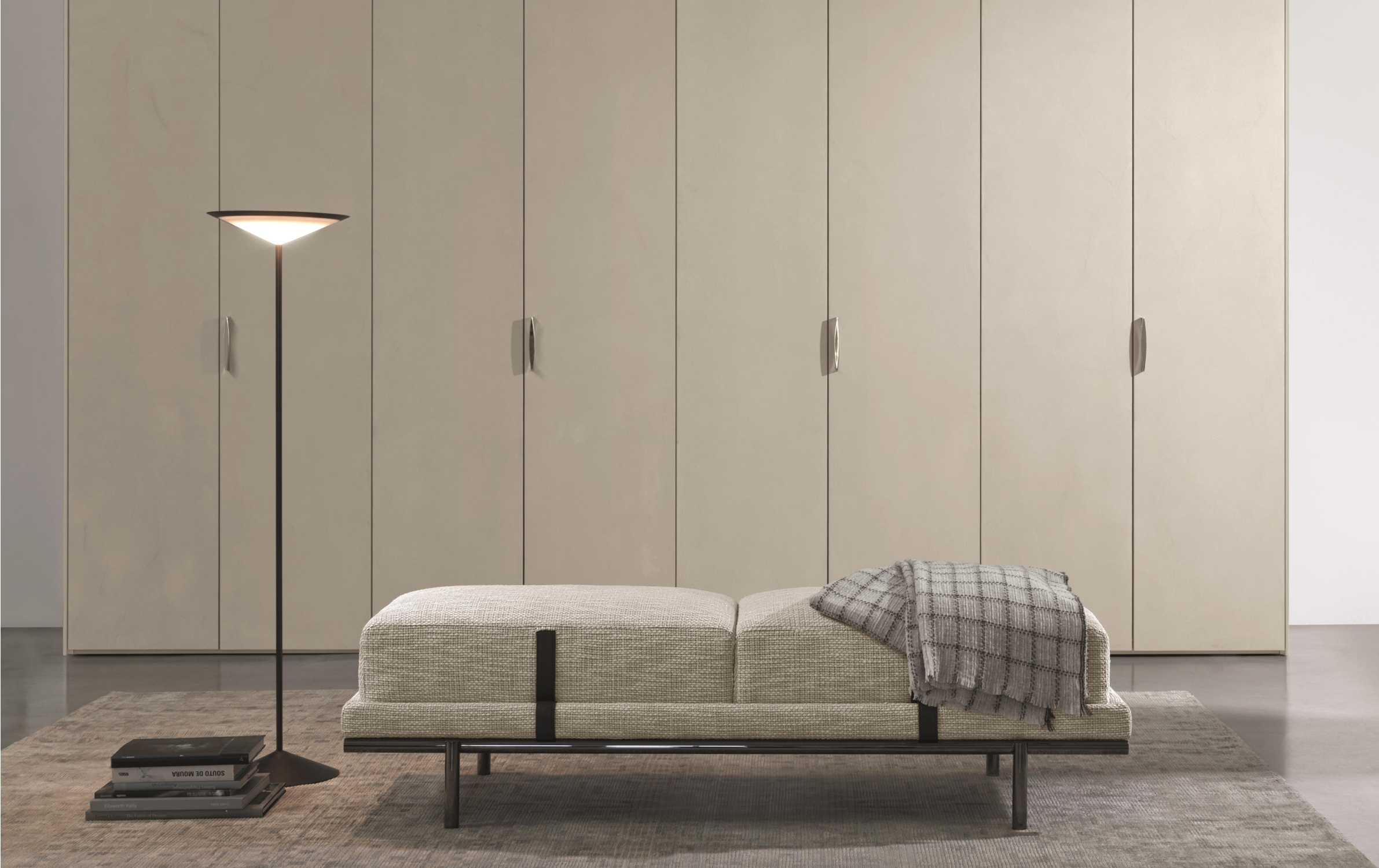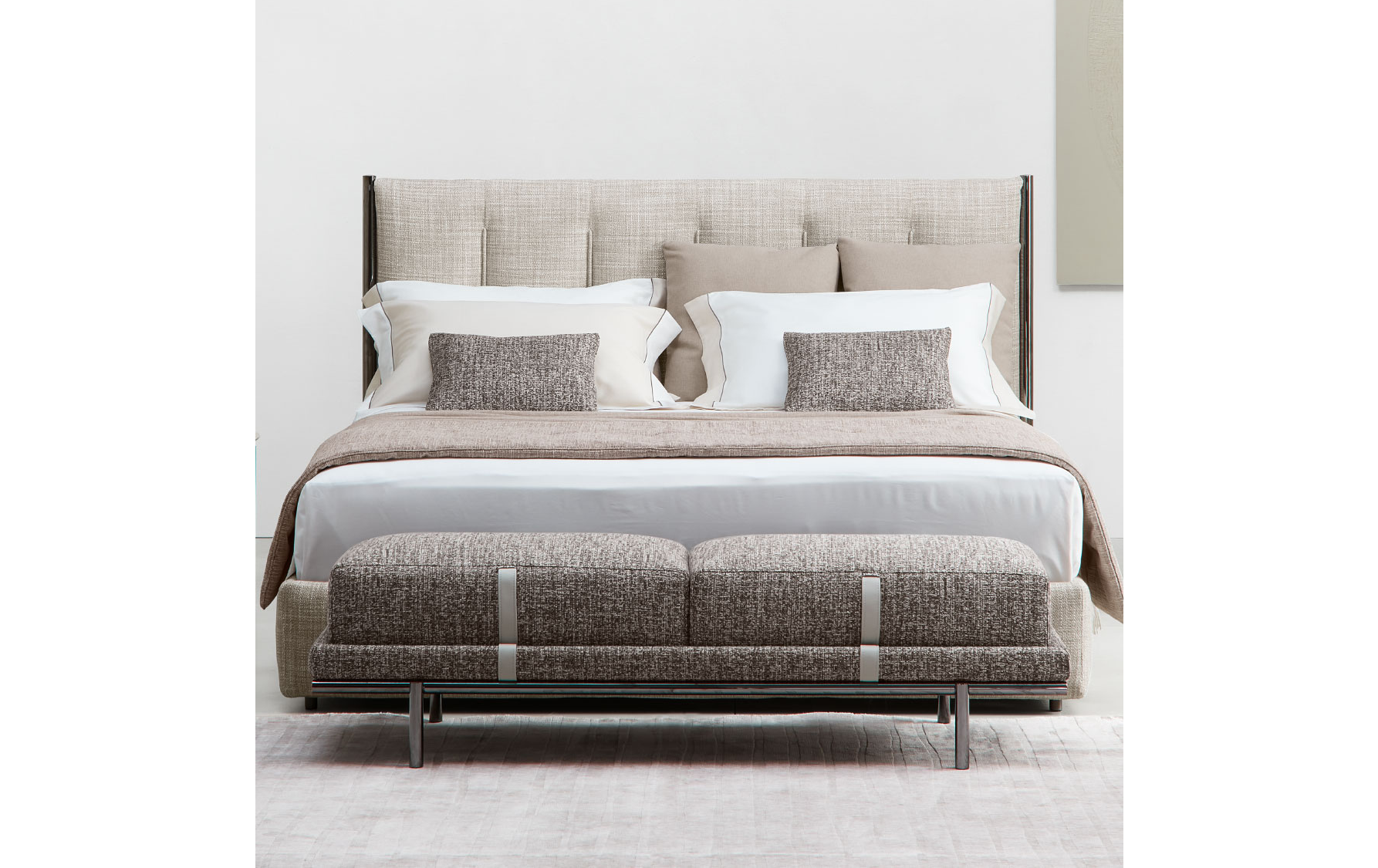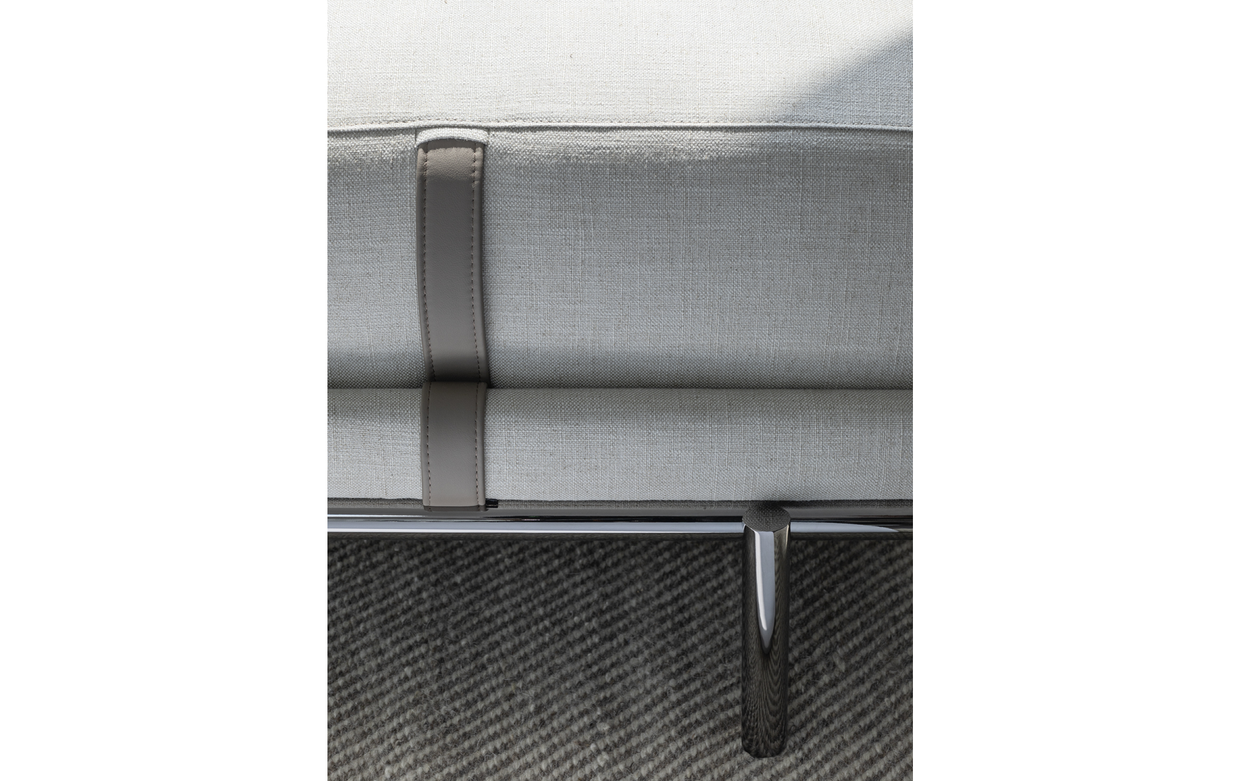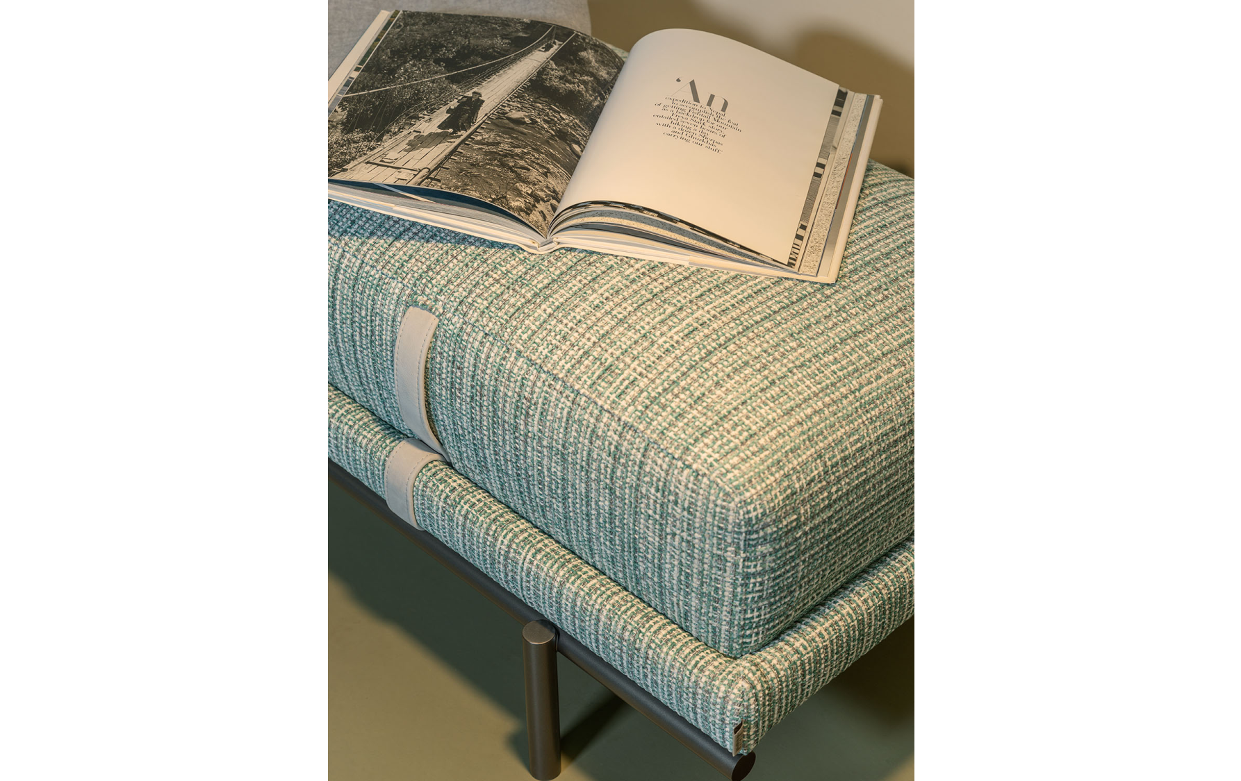 Банкетка Нью Бонд отражает отточенное годами фабричное производство по обработке кожи и ткани. Набивная структура фиксируется на цилиндрических металлических ножках, в отделке матовый или глянцевый черный никель, украшенная подушками с декоративной строчкой. Структура и подушки отдекорированы контрастными или “тон-в тон” кожаными ремнями, которые придают модели элегентность. Чехлы снимаются, изготовлены в коже или ткани. Мягкая банкетка с легкой металлической конструкцией, которая придает элегантный и изысканный характер любому интерьеру: как дополнительный элемент в гардеробной, у изножья кровати или в гостиной.