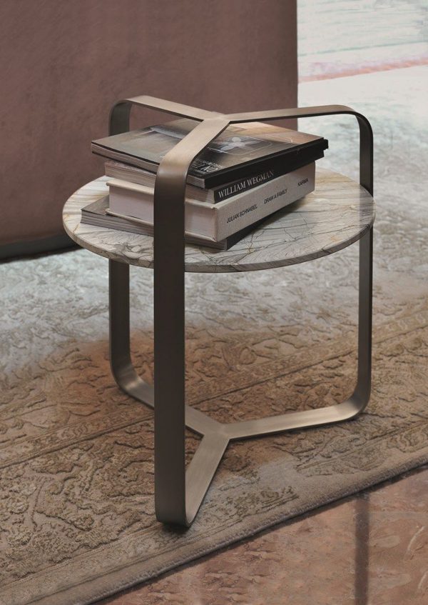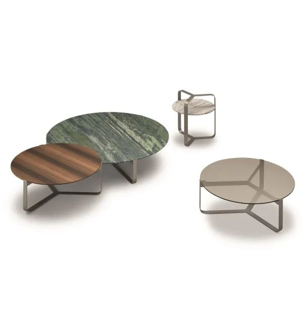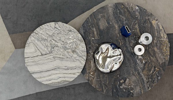 Серия круглых; очень декоративных столиков. Столешница из мрамора или бронзового стекла: неоднородные текстуры и материалы для изысканных и современных решений.