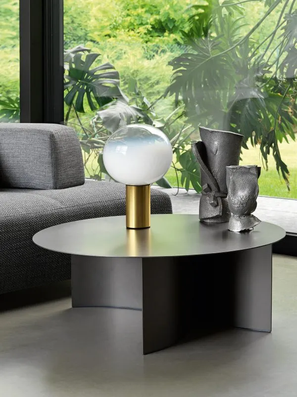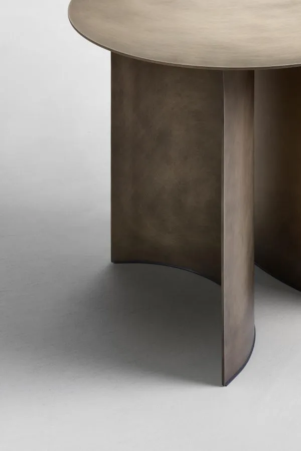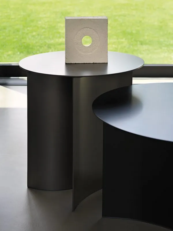 Материал основы и столешницы — металл. Широкие ножки столиков имеют специальные пластиковые накладки, предотвращающие повреждения напольного покрытия. Компактные столики круглой формы вы можете купить в 4 размерах и различных цветовых решениях. В зависимости от особенностей интерьера и личных предпочтений можно подобрать черную, белую, красную или серую отделку. Также в линейке представлены такие варианты отделки как вороненный металл, оксид, серо-бежевый и анодированная бронза.