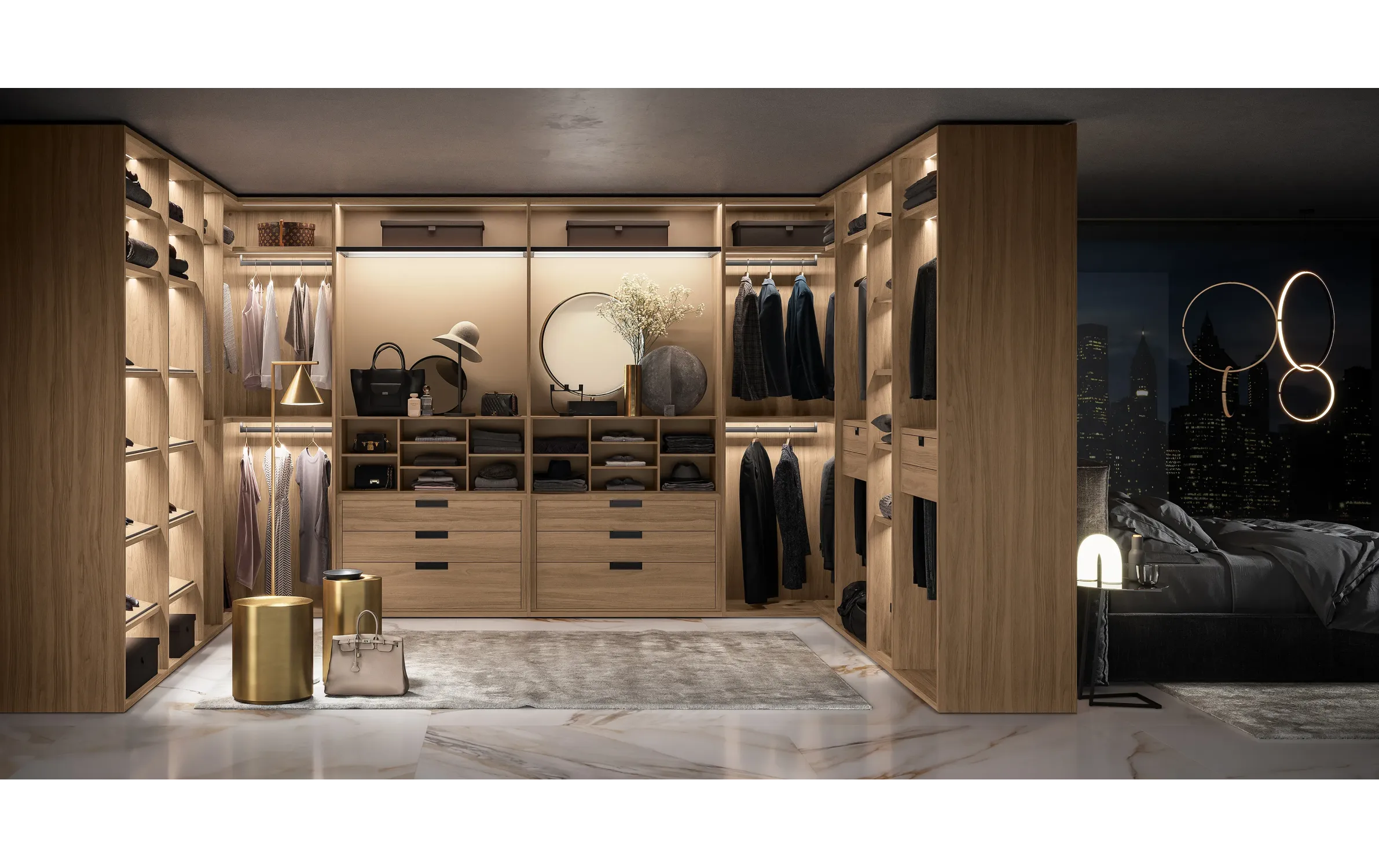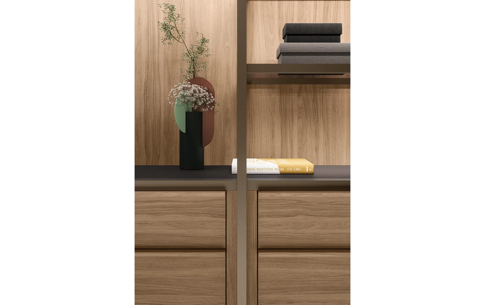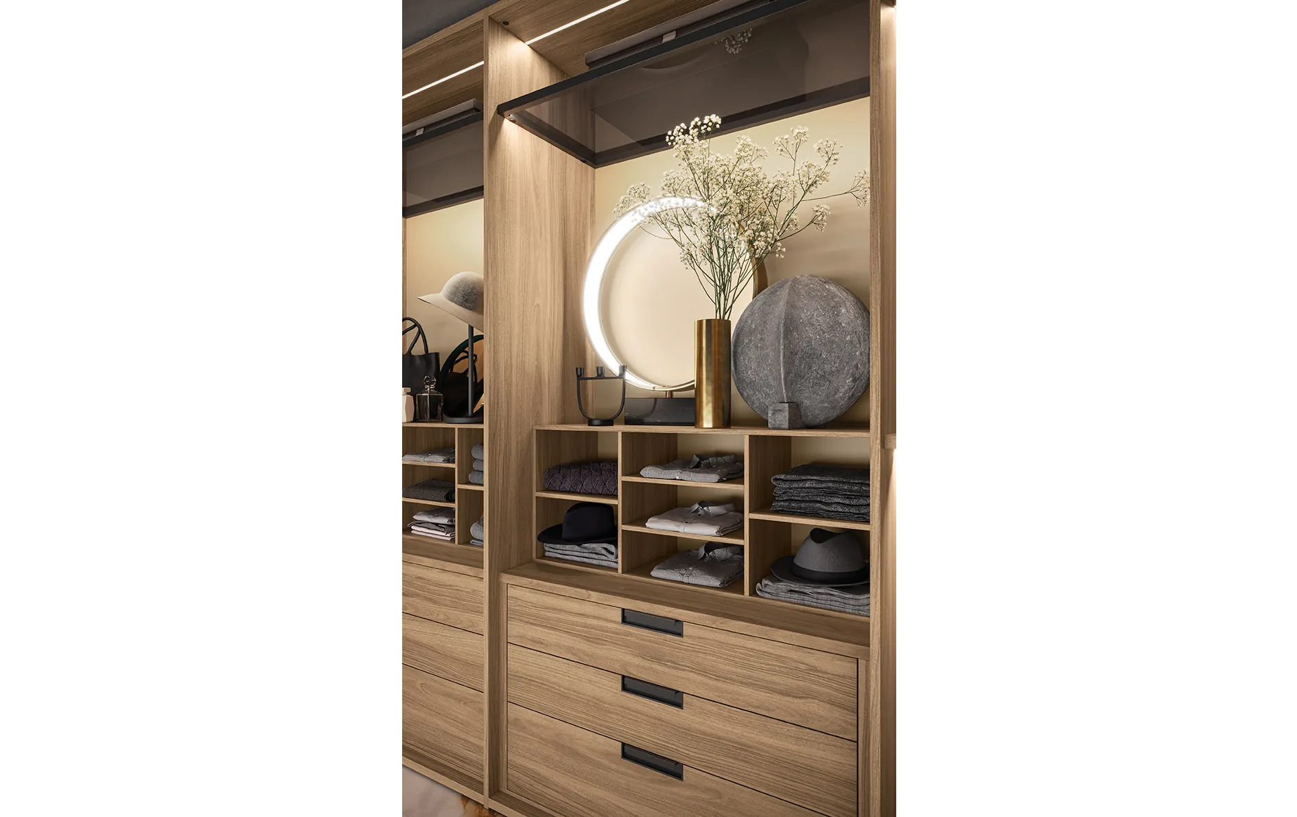 • Модульность и адаптивность: система позволяет конфигурировать различные элементы, такие как полки, ящики, вешала и аксессуары, обеспечивая максимальную гибкость в организации хранения.