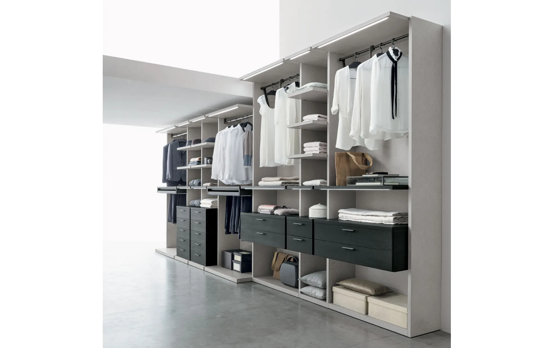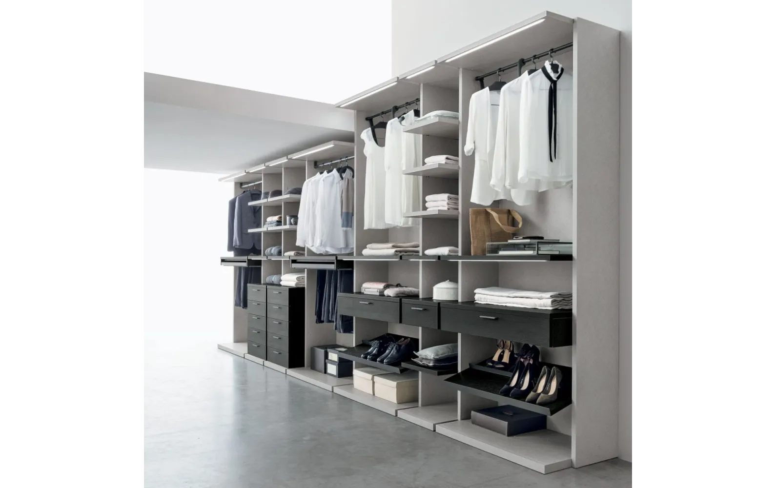 DOXA 203 — это модульная гардеробная система от итальянского бренда Tomasella, сочетающая в себе минималистичный дизайн и высокую функциональность. Её отличительной чертой являются открытые модули с уменьшенной глубиной боковых панелей, что придаёт конструкции визуальную лёгкость и современный вид.