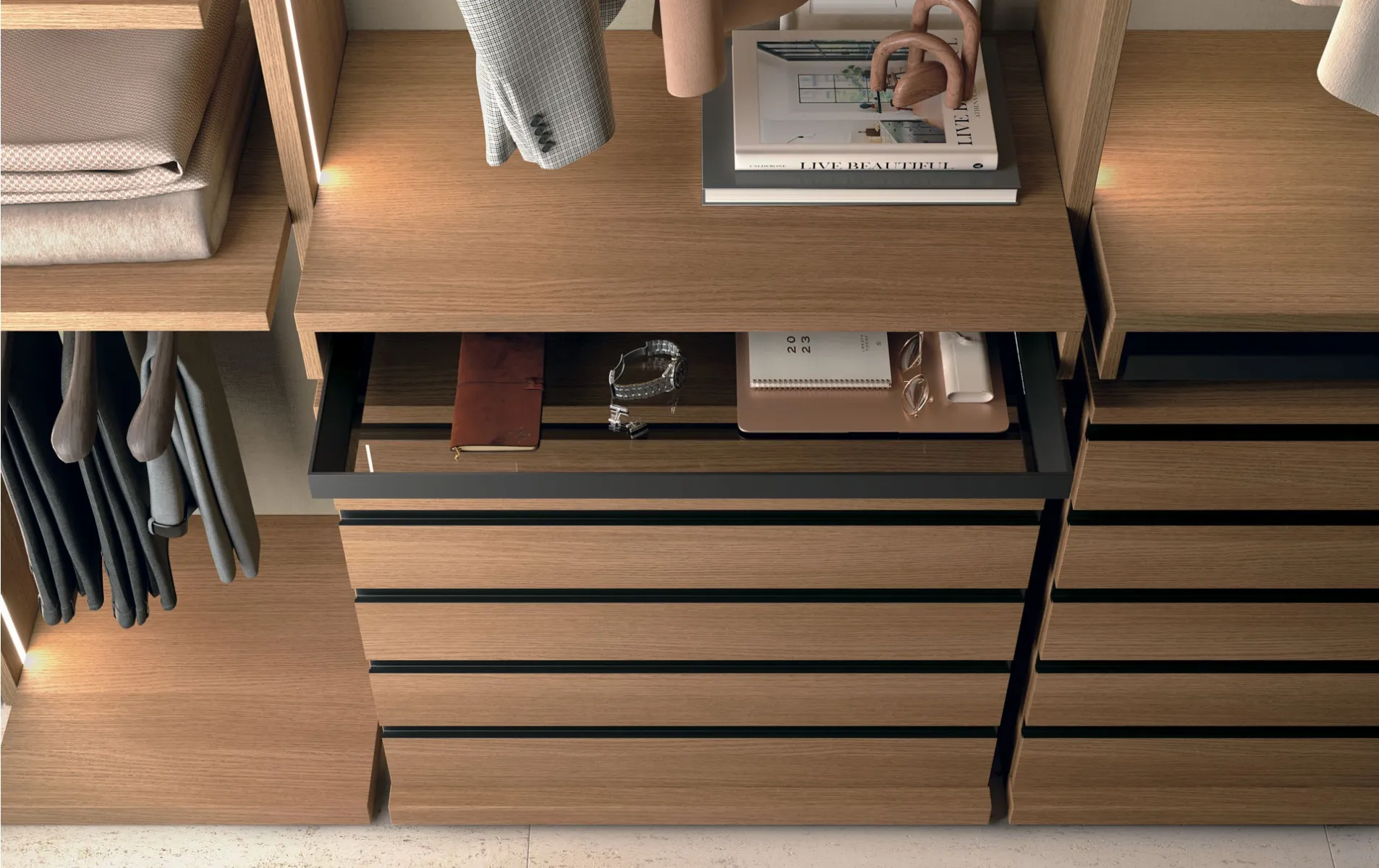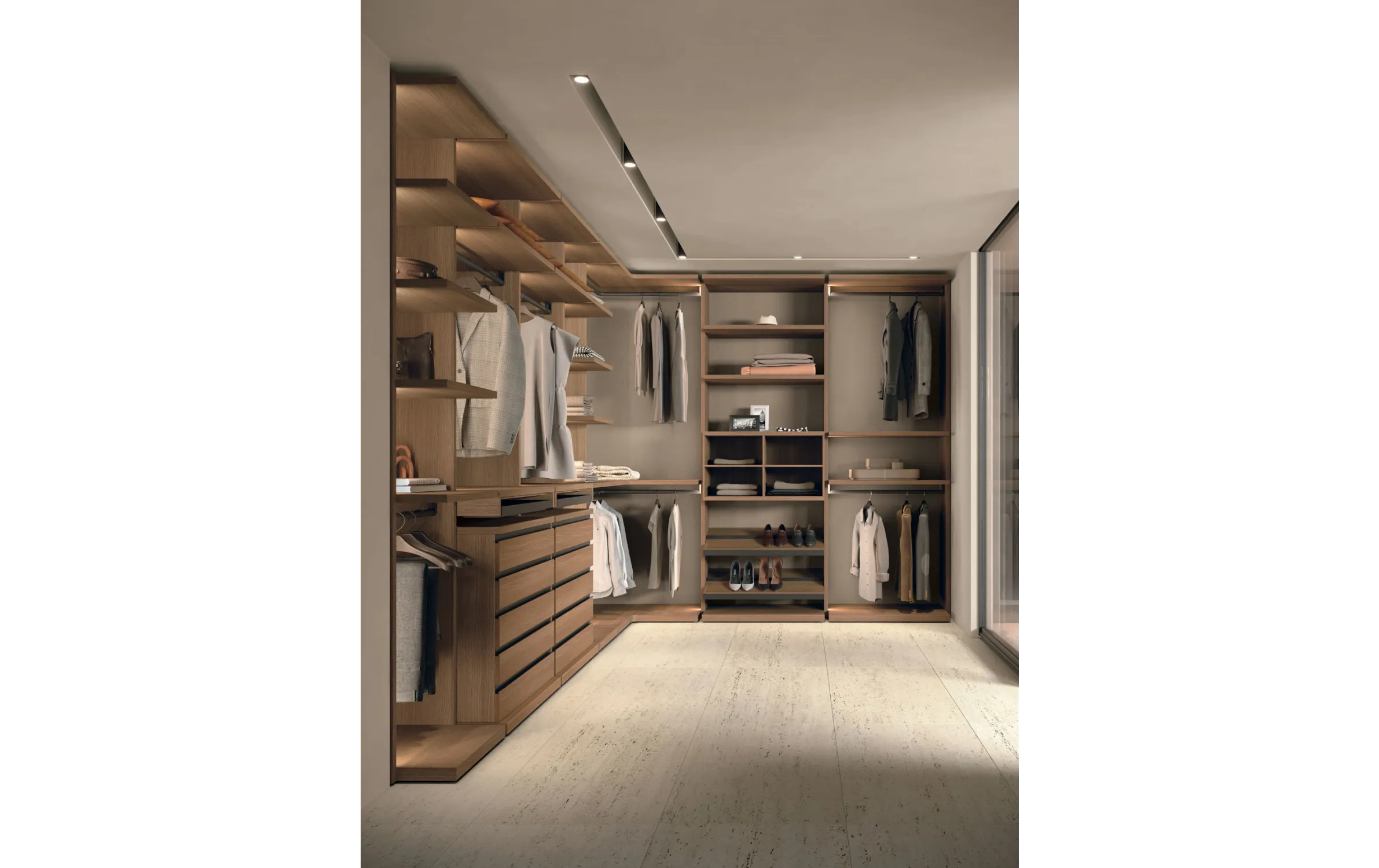 Система состоит из различных элементов: перегородок, полок, выдвижных ящиков и аксессуаров, которые можно комбинировать по вашему желанию, создавая индивидуальное решение для хранения одежды и аксессуаров. Возможность интеграции дополнительных элементов, таких как выдвижные лотки, обувные полки и зеркала, обеспечивает максимальный комфорт и удобство использования.