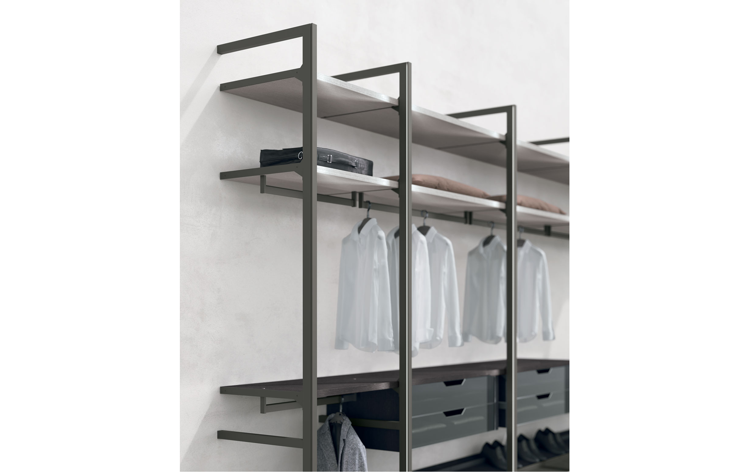 Система состоит из различных элементов: перегородок, полок, выдвижных ящиков и аксессуаров, которые можно комбинировать по вашему желанию, создавая индивидуальное решение для хранения одежды и аксессуаров. Возможность интеграции дополнительных элементов, таких как выдвижные лотки, обувные полки и зеркала, обеспечивает максимальный комфорт и удобство использования.