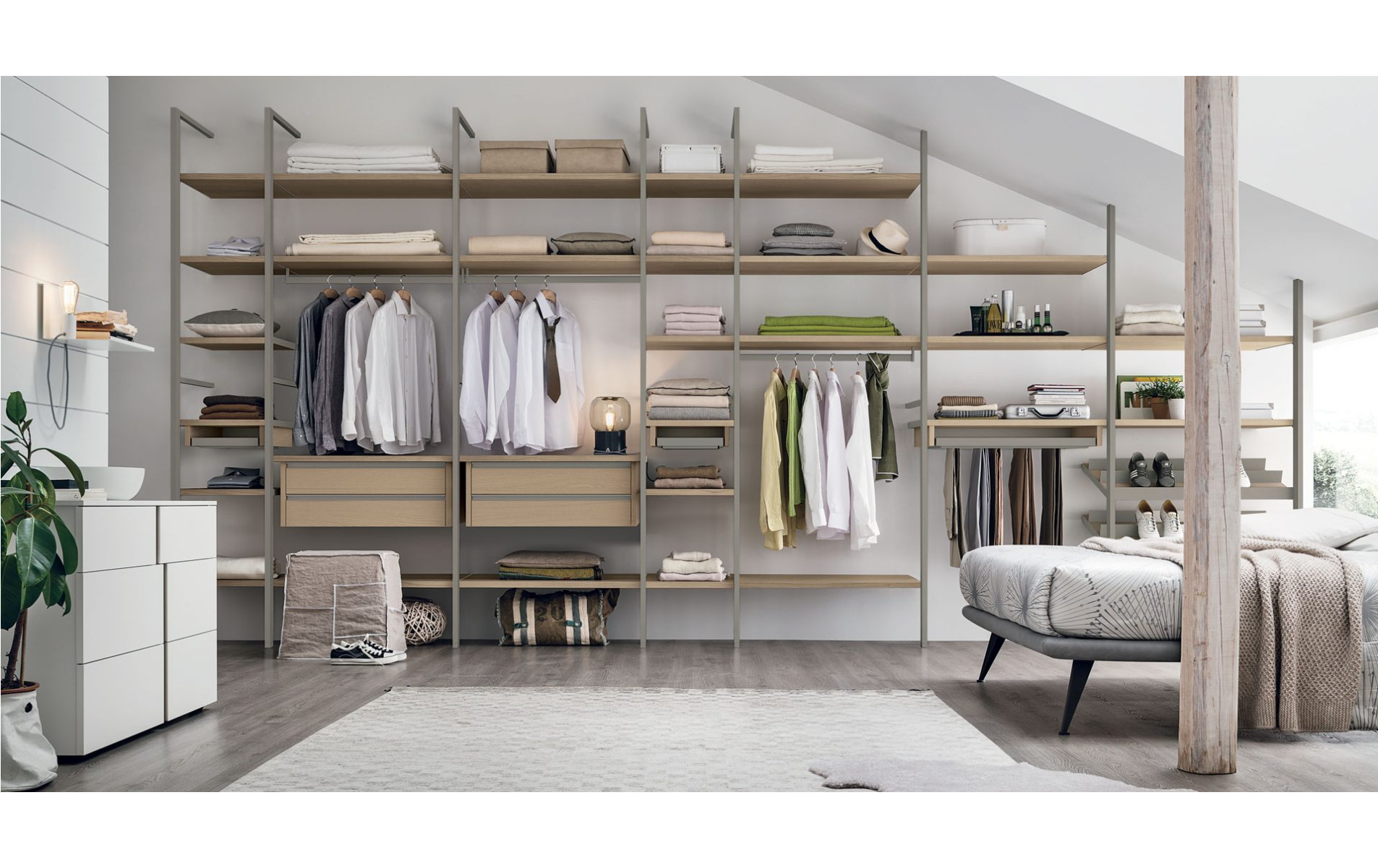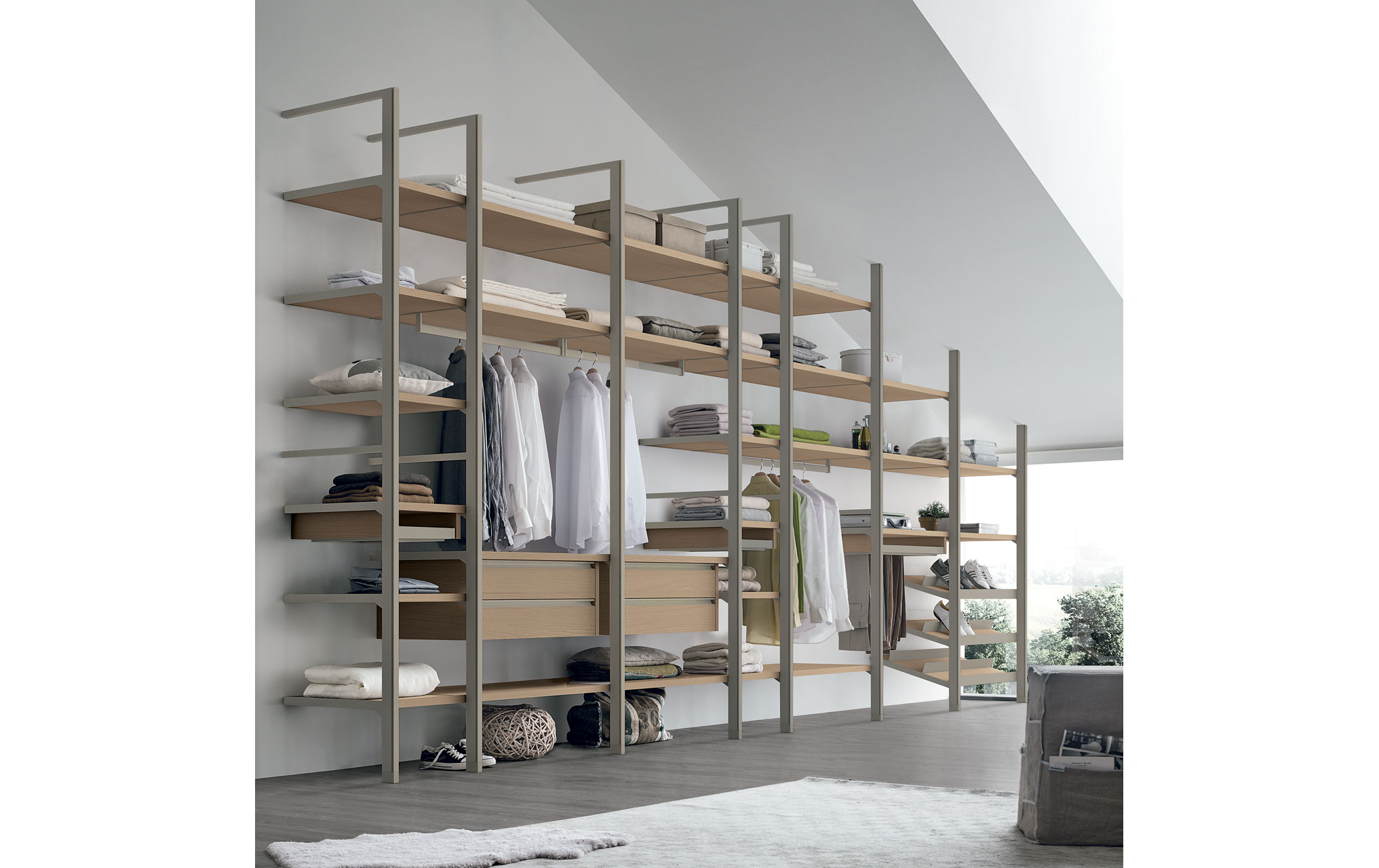 Liberty 303 — это модульная гардеробная система от итальянской фабрики Tomasella, сочетающая в себе минималистичный дизайн и высокую функциональность. Её отличительной чертой являются металлические рамы, закреплённые на стене и потолке, что придаёт конструкции визуальную лёгкость и современный вид.