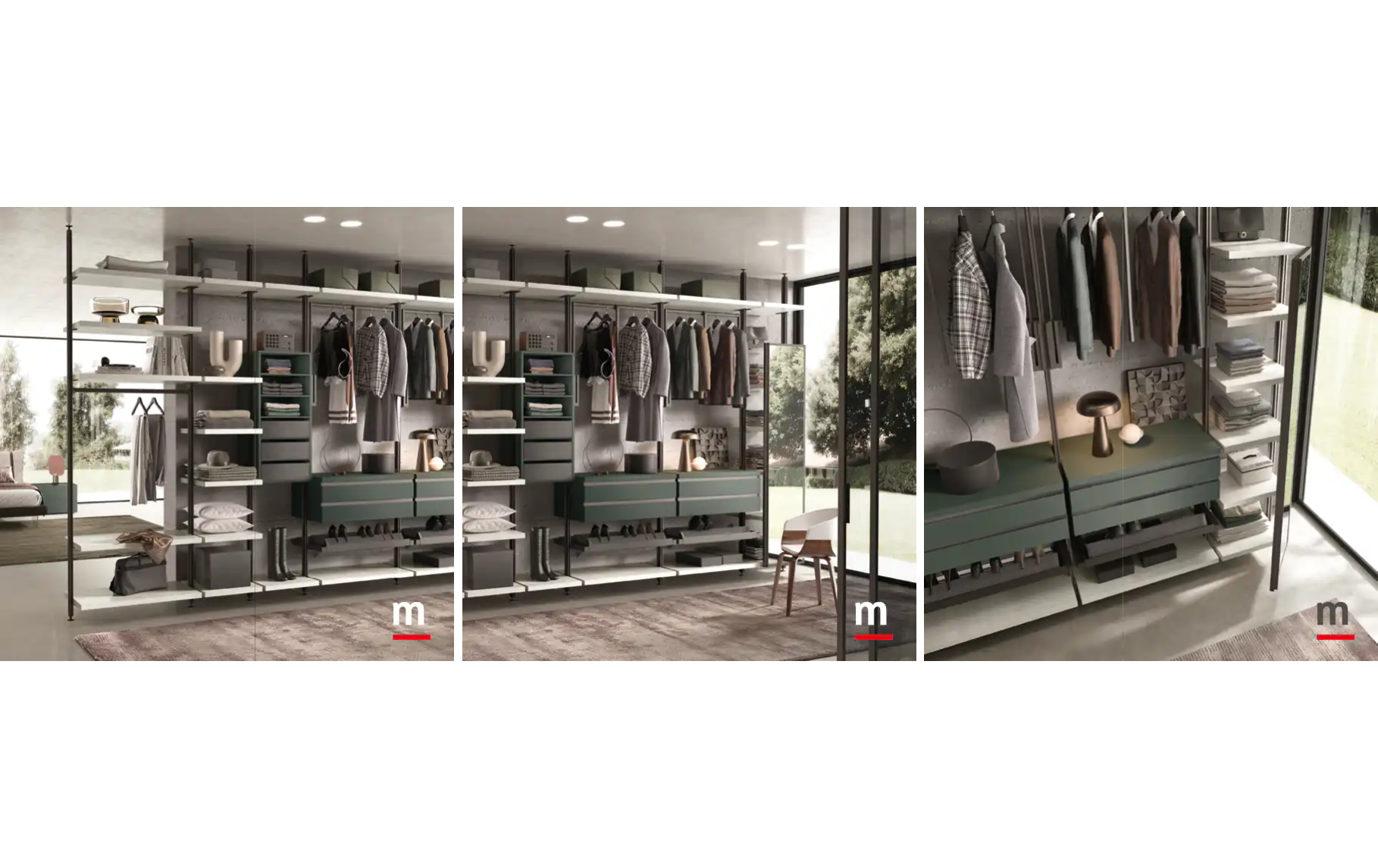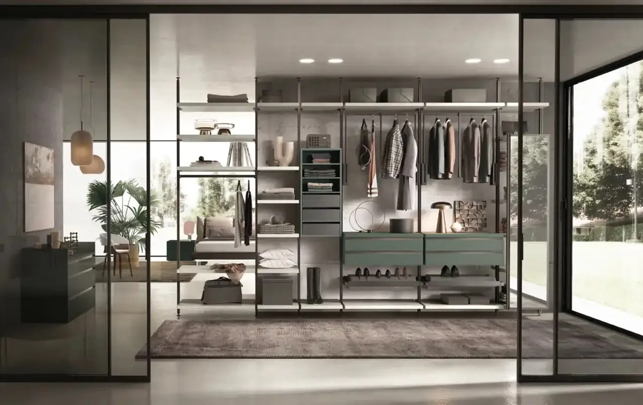 Серия Cabina Con Montanti от Moretti Compact сочетает в себе открытую архитектуру и функциональность классической гардеробной. Монтаж "в пол" на устойчивые стойки делает систему максимально надёжной, при этом сохраняется визуальная лёгкость и гибкость модульной композиции.