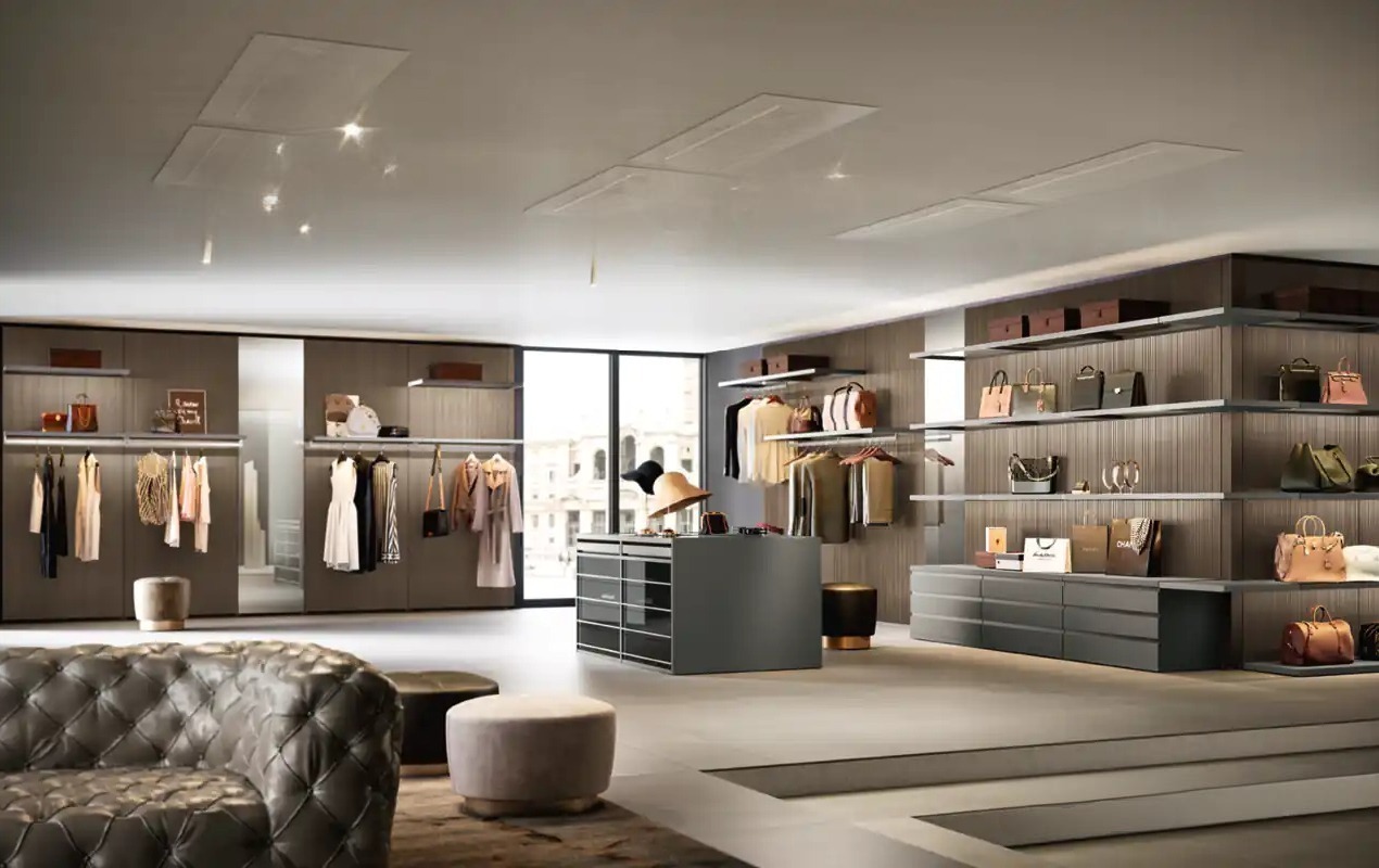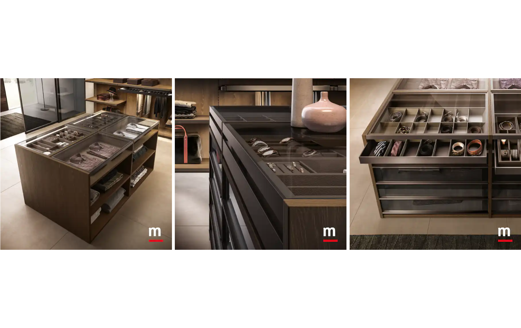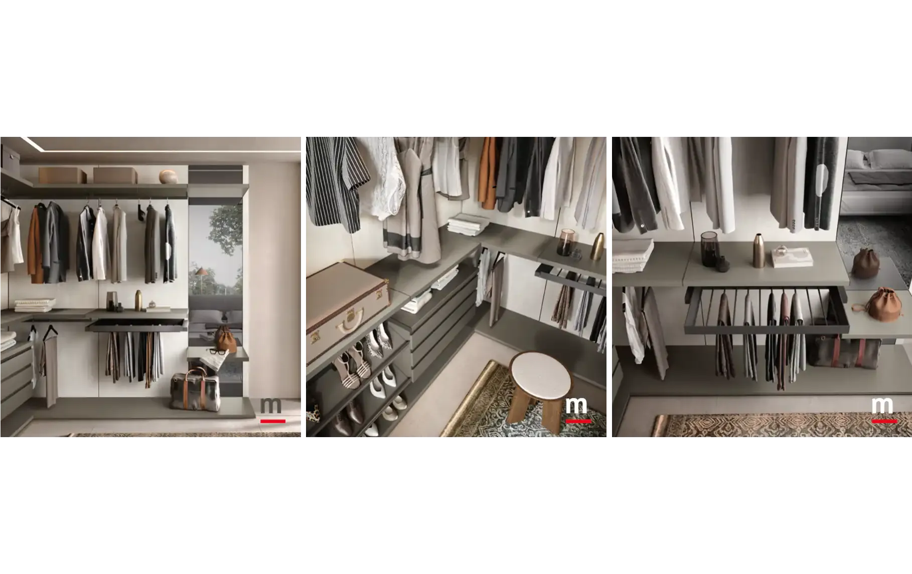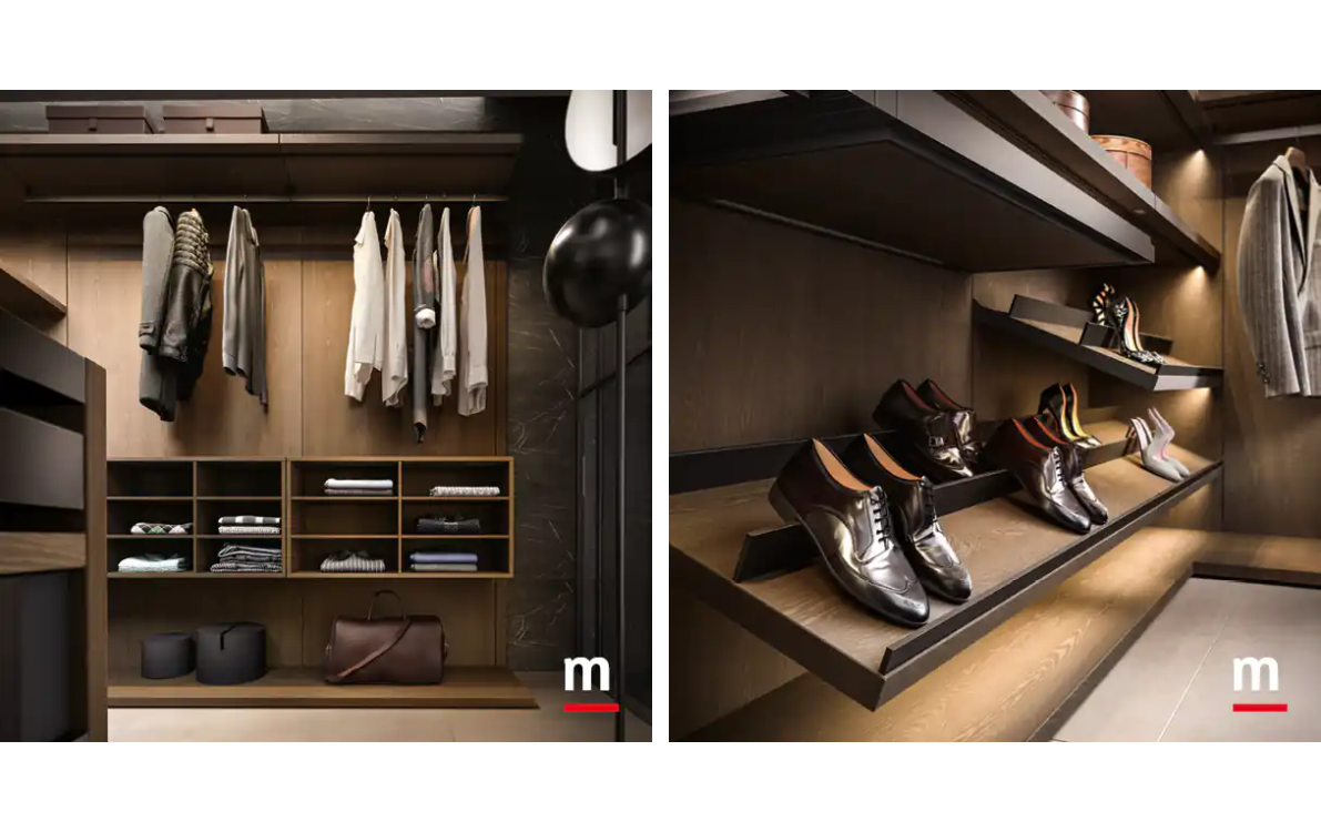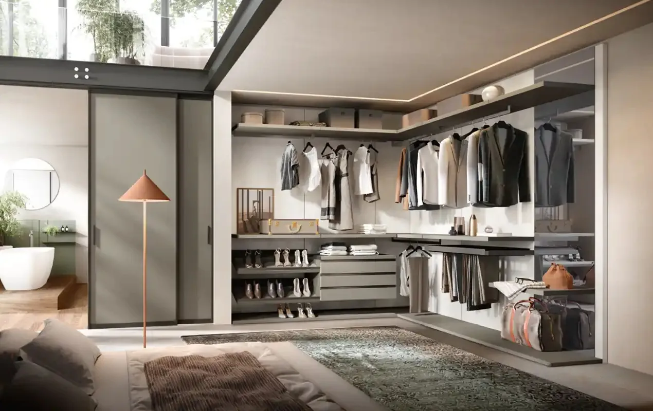 Комбинированная модель с визуальной «зональностью»: первая секция — гардеробная Cabine с дверцами, следующая — открытая Cremagliera, затем — централизованная зона с ящиками и островом. Отличный вариант для организации “гардеробной-инсталляции”.