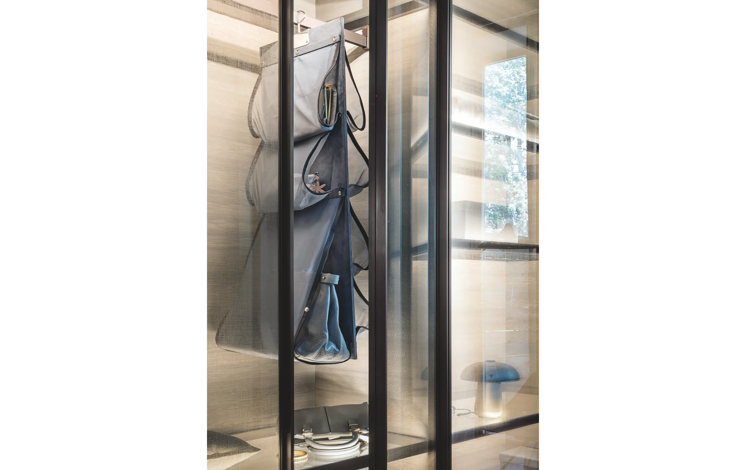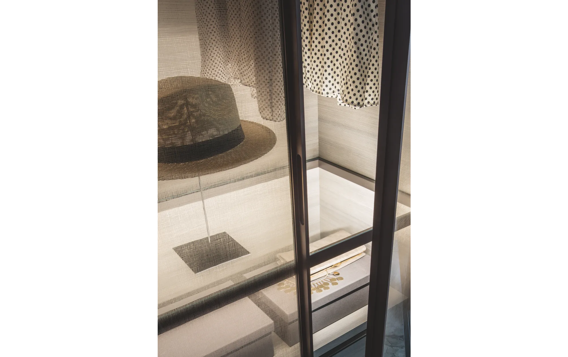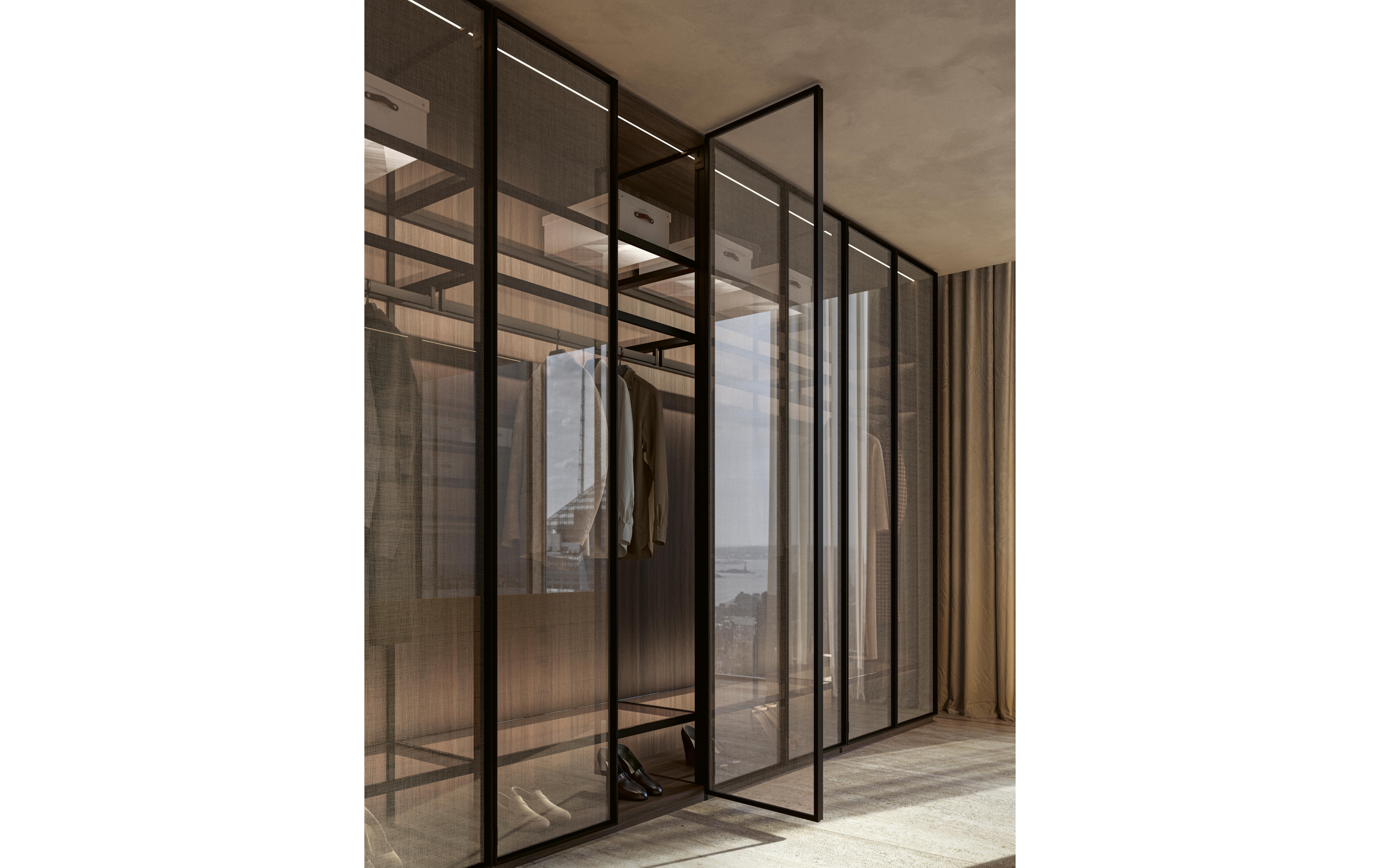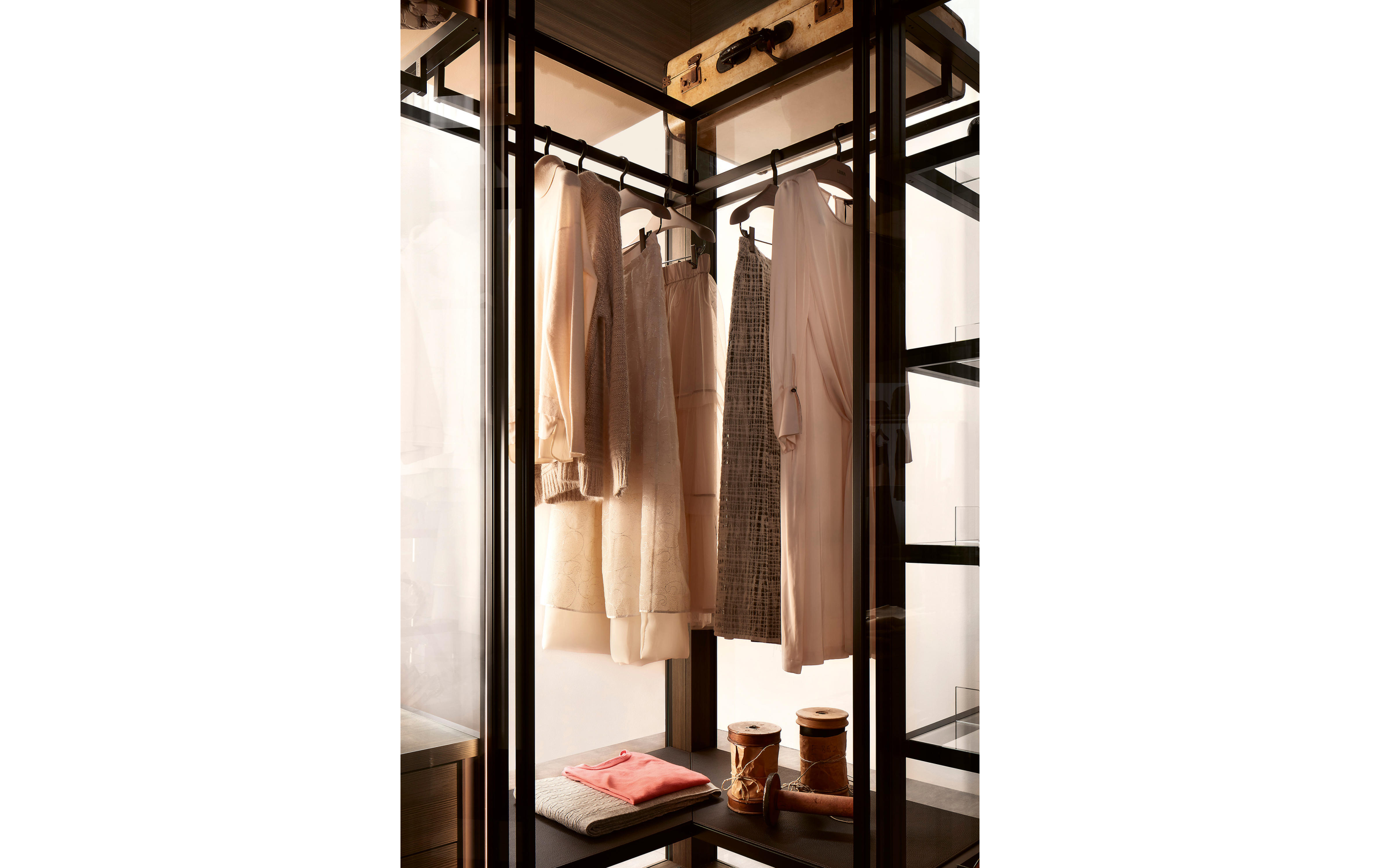 Шкаф Денди располагает вещи его владельца в центре внимания. Дверь, имеющая периметрическую раму из черного металла, доступна в большом ассортименте: прозрачное стекло, бронзовое отражающее стекло, лакированное стекло 10-ти цветов и бронзовое стекло с шелковой трафаретной печатью или декоративная ткань. Индивидуальный шкаф, который можно адаптировать по высоте, ширине и глубине, с широкими возможностями внутреннего оснащения для удовлетворения любых потребностей. Выдвижные ящики, витрины для брюк, ремней и туфель, полки и подвесные поручни со встроенным освещением дополнены роскошными деталями из кожи и роскошных тканей для гардероба, который по-настоящему элегантен.