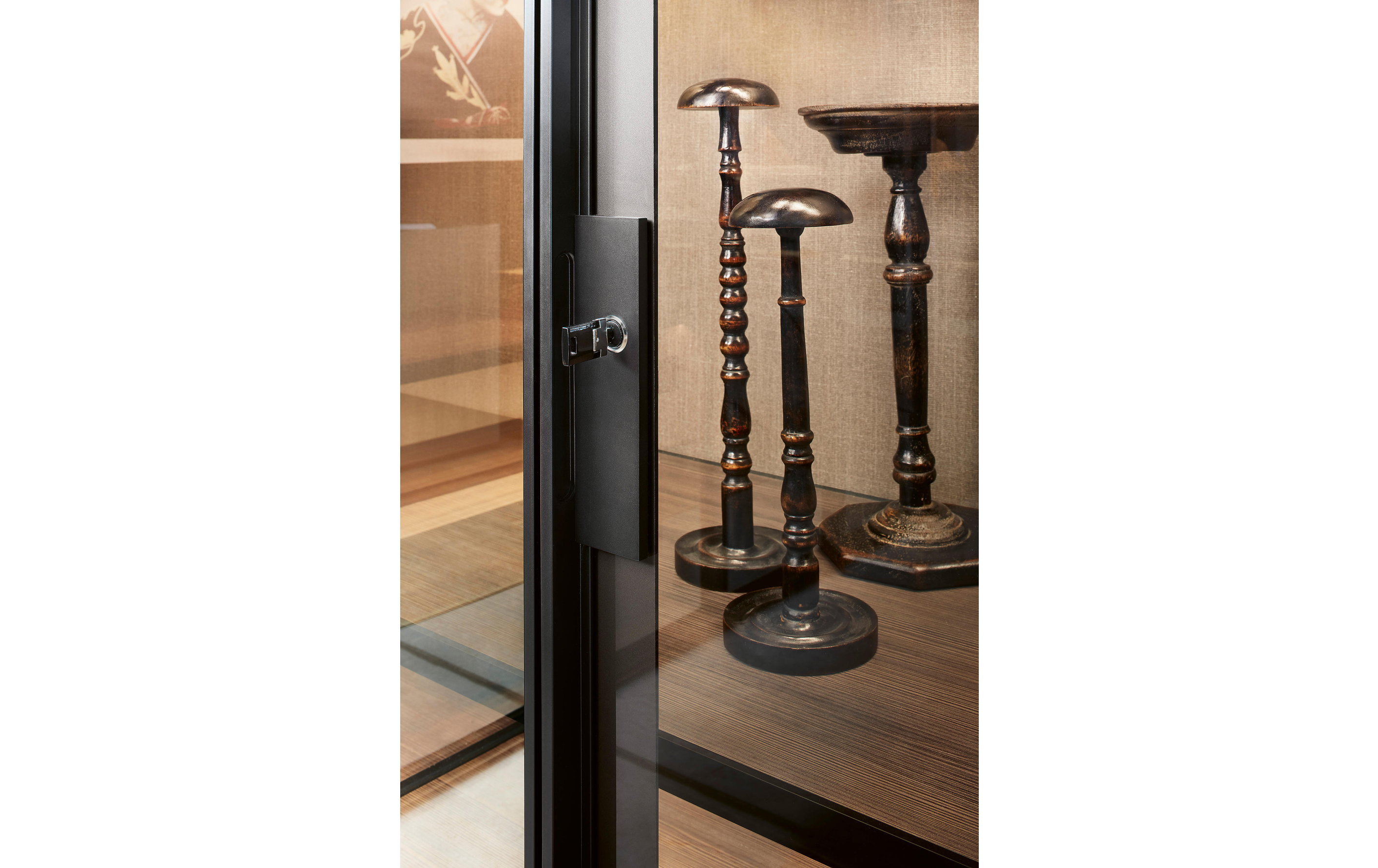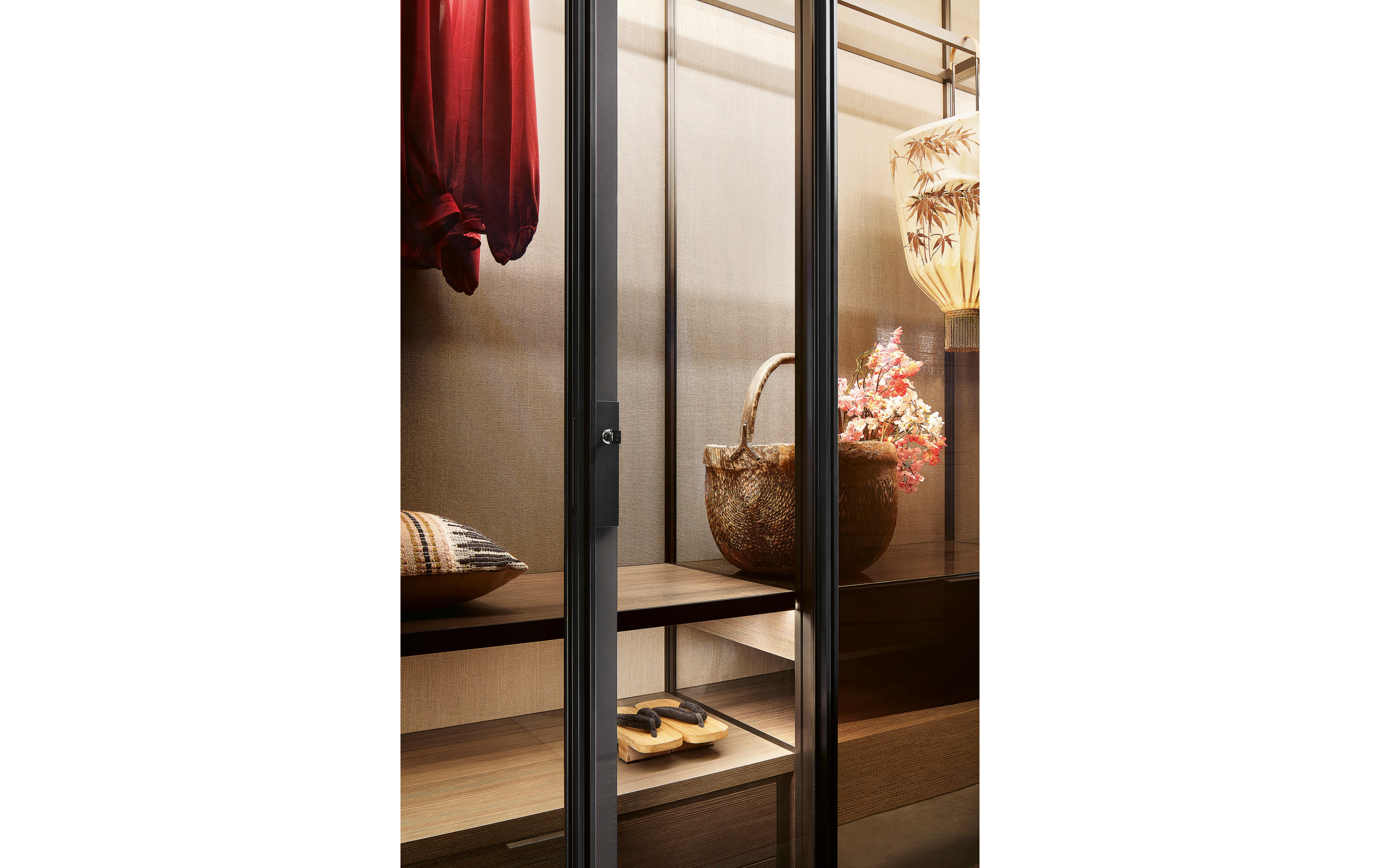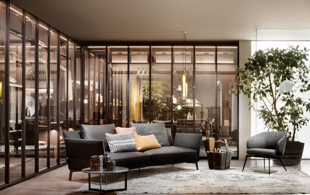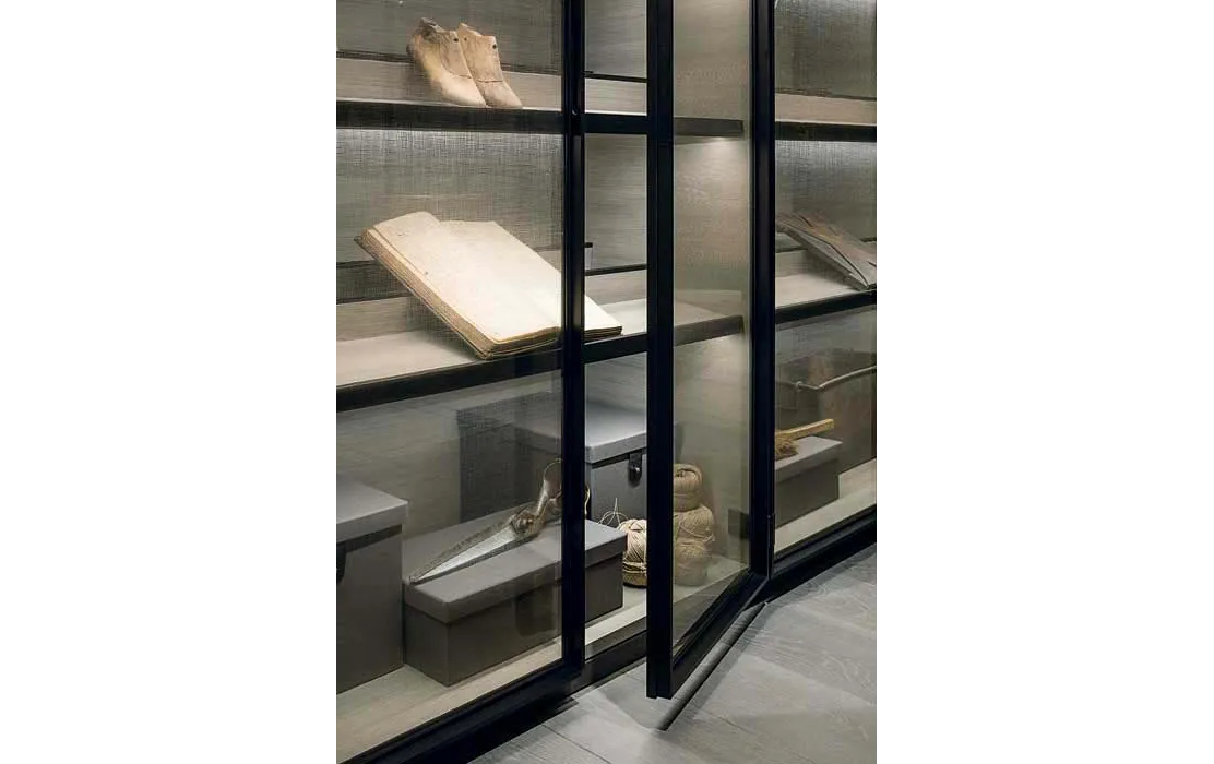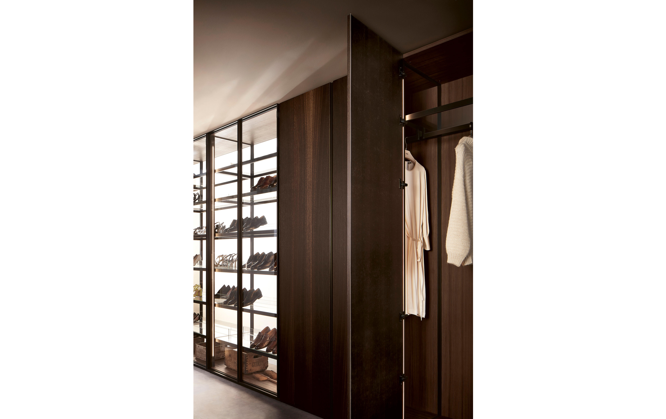 Шкаф Денди располагает вещи его владельца в центре внимания. Дверь, имеющая периметрическую раму из черного металла, доступна в большом ассортименте: прозрачное стекло, бронзовое отражающее стекло, лакированное стекло 10-ти цветов и бронзовое стекло с шелковой трафаретной печатью или декоративная ткань. Индивидуальный шкаф, который можно адаптировать по высоте, ширине и глубине, с широкими возможностями внутреннего оснащения для удовлетворения любых потребностей. Выдвижные ящики, витрины для брюк, ремней и туфель, полки и подвесные поручни со встроенным освещением дополнены роскошными деталями из кожи и роскошных тканей для гардероба, который по-настоящему элегантен.