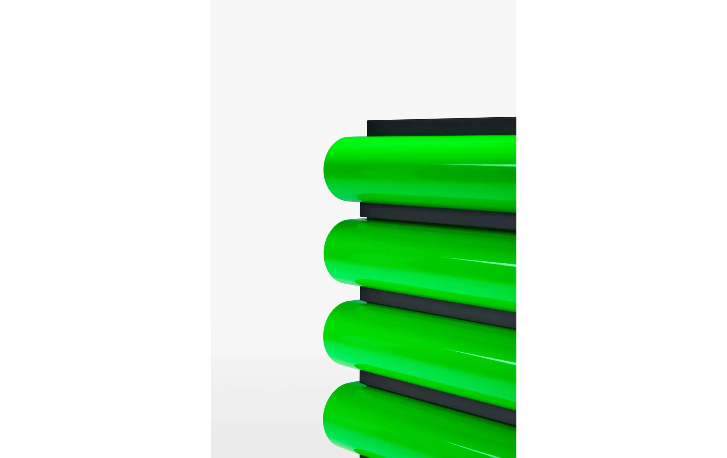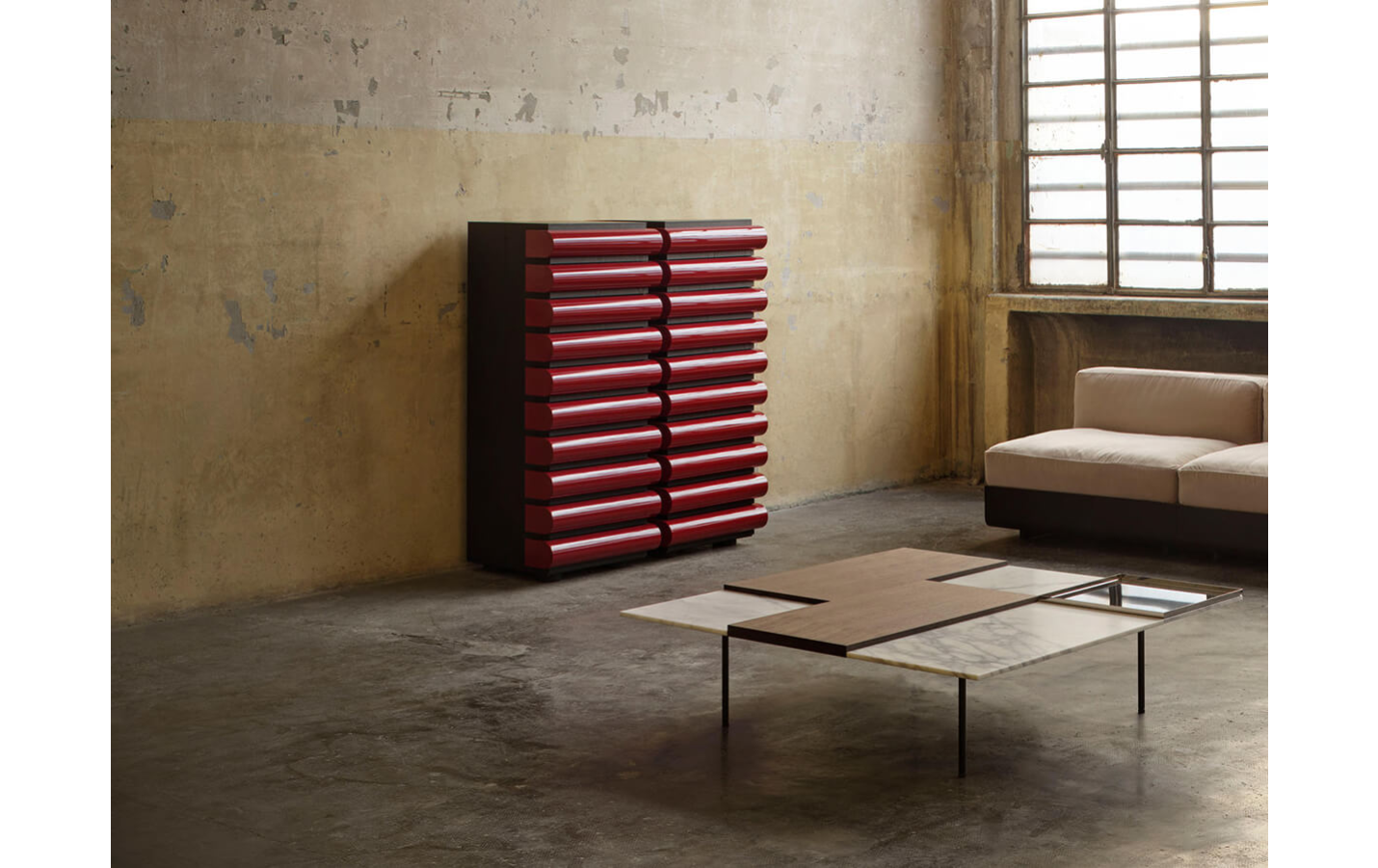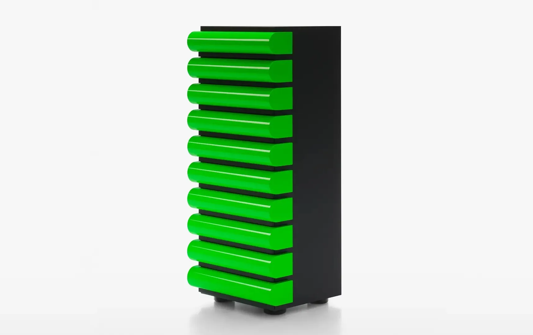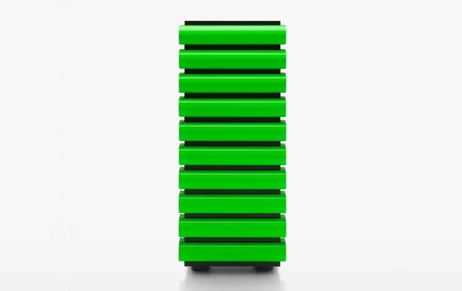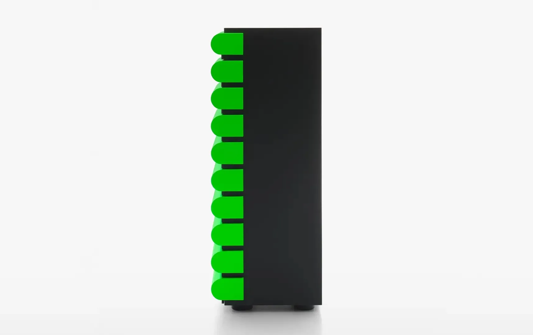 - Контраст материалов: Черный ясень или темный орех с глянцевыми ящиками в иконических цветах, включая Fluo Green.