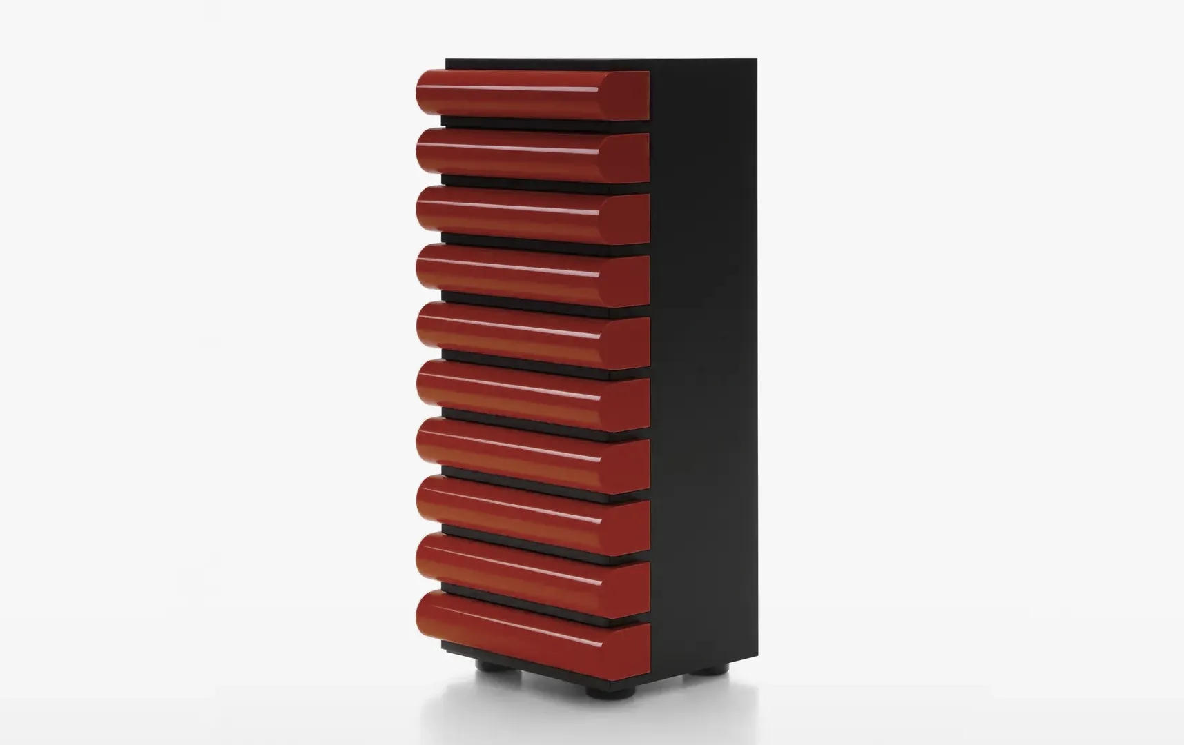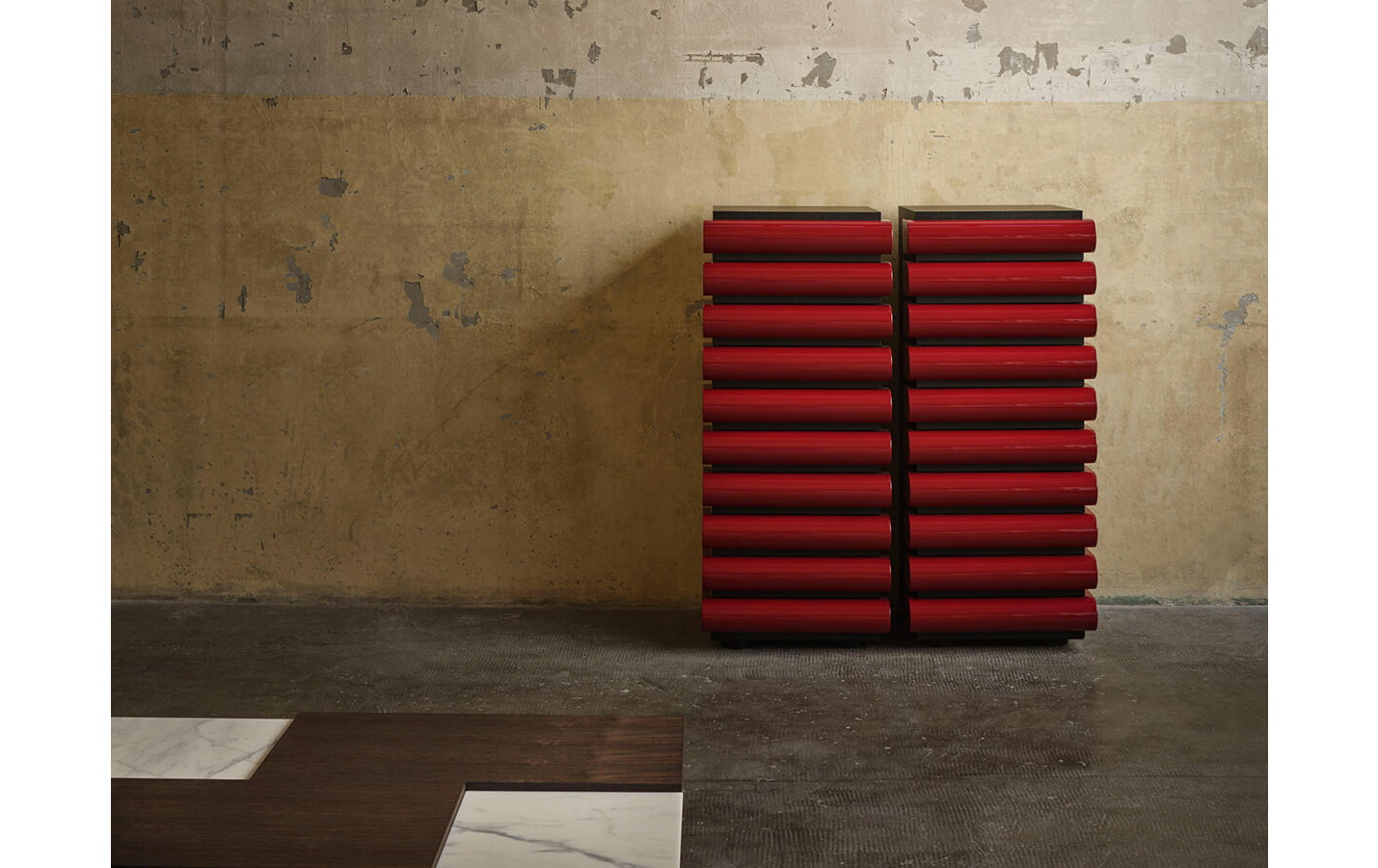 - Игривые формы: Вертикальная структура как колонна, с внутренним соединением нижних ящиков для дополнительного пространства.