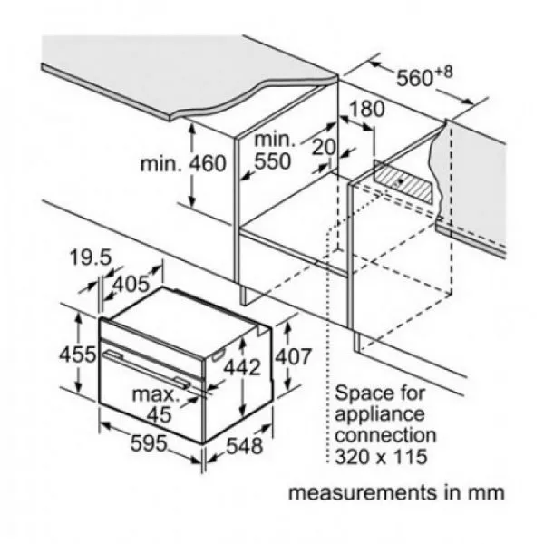 - Размеры ниши (ВxШxГ): 450 мм – 455 мм x 560 мм – 568 мм x 550 мм