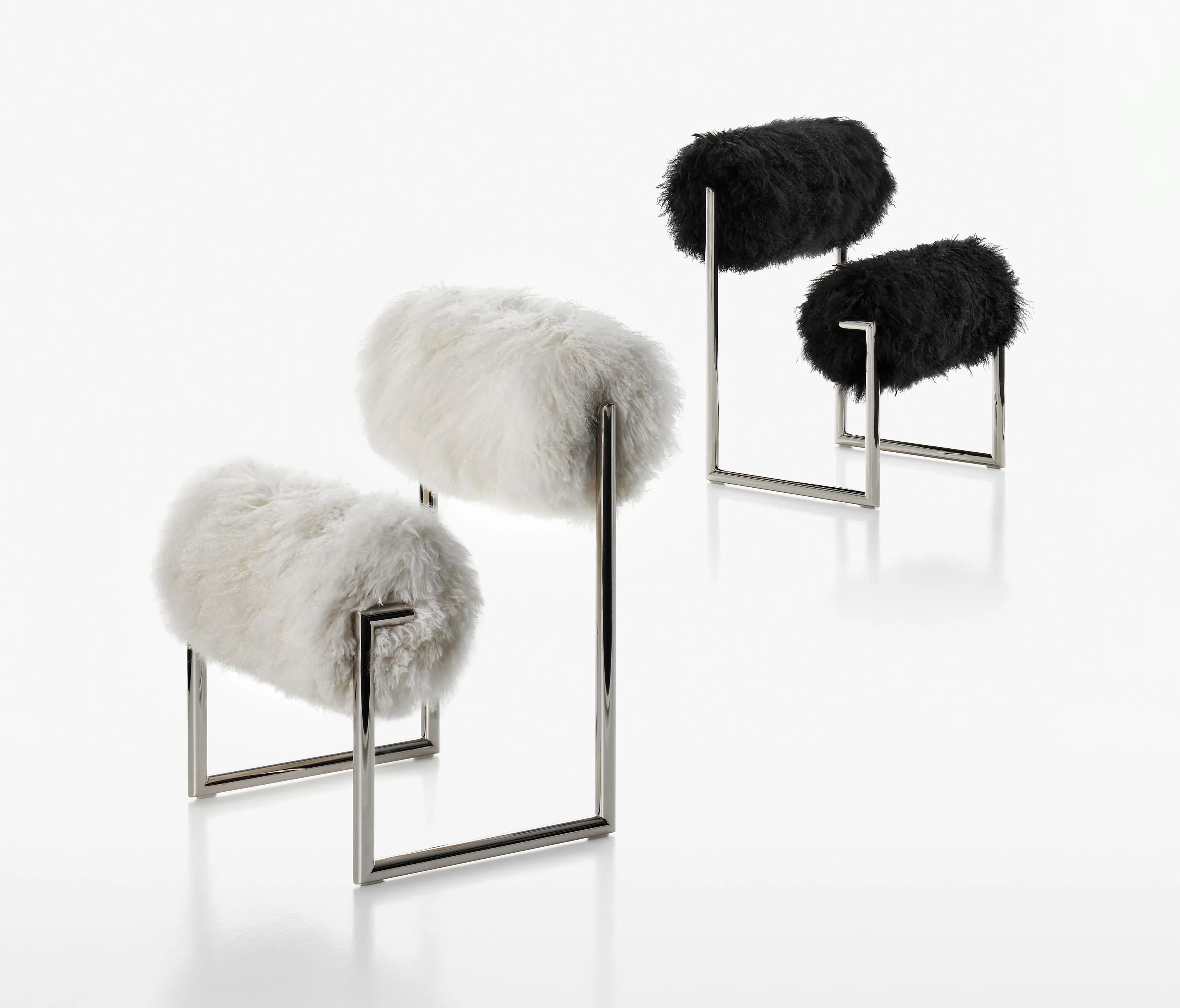 Кресло Нанды Виго, известное как Due Più, представляет собой удивительный, загадочный предмет, в котором использование двух роликов, которые выглядят так, словно они плавают, создает поистине уникальные характеристики. Футуристичный в аспекте, мы можем рассматривать его как символический дизайн, сочетающий в себе две души Виго: дух геометрии, который просвечивает сквозь минималистичную металлическую конструкцию с ее отражением света, и эксцентричный, новаторский дух, проявляющийся в использовании монгольского меха. В настоящее время представлен Acerbis со стальным каркасом и мехами, переработанными из отходов пищевой промышленности, в соответствии с принципами круговой экономики, которые делают его совместимым с современной этикой.