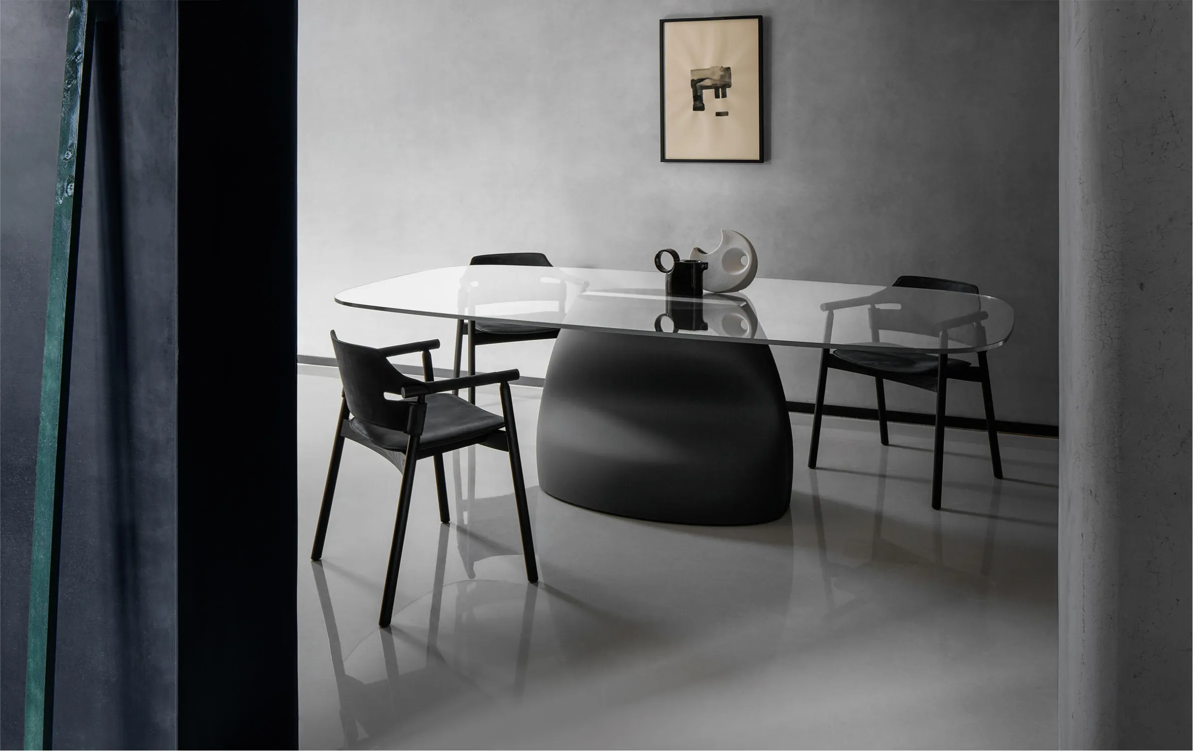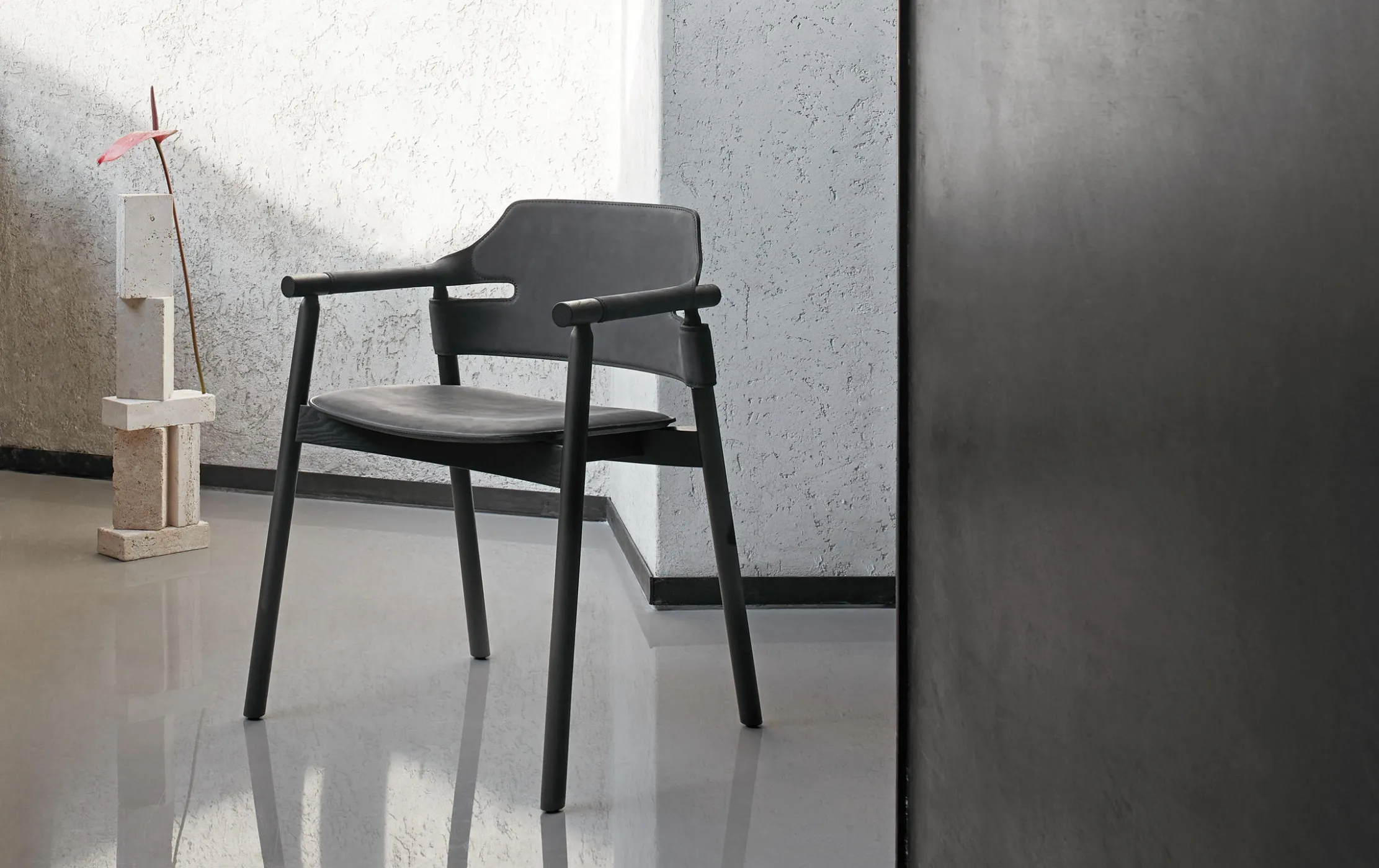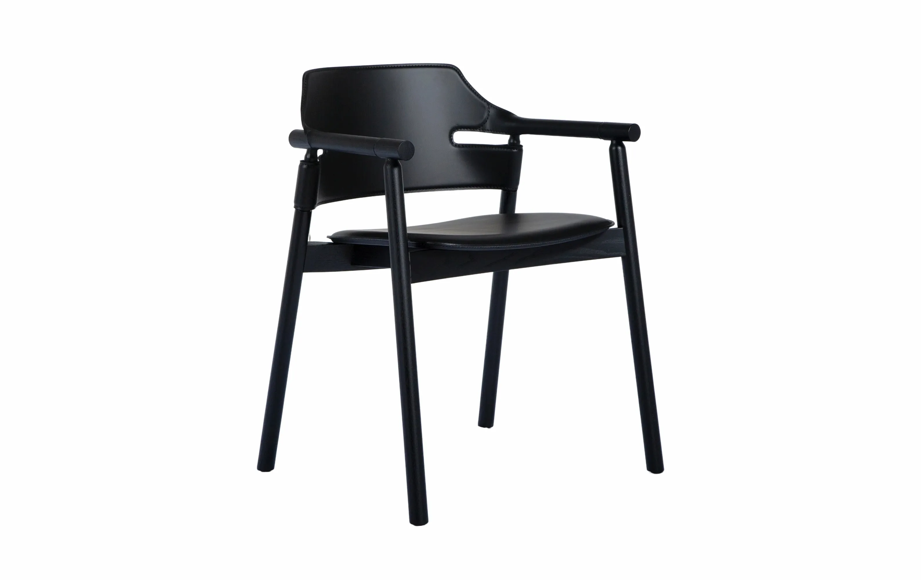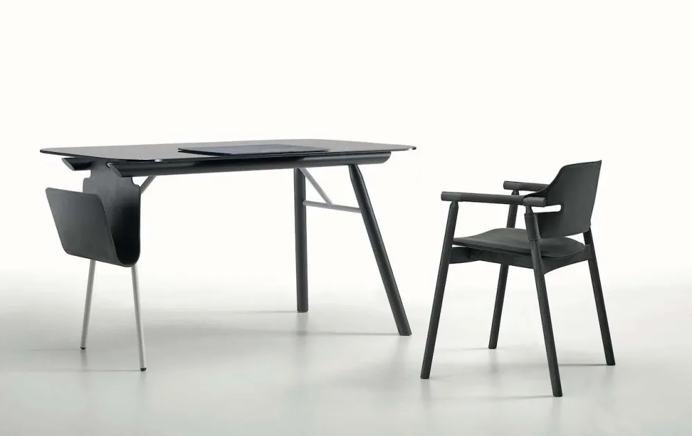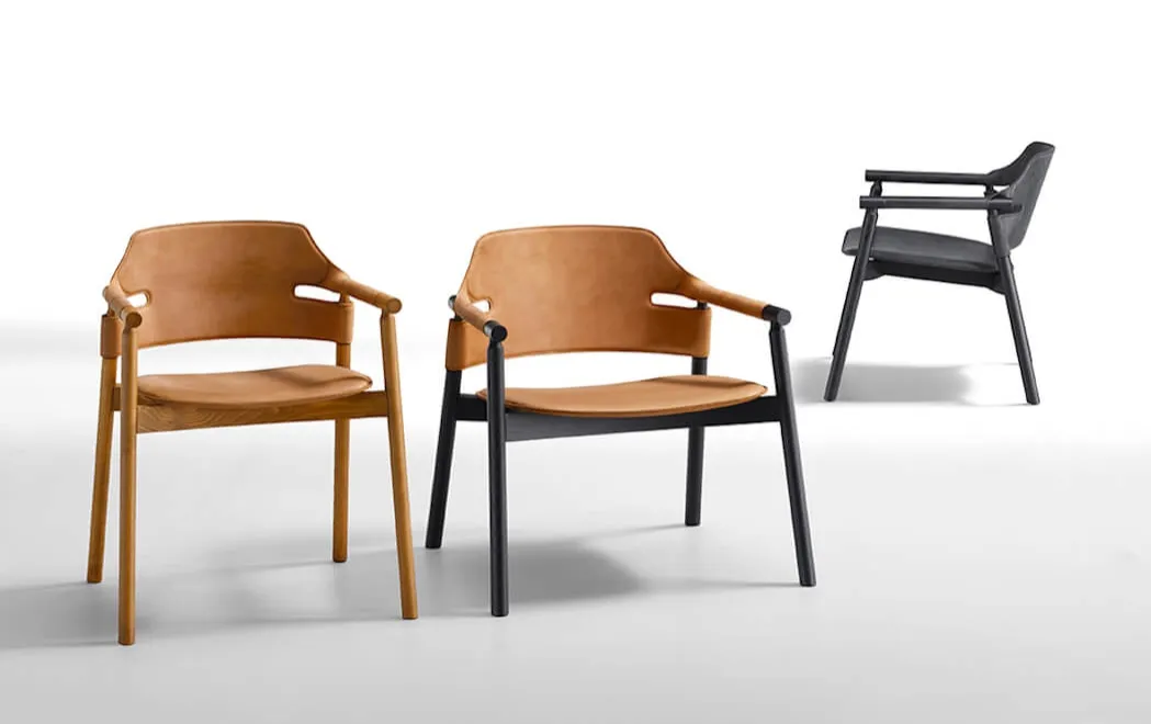 Стулья и кресла с подлокотниками коллекции SUITE от итальянской фабрики Midj с каркасом из ясеня в отделке черный шпон. Сиденье и спинка выполнены из тосканской натуральной черной кожи.