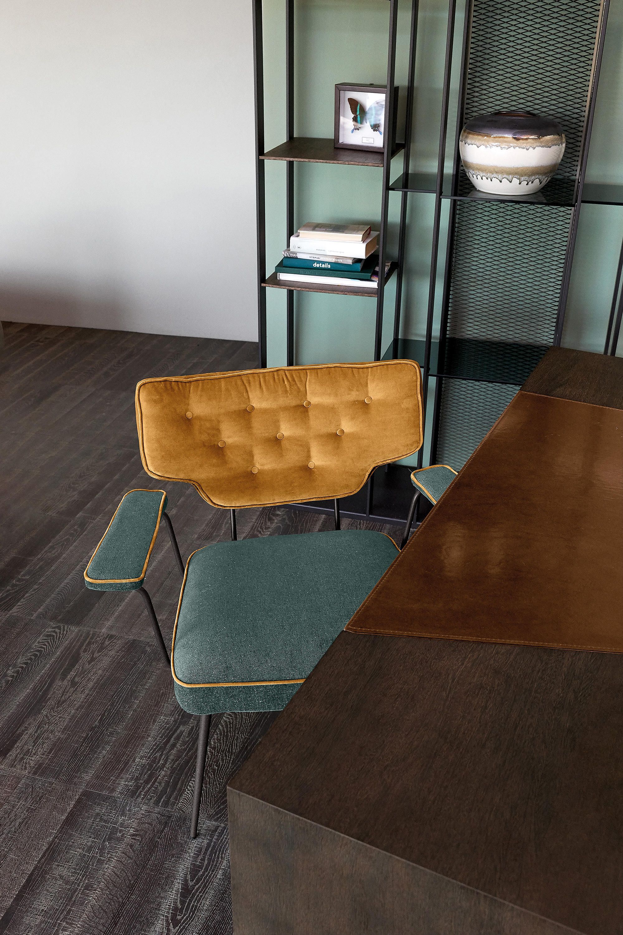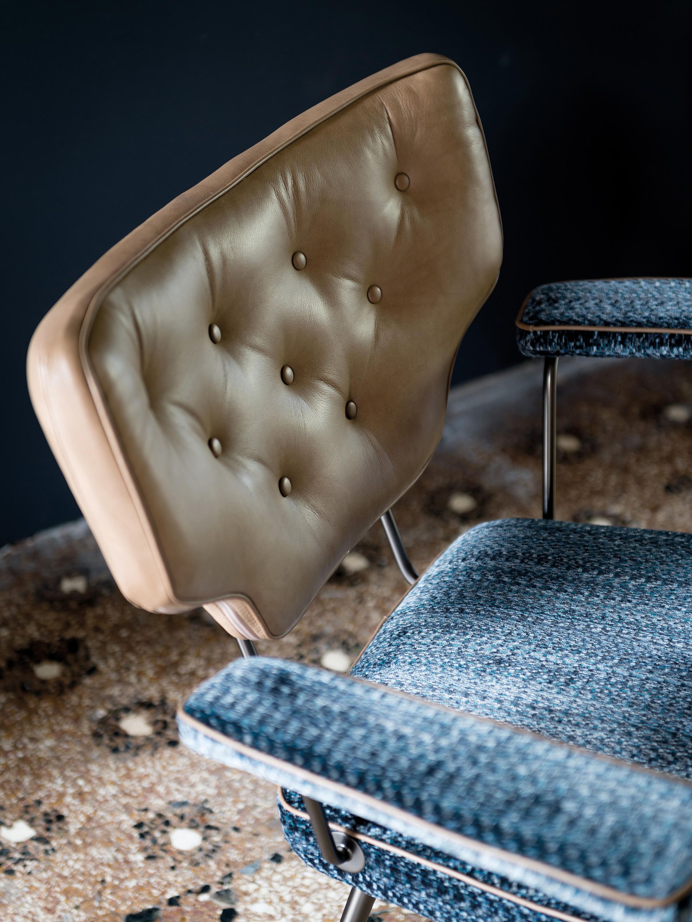 Twiggy - универсальное и настраиваемое кресло с утонченным ретро-шиком, вдохновленное идеей шикарной, личной и абсолютно модной жизни. Спинка из кожи капитонне сочетается с тканями или кожей, которые можно выбрать для сидения и подлокотников. Кант, как деталь платья от кутюр, проходит по всему периметру кресла. Две отделки также для основания: титан или слюдяно-коричневый. Есть Twiggy для каждого настроения, создайте свое.
