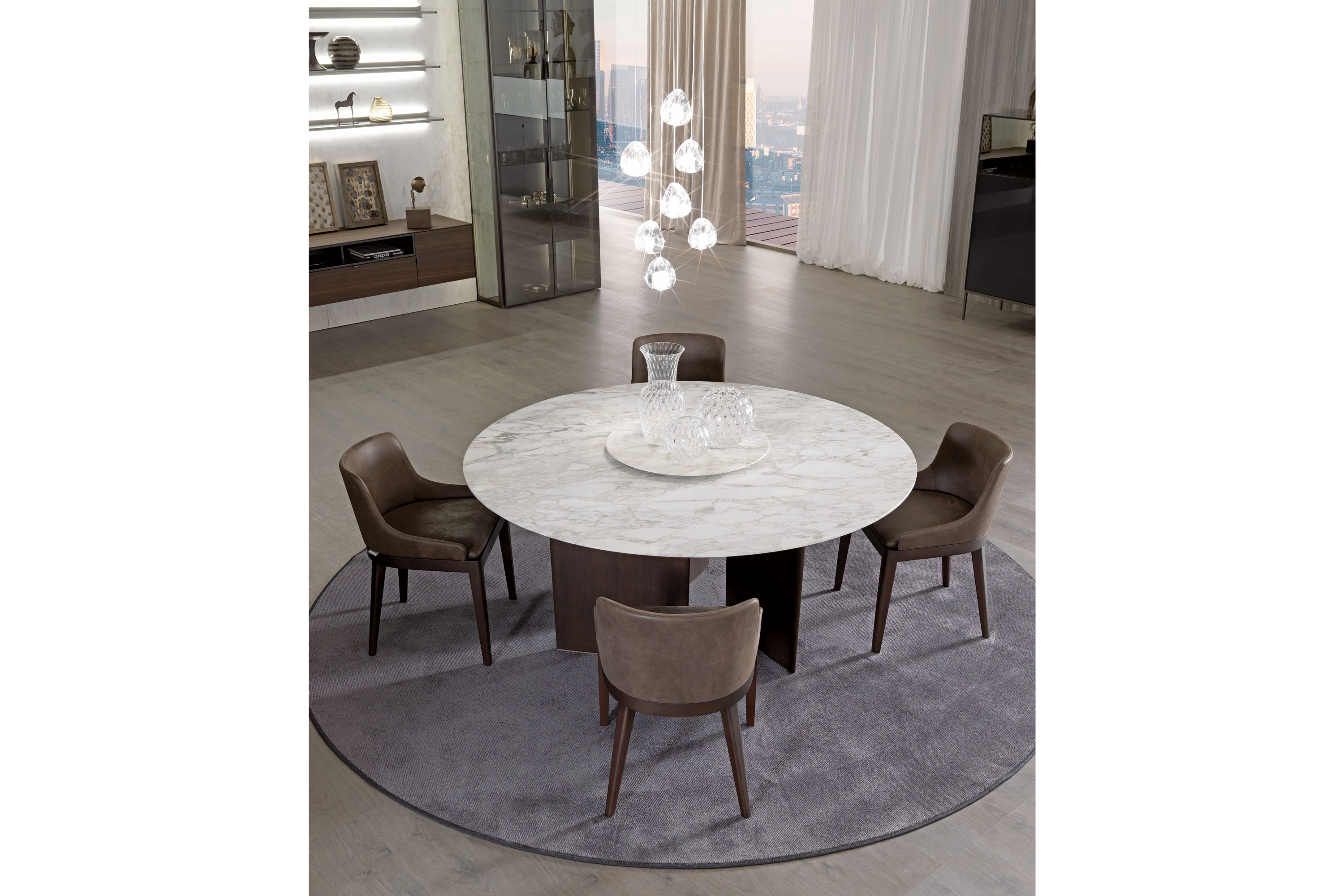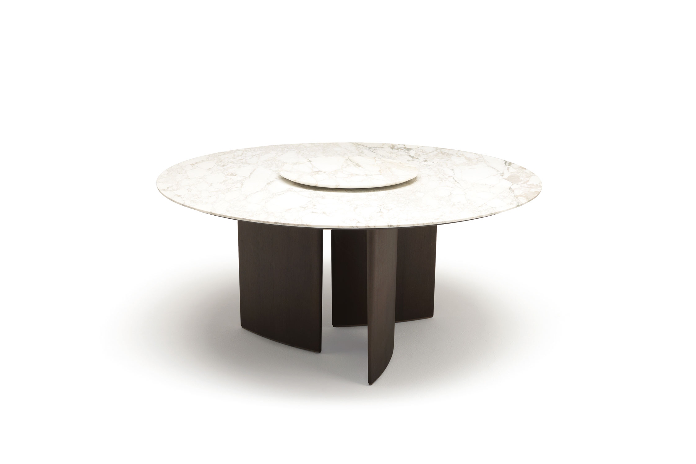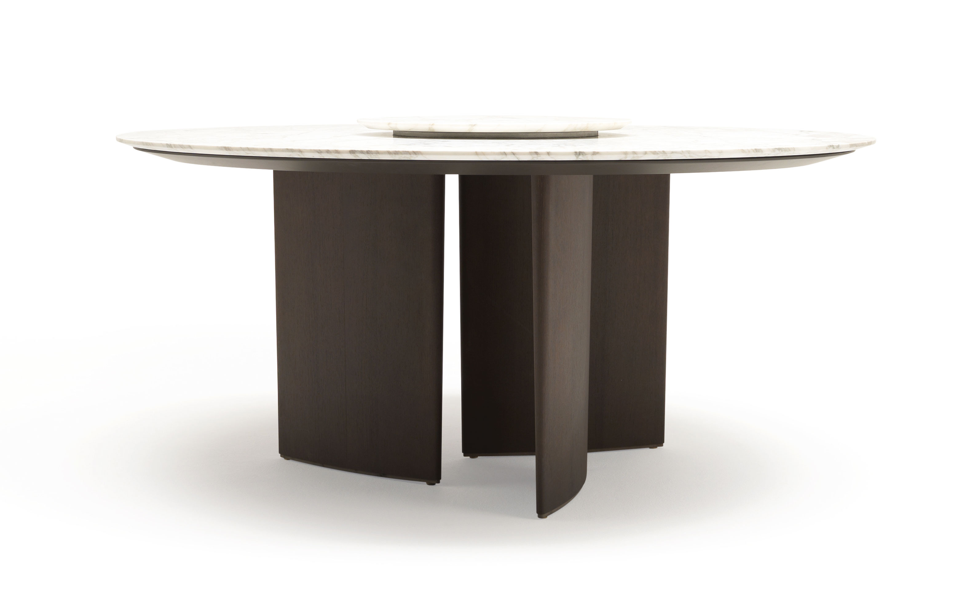 Столы с деревянным основанием, облицованным шпоном или покрытым матовым лаком. Литая столешница доступна в двух вариантах: овальная столешница доступна в мраморной столешнице во всех вариантах или из прозрачного стекла. Круглая столешница из формованного мрамора и нижняя часть из формованного дерева с той же отделкой, что и основание. Для круглой столешницы доступна дополнительная вращающаяся формованная столешница из мрамора (Lazy Susan), доступная в двух размерах.