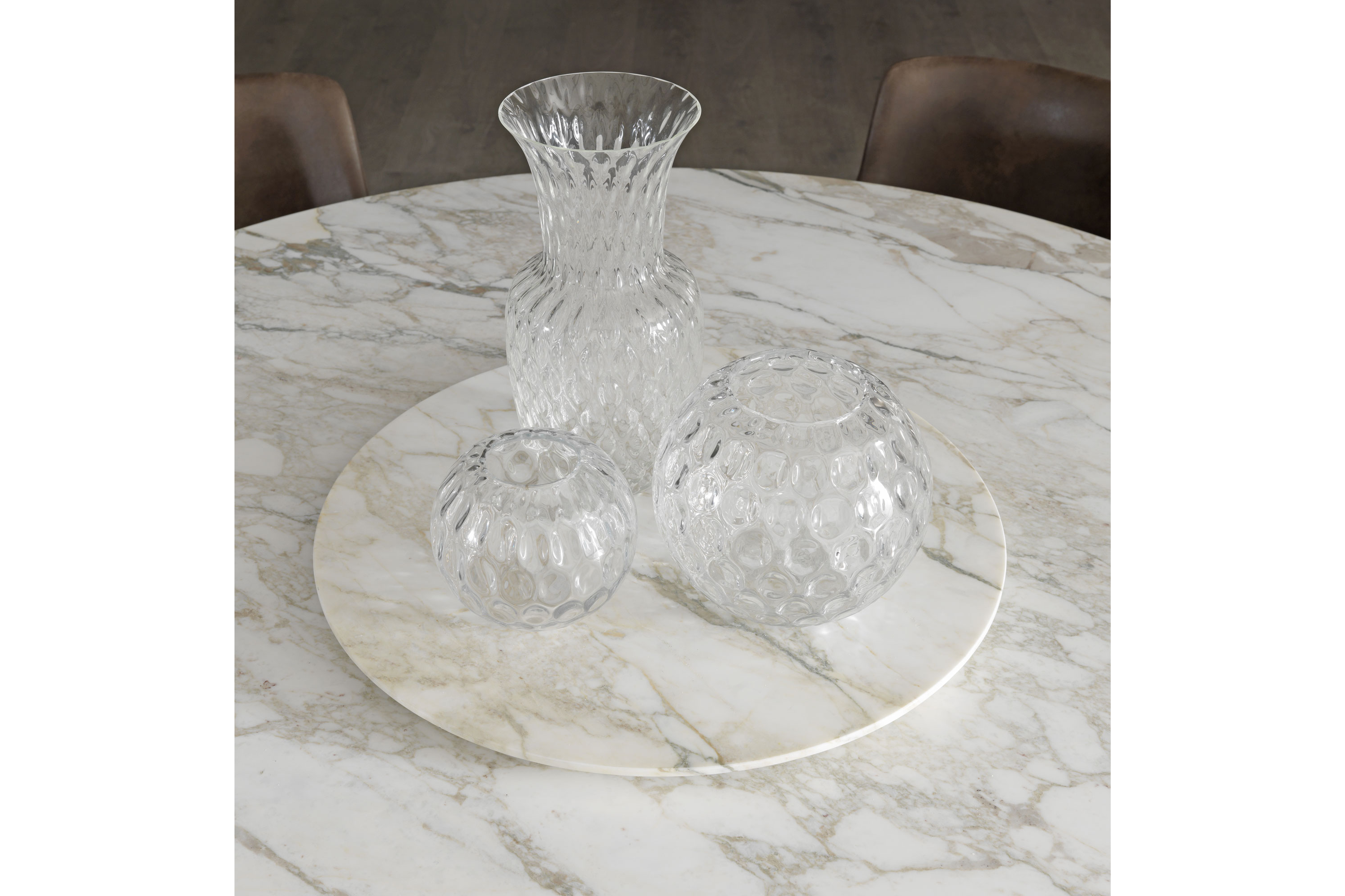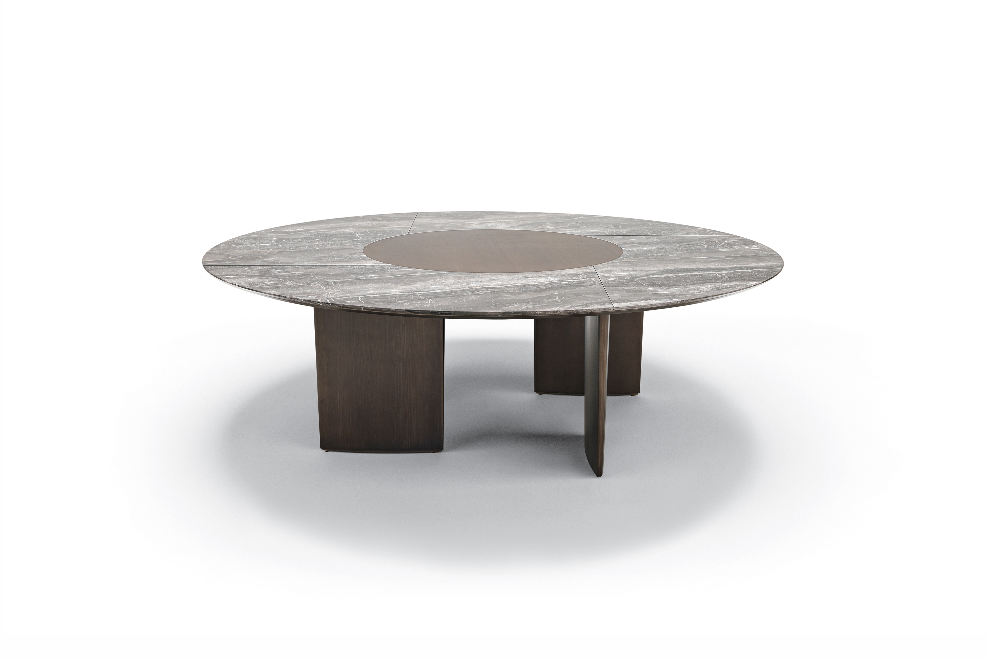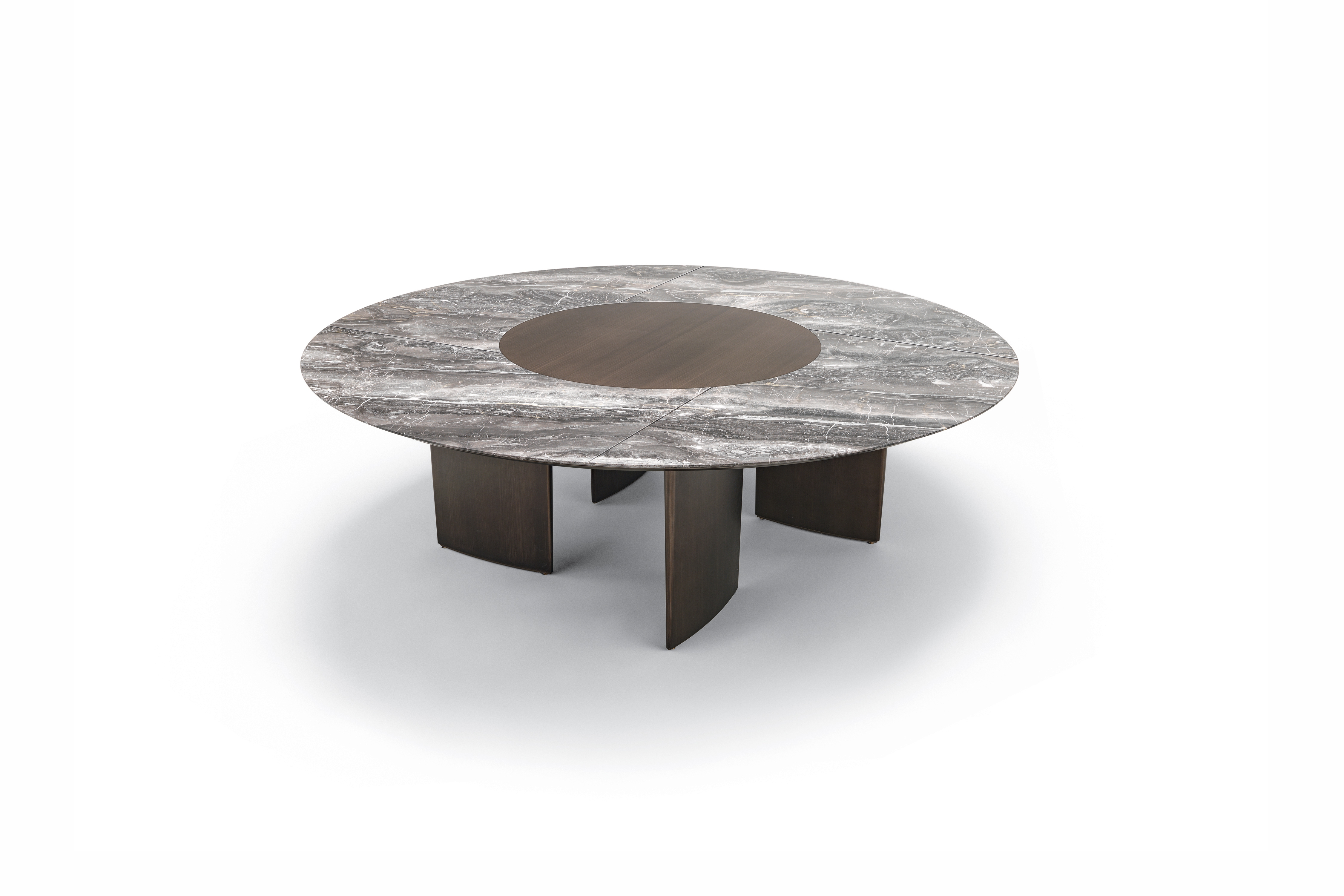 Столы с деревянным основанием, облицованным шпоном или покрытым матовым лаком. Литая столешница доступна в двух вариантах: овальная столешница доступна в мраморной столешнице во всех вариантах или из прозрачного стекла. Круглая столешница из формованного мрамора и нижняя часть из формованного дерева с той же отделкой, что и основание. Для круглой столешницы доступна дополнительная вращающаяся формованная столешница из мрамора (Lazy Susan), доступная в двух размерах.