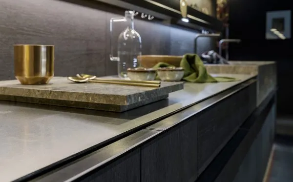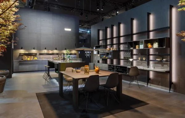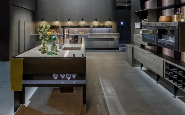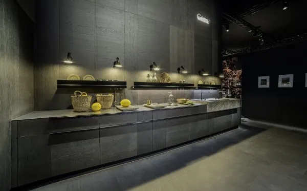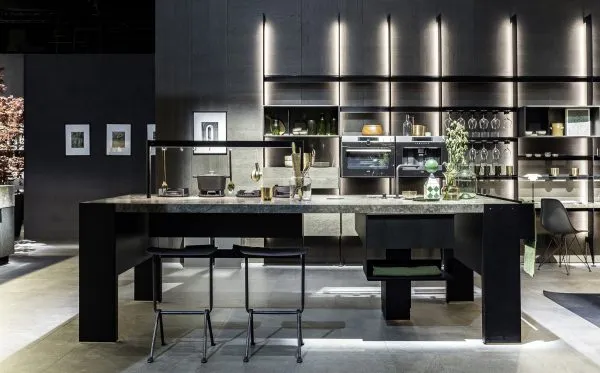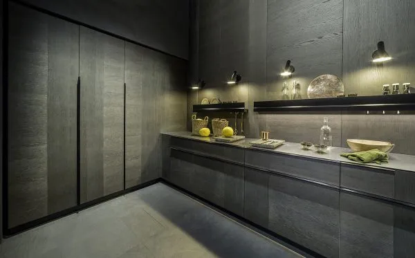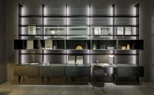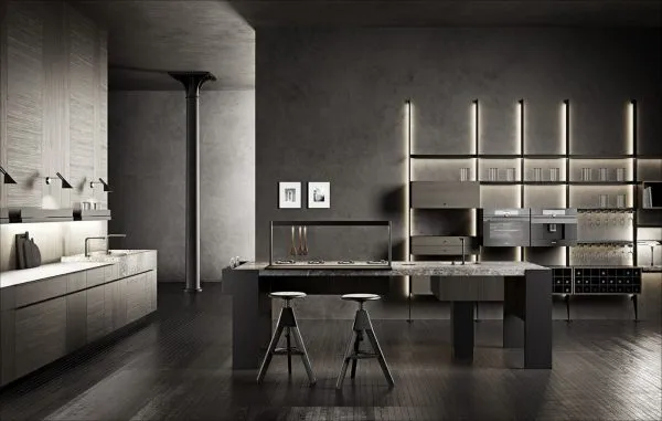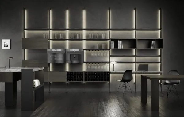 Система стеллажей The 50s (в стиле 50-х годов) была специально разработана для открытой кухонной площади и совершенствует эту модель кухни. Система полок The 50s состоит из структурированных лакированных модулей Nero; а также модулей из древесины Rovere Fossile с использованием дополнительных полок из прозрачного стекла Grigio Fumè. Внимание привлекают элегантные ножки этих стеллажей; которые во многом напоминают дизайн и стиль; использовавшиеся в 50-х г.г. Этот стиль снова становится модным и успешно сочетает в себе будущее и прошлое дизайна естественным; аутентичным способом.