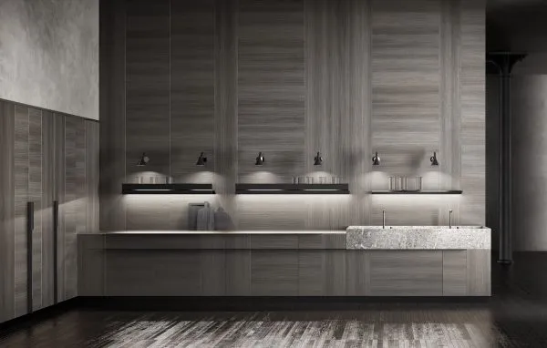 Шкафы Intarsio на заднем плане являются идеальным дополнением к кухонному острову Williamsburg. Шкафы Intario от Cesar – это базовые и высокие шкафы; изготовленные из уникальной древесины Rovere Fossile; которая представляет собой высококачественный материал. Двери шкафа Intarsio являются уникальными и новыми для мебельной отрасли и имеют алюминиевую ручку с ребристым эффектом; которую можно устанавливать как горизонтально; так и вертикально. Акцент на этой новой кухне в итальянском стиле еще больше увеличен за счет замены настенных шкафов простой; минималистичной системой стеллажей Wall Waiter. Стальная столешница красиво подсвечивается за счет непрямых световых эффектов. Встроенная раковина изготовлена из цельного; интегрированного мрамора Grigio Billiemi; того же материала; что и разделочные доски.