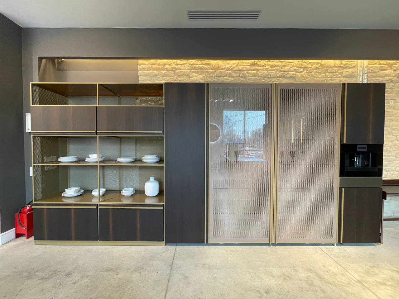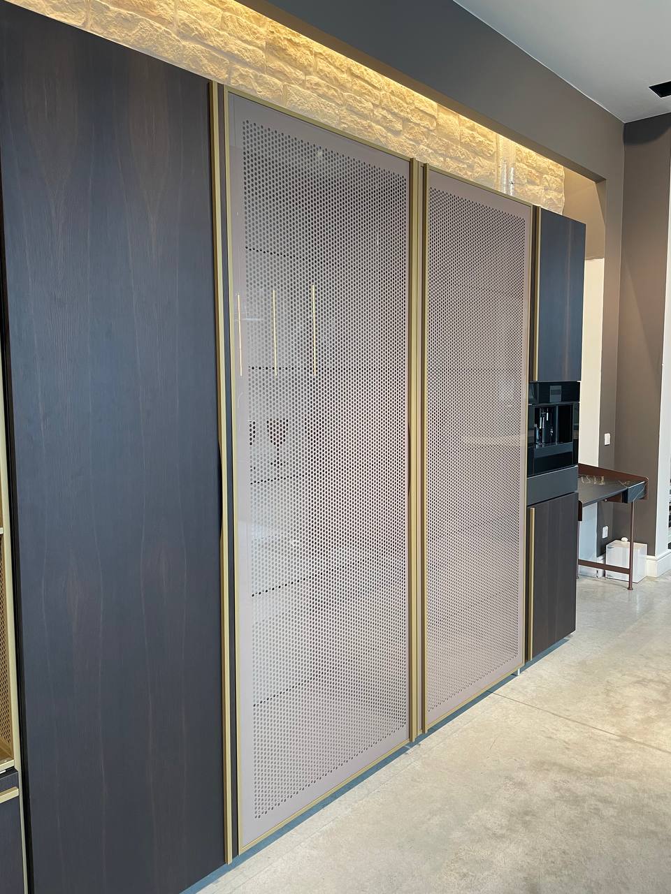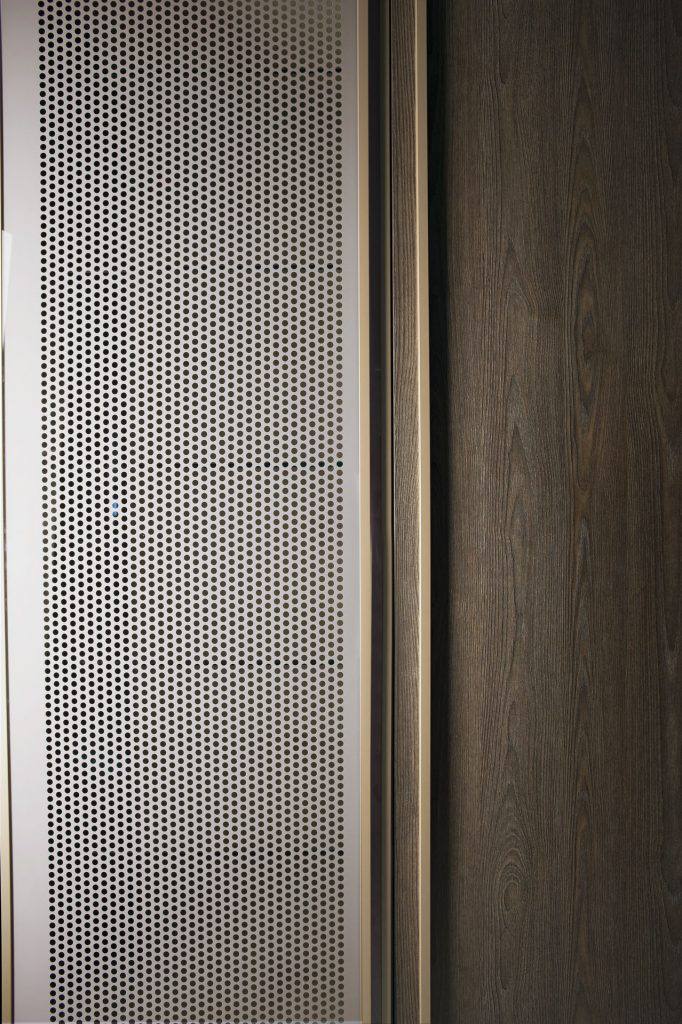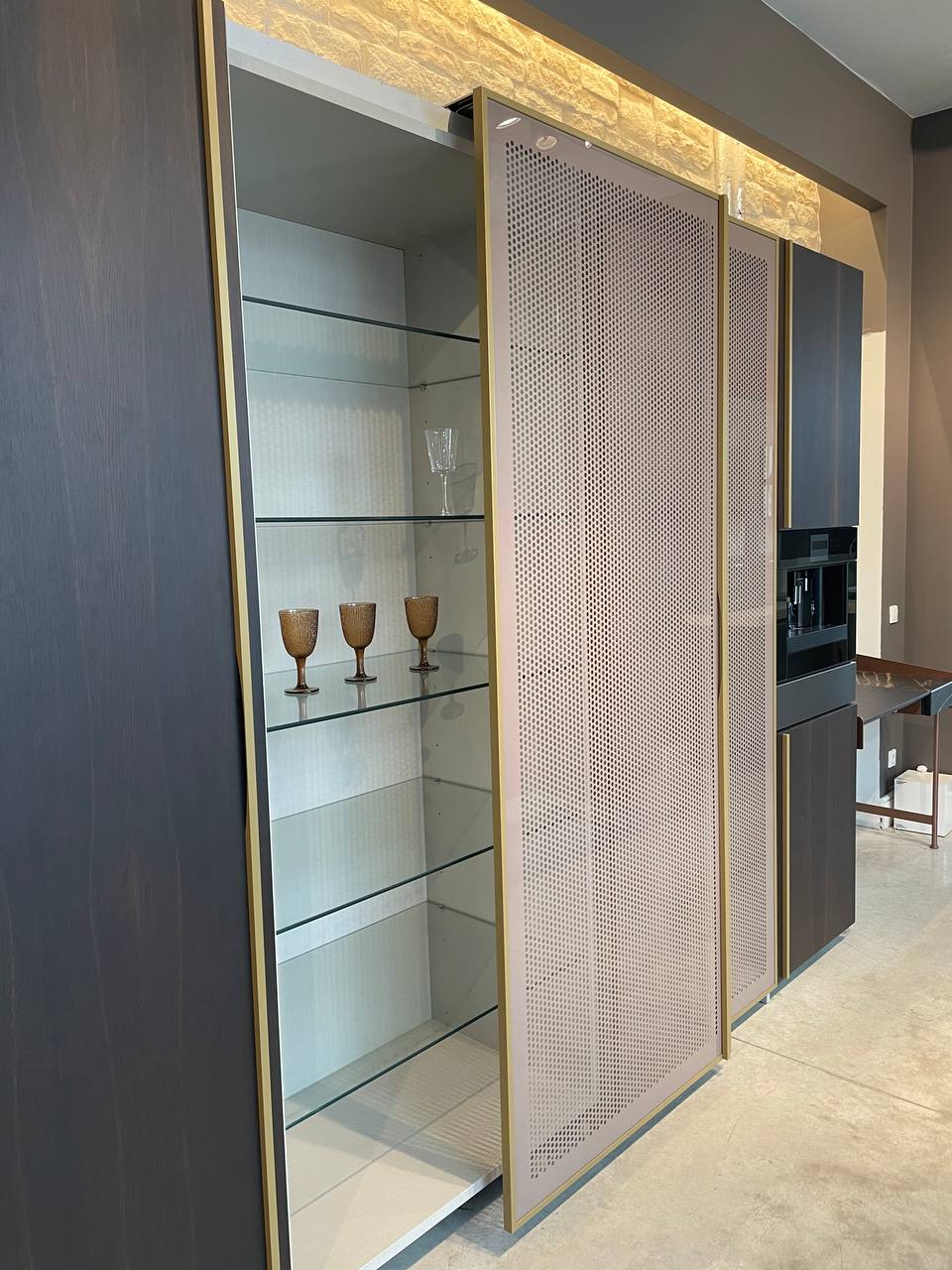 Композиция каждой кухни BELUGA строится на двух фундаментальных концепциях, первая – это добавление света в качестве четвертого измерения пространства, которая создает хроматический и материальный баланс между ритмичными линиями металлического каркаса, видимой и реальной прочностью двери из термообработанного дуба и плоскостями перфорированного листового металла – легкого элемента, который обеспечивает слияние со светом.