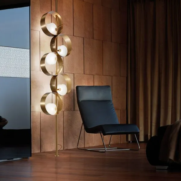 Благодаря своим асимметричным; на первый взгляд беспорядочно расположенным диффузорам; Masiero Sound производит впечатление легкости. Каждый из стеклянных диффузоров расположен в кольцевой раме; закрепленной на высокой вертикальной опоре светильника.