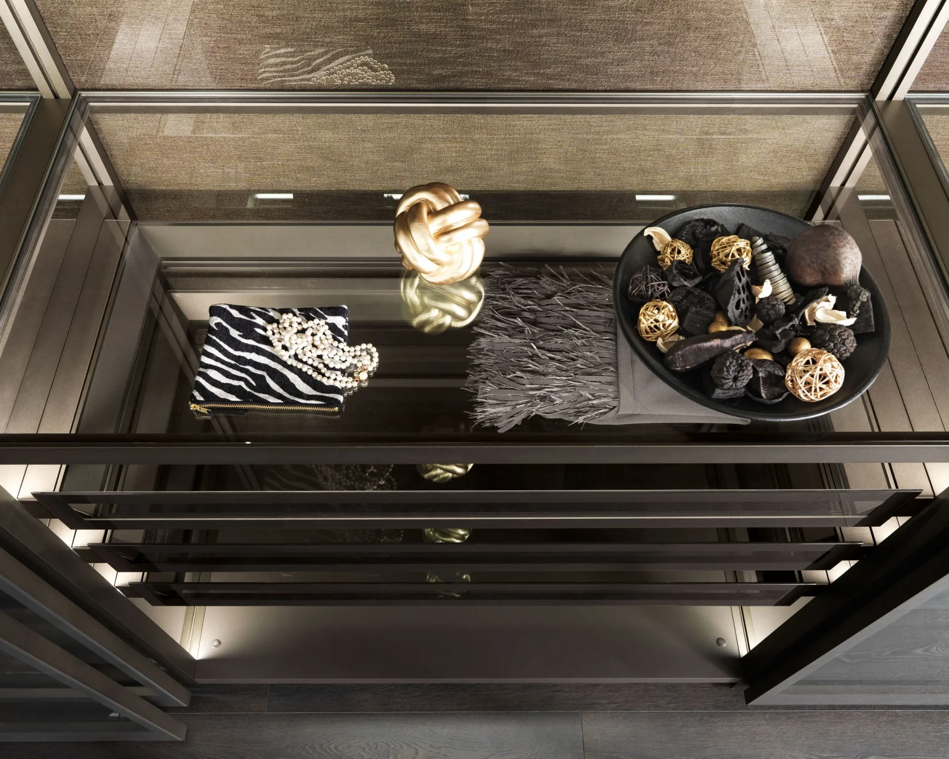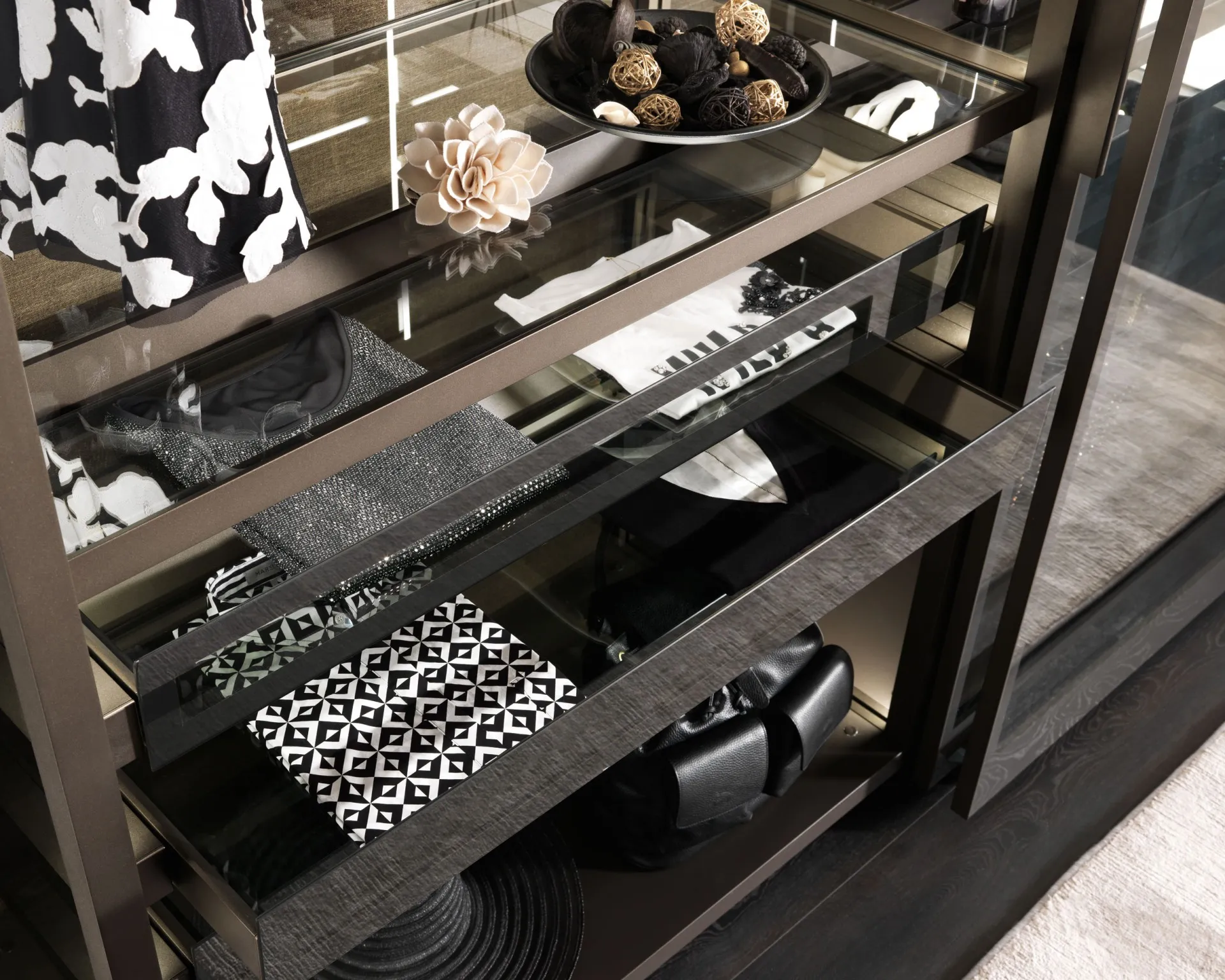 Элитная гардеробная Palo Alto сконструирована из металлического профиля и прозрачных стеклянных панелей. В комплекте присутствуют угловые; объединенные; пристенные секции.