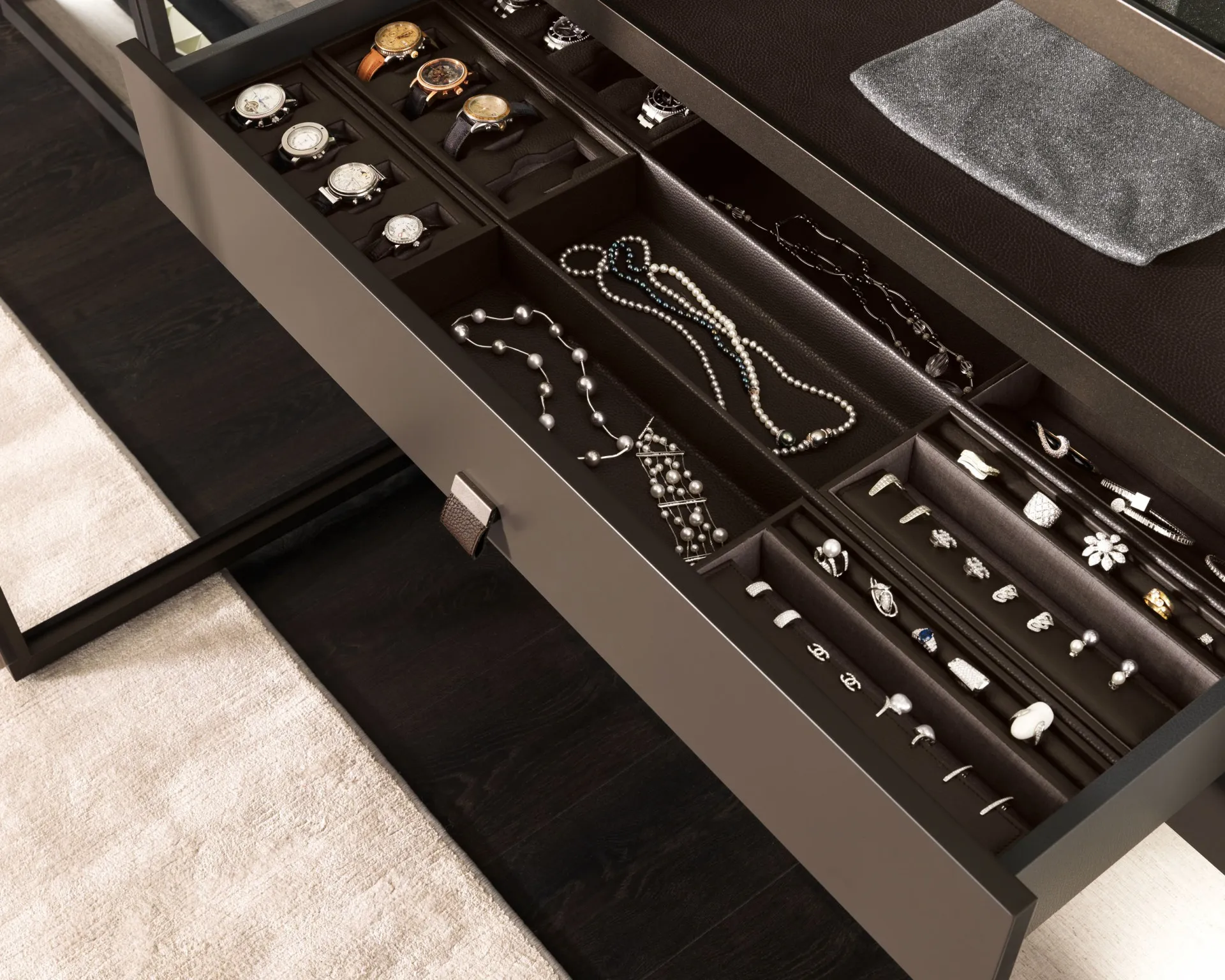 - специальными секциями для хранения ювелирных украшений;