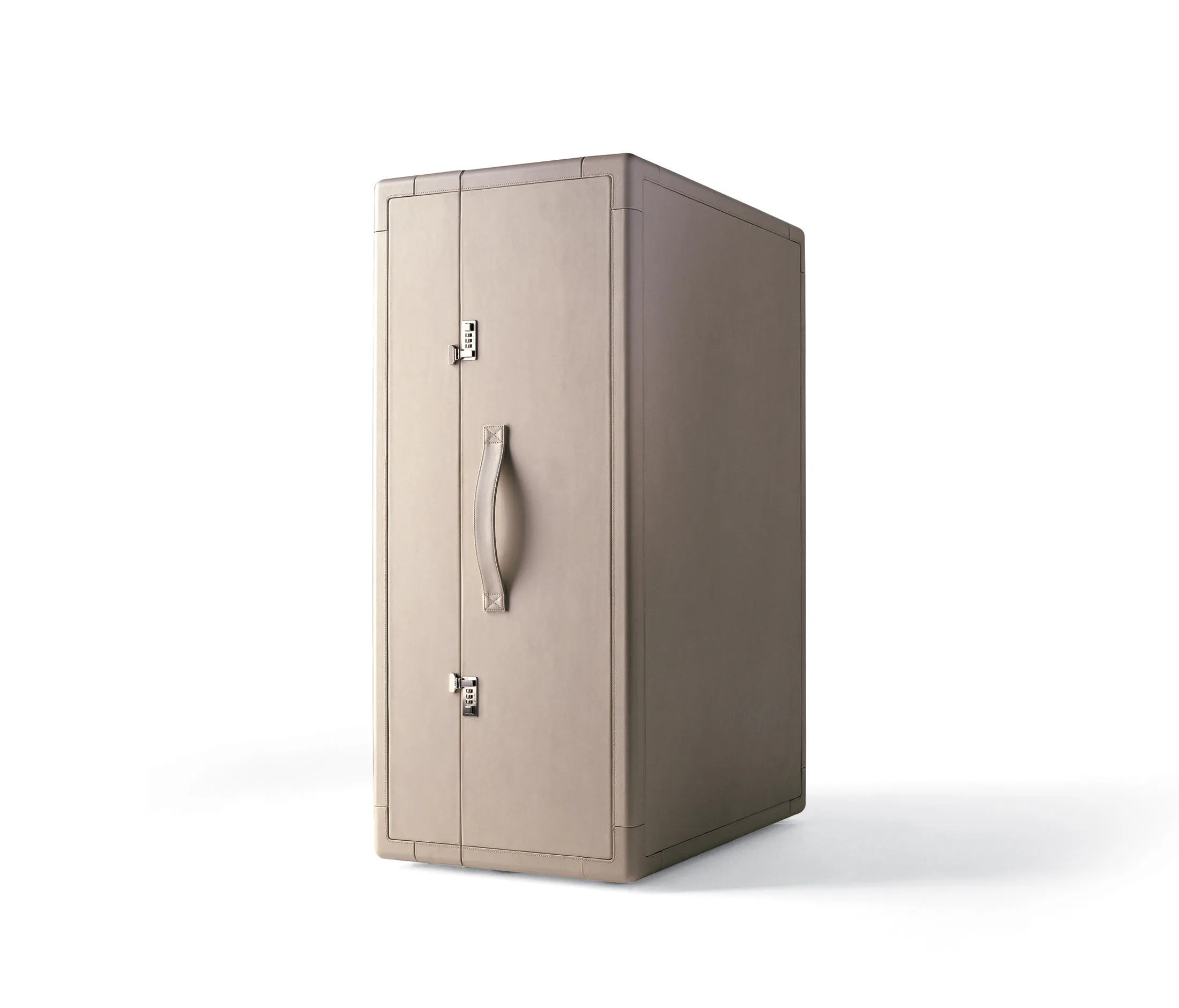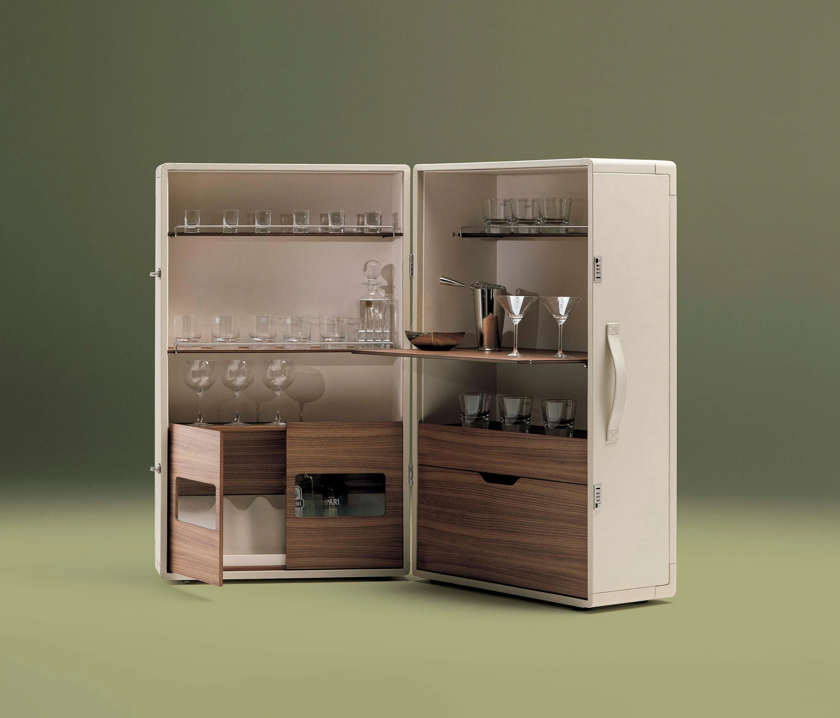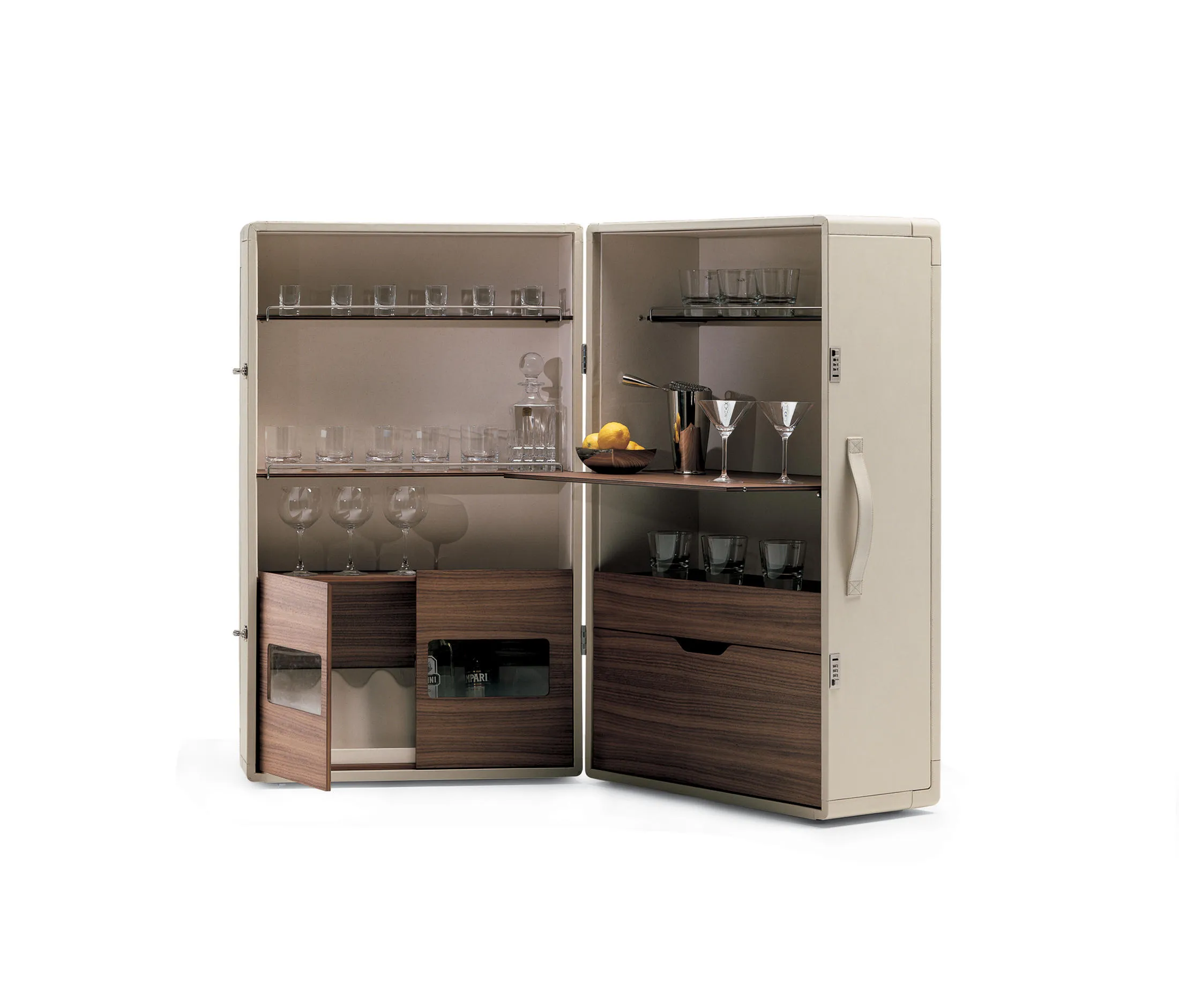 В доме вас ждет личная и дружелюбная атмосфера коктейль-бара. Бар для напитков становится символом стиля и атмосферы. В оригинальной версии дизайнера Jean-Marie Massaud это элегантный “чемодан” на колесах с внешней ручкой, кодовым замком и который открывается как книга. Драгоценный предмет интерьера, изготовленный из драгоценных материалов и безупречный до мельчайших деталей. Продуманная планировка внутреннего пространства включает держатели для бокалов и бутылок с металлическими кольцами, складная полка, которая может быть использована в качестве удобной рабочей поверхности. Наружное покрытие выполнено из кожи Saddle, а полки и ящики – из фанеры тополя, с декором под орех. Аксессуары из хромированного металла. Изысканная ткань украшает внутреннюю обивку мобильного бара.