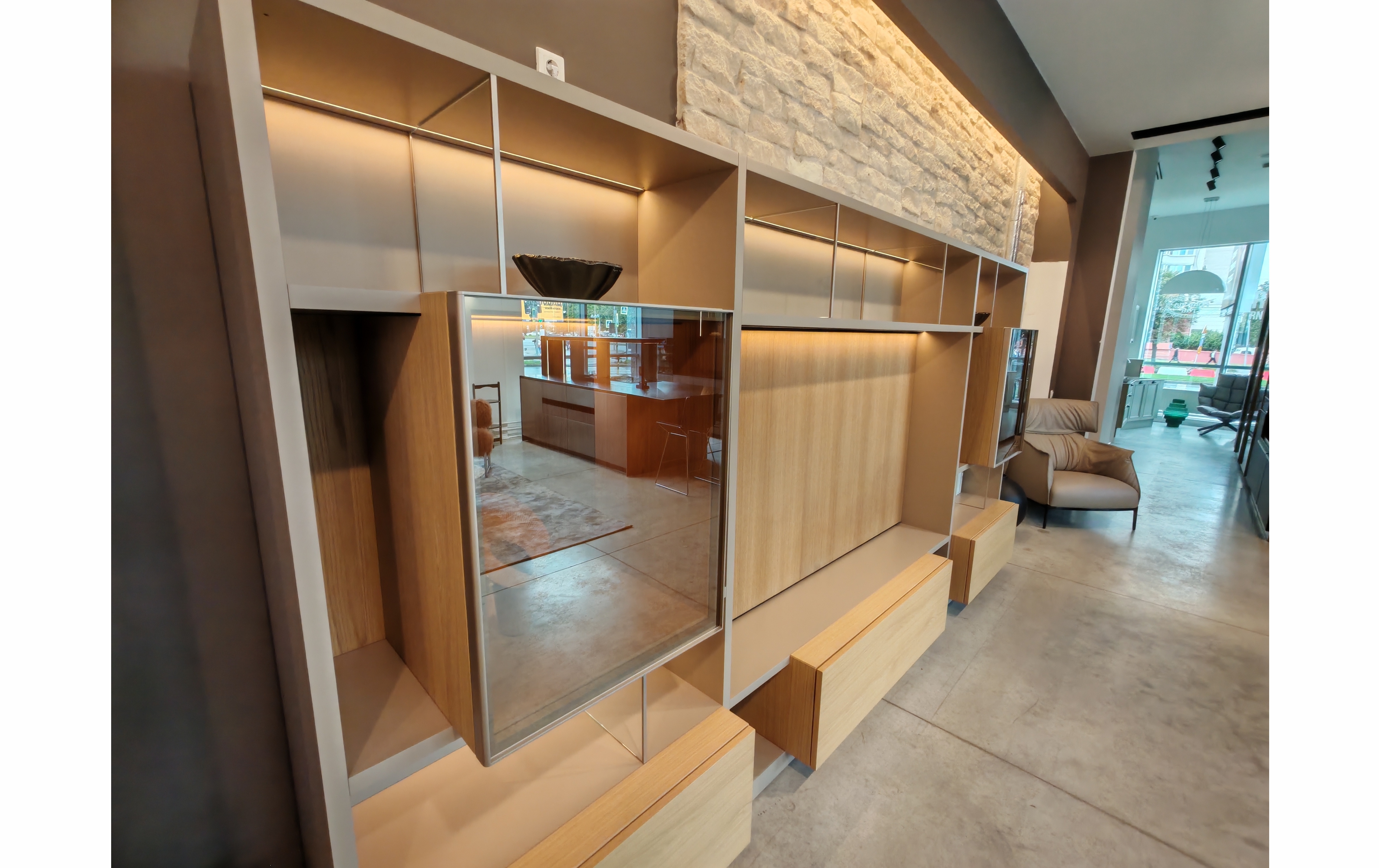 Система 505 Up, созданная с учетом индивидуальных предпочтений, выходит за рамки традиционных функций книжного шкафа. Примером тому служит инновационный выступающий шкаф Display, который повышает композиционную и стилистическую гибкость. Шкафы Display выполнены в шпоне светлого дуба. Дверца из закаленного стекла STOPSOL толщиной 5 мм. с объемной рамой из окрашенного экструдированного алюминия. Шкаф со стеклянной дверцей подсвечен встроенной, горизонтальной Led подсветкой. Выступающий элемент Display, так же представлен в нижней части композиции, как просторное место для хранения с откидной, деревянной дверью и удобными выдвижными ящиками.