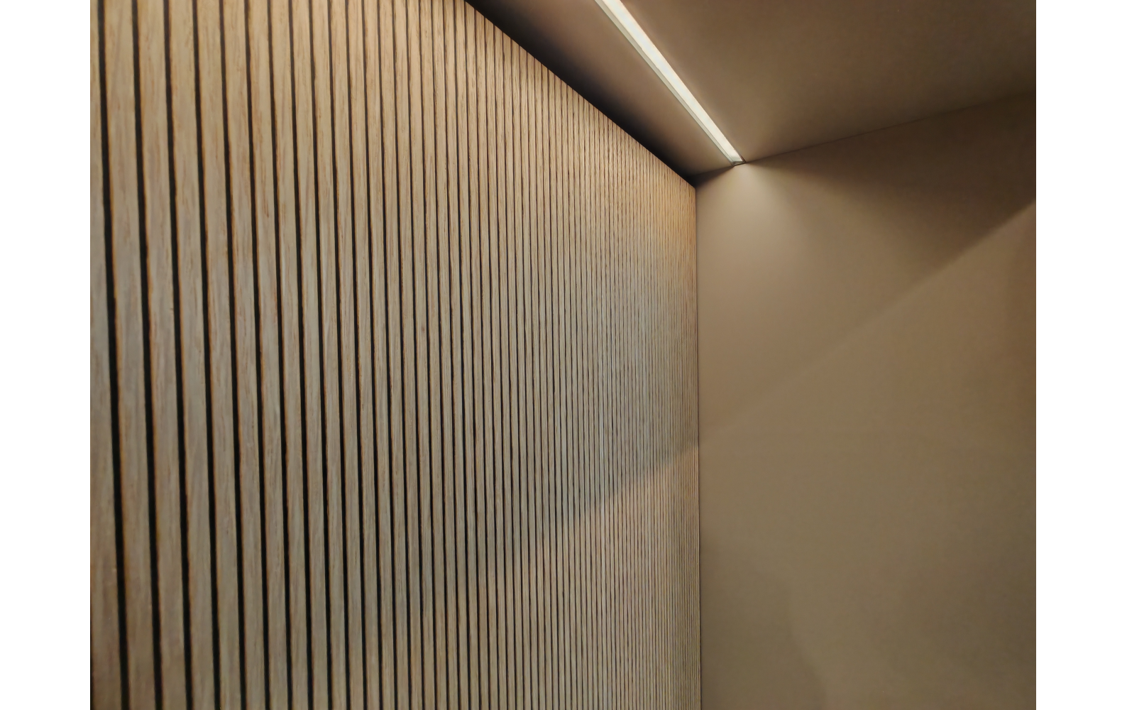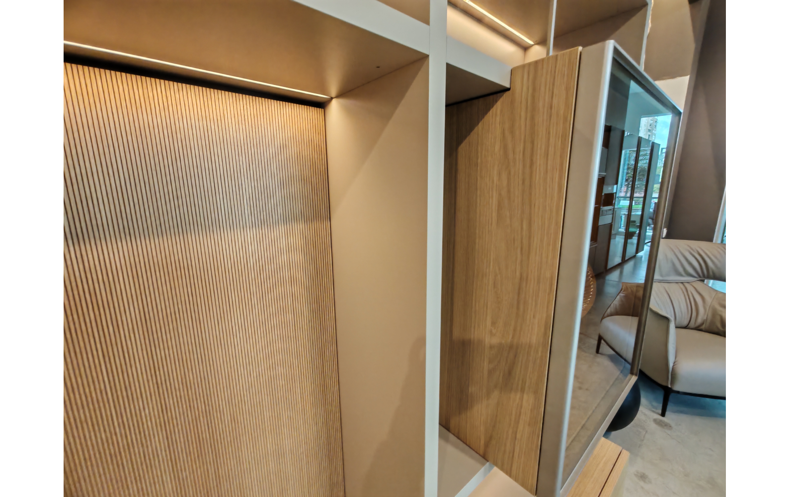 Функциональность системы 505 UP выходит за рамки традиционного книжного шкафа и превращает его в современный предмет мебели, который дополняет концепцию современного интерьера. Композиция состоит из двух симметричных модулей и центральной частью с эффектной, реечной панелью из дерева для ТВ зоны. Модули имеют усиленные полки в отделке матовый лак, цвет DUNE. Вертикальными разделителями служат стеклянные панели из закаленного стекла толщиной 8 мм с лицевым профилем из окрашенного экструдированного алюминия. Полки оснащены встроенной горизонтальной Led подсветкой.