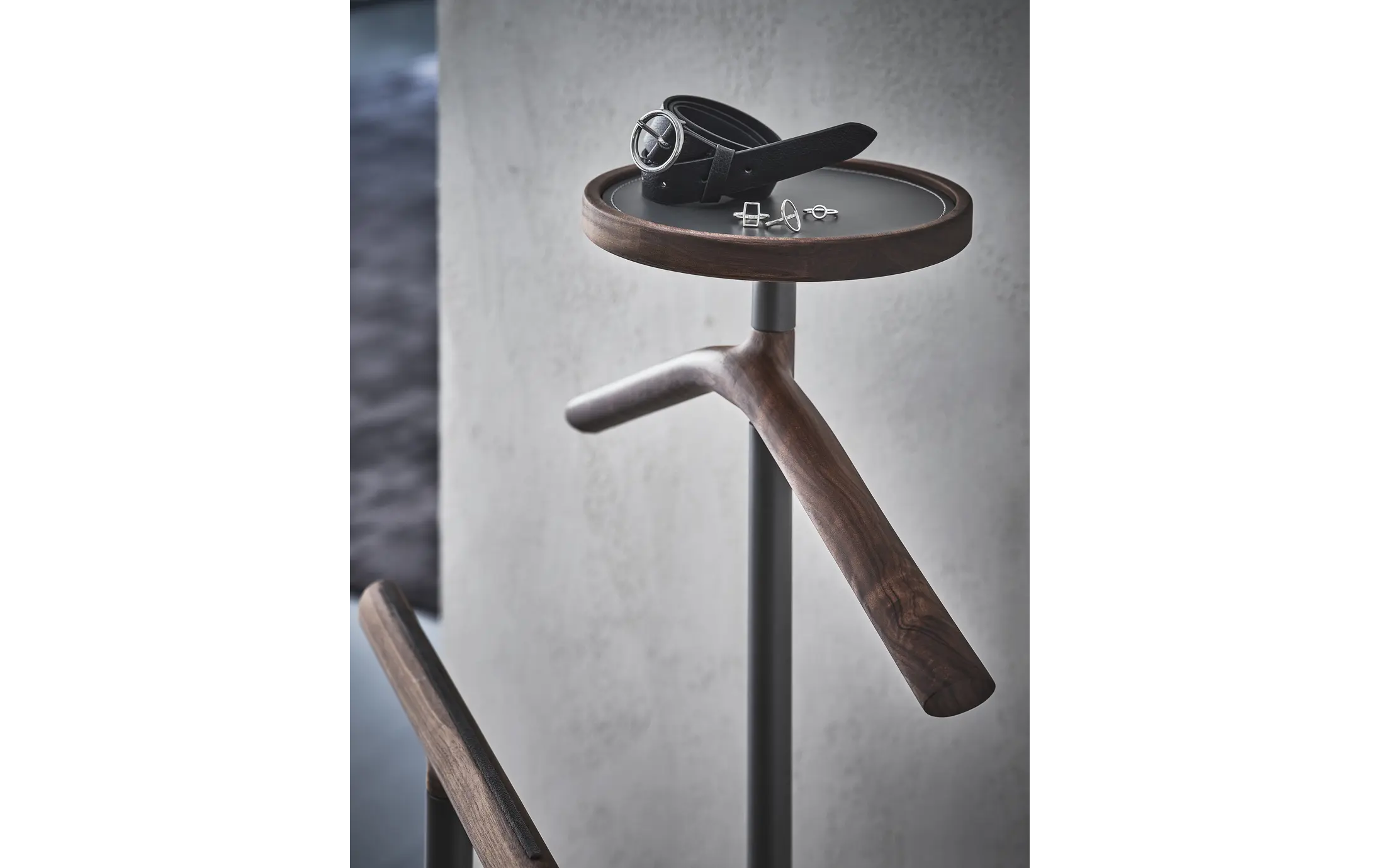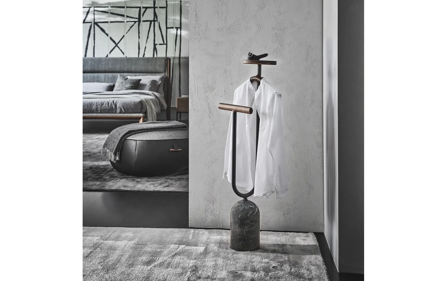 - Функциональные элементы: Вешалка для одежды, брюк с нескользящей серой микрофибровой вставкой и поднос, обтянутый темно-серой кожей.