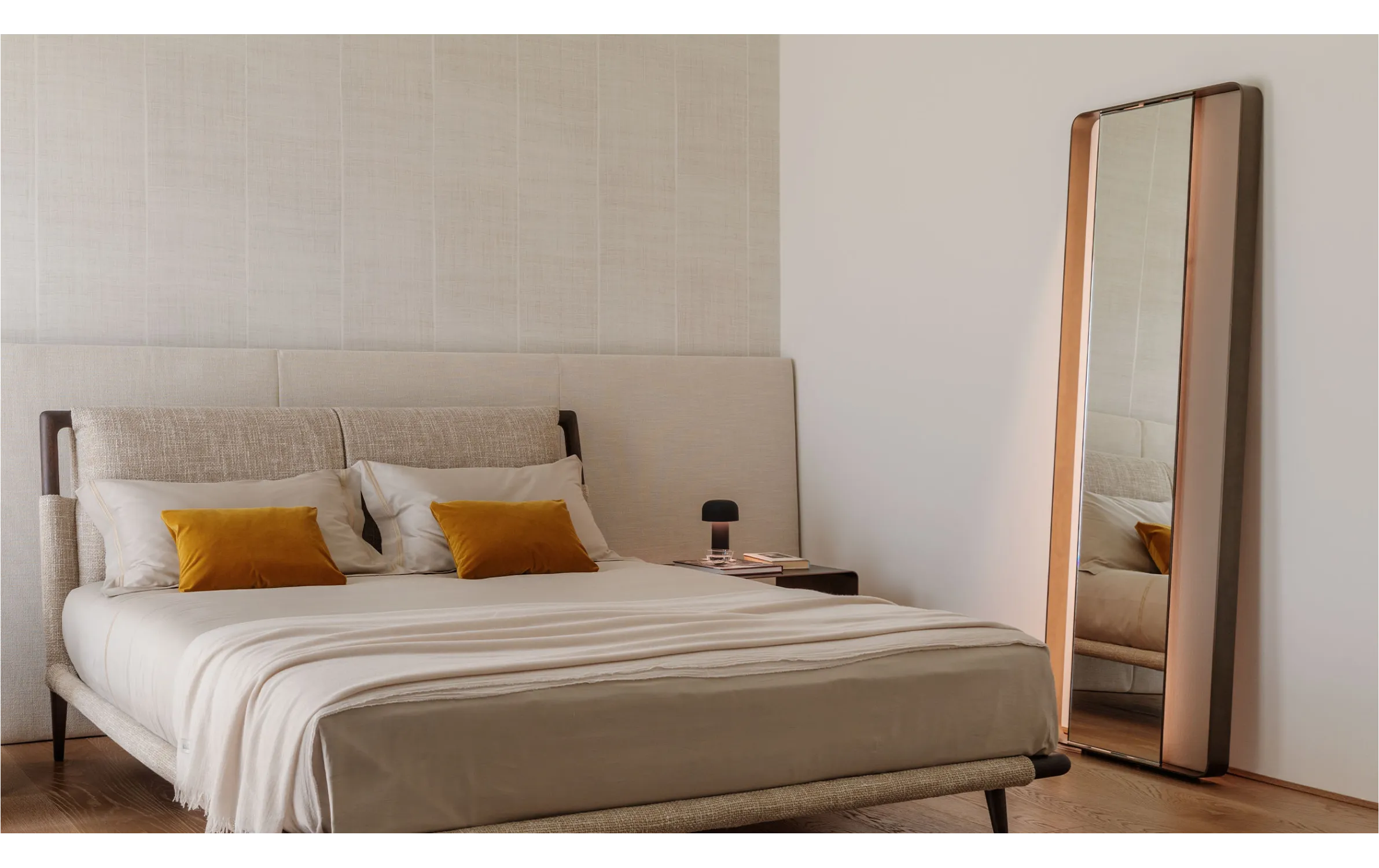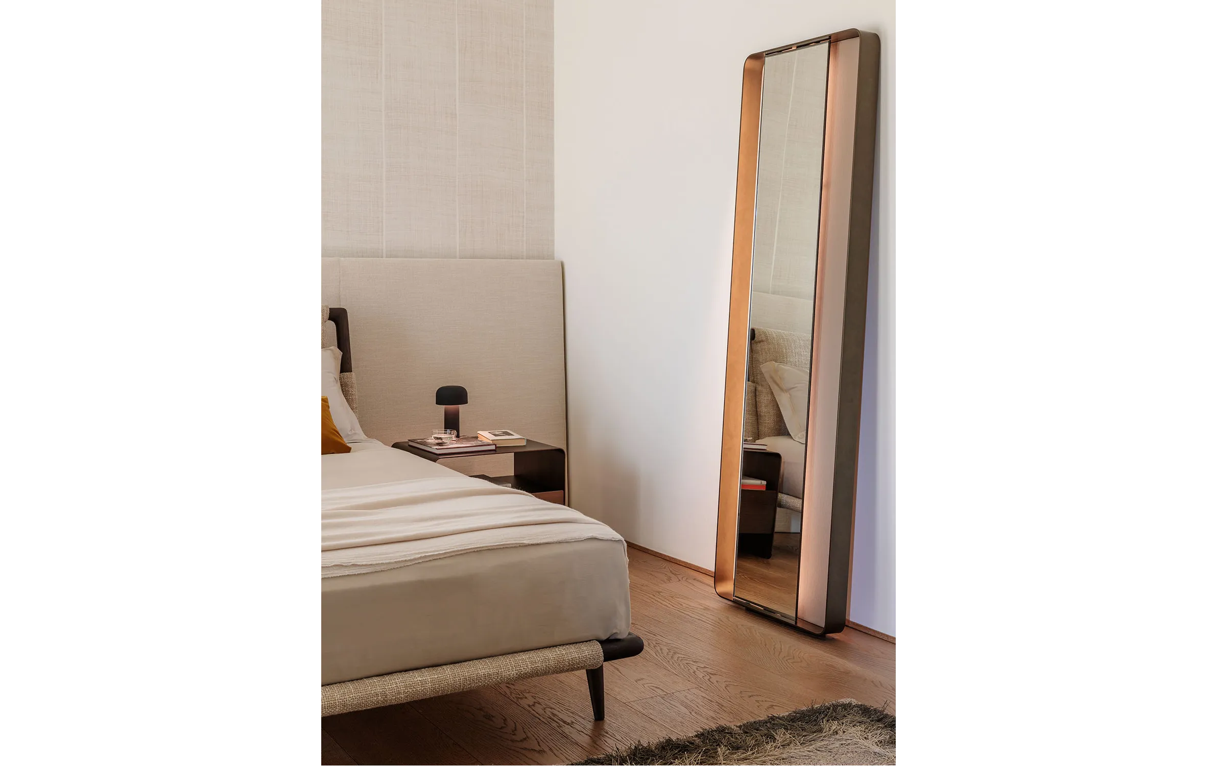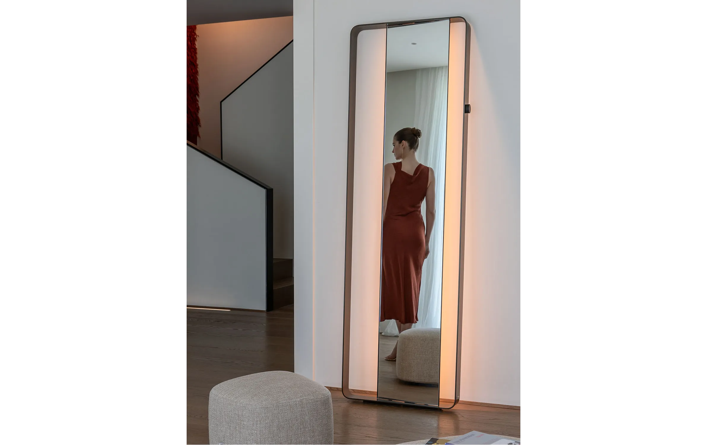 Bamboo от Natevo — это инновационное напольное зеркало, разработанное дизайнером Ilenia Viscardi в 2025 году, которое сочетает в себе практичность и эстетику. С одной стороны — полноразмерное зеркало для отражения интерьера, с другой — мягкий источник света с LED-подсветкой, создающий атмосферное освещение. Металлическая рама с частично вращающимся механизмом позволяет регулировать направление света и его интенсивность, идеально адаптируясь к любому пространству. Доступно в двух вариантах ширины (35 см и 60 см), с опцией обивки спинки тканью или кожей в более широкой модели для большей декоративности. Bamboo — идеальное решение для современных и классических интерьеров, где функциональность встречается с роскошью.
