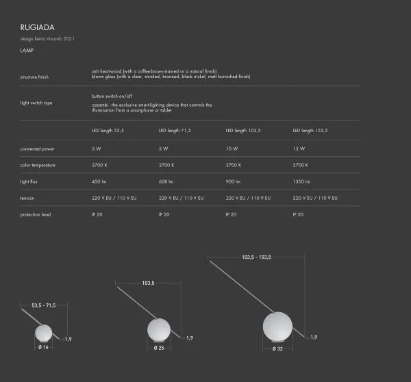 Светильник состоит из стержня со встроенными светодиодными лампами и доступен в 4 размерах (53,5 – 71,5 – 10,5 – 153,5 см); что позволяет использовать лампу для различных целей и освещать большой выбор помещений разной площади. Кольцевая металлическая опора для основания, покрытая черным пластиком.