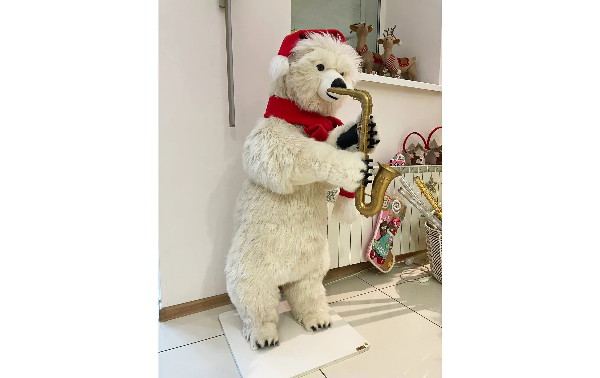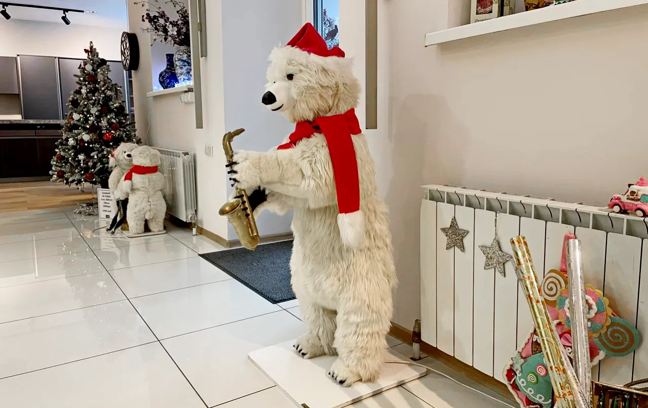 Белый медведь с саксофоном от GOODWILL — это премиальная анимированная новогодняя фигурка высотой около 120–130 см. Полярный медведь в красной шапке Санта-Клауса и шарфе играет на саксофоне с плавными движениями, добавляя живого джазового настроения вашему празднику. Мягкий белый мех, детализированное лицо и реалистичный инструмент делают эту движущуюся статуэтку ярким акцентом для прихожей, гостиной или под елкой.
