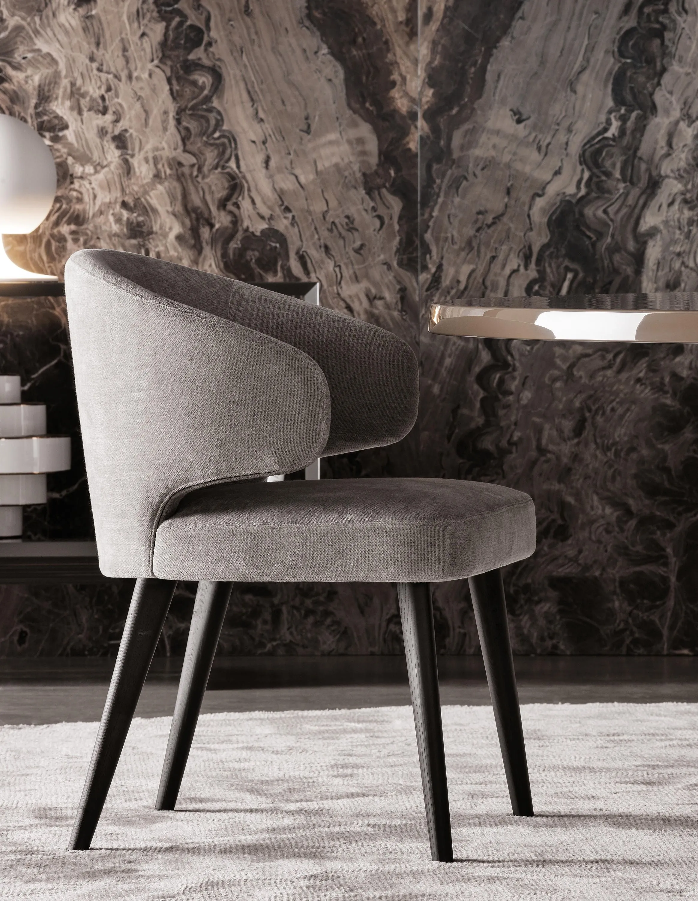 Aston Dining — это стул, который окутывает вас, приглашая ощутить присущую ему элегантность и комфорт. Мягкая мягкая конструкция опирается на конические ножки из массива ясеня с открытой морилкой Tobacco или лаковой отделкой Moka с открытыми порами. Aston Dining можно сочетать со всеми столами коллекции.